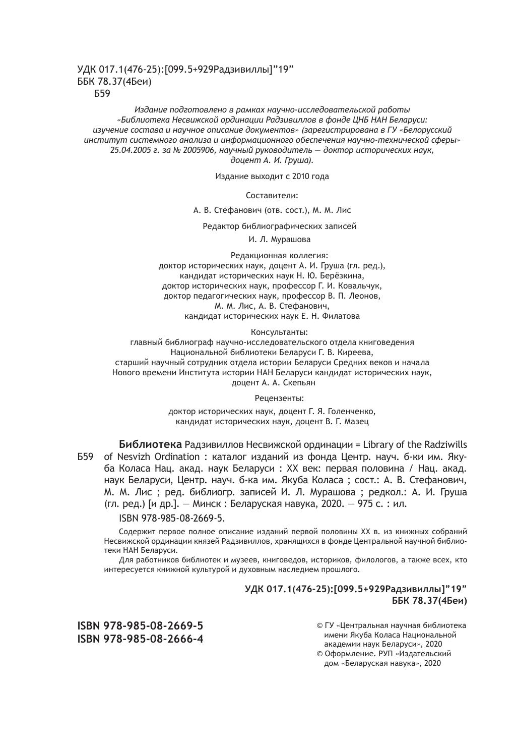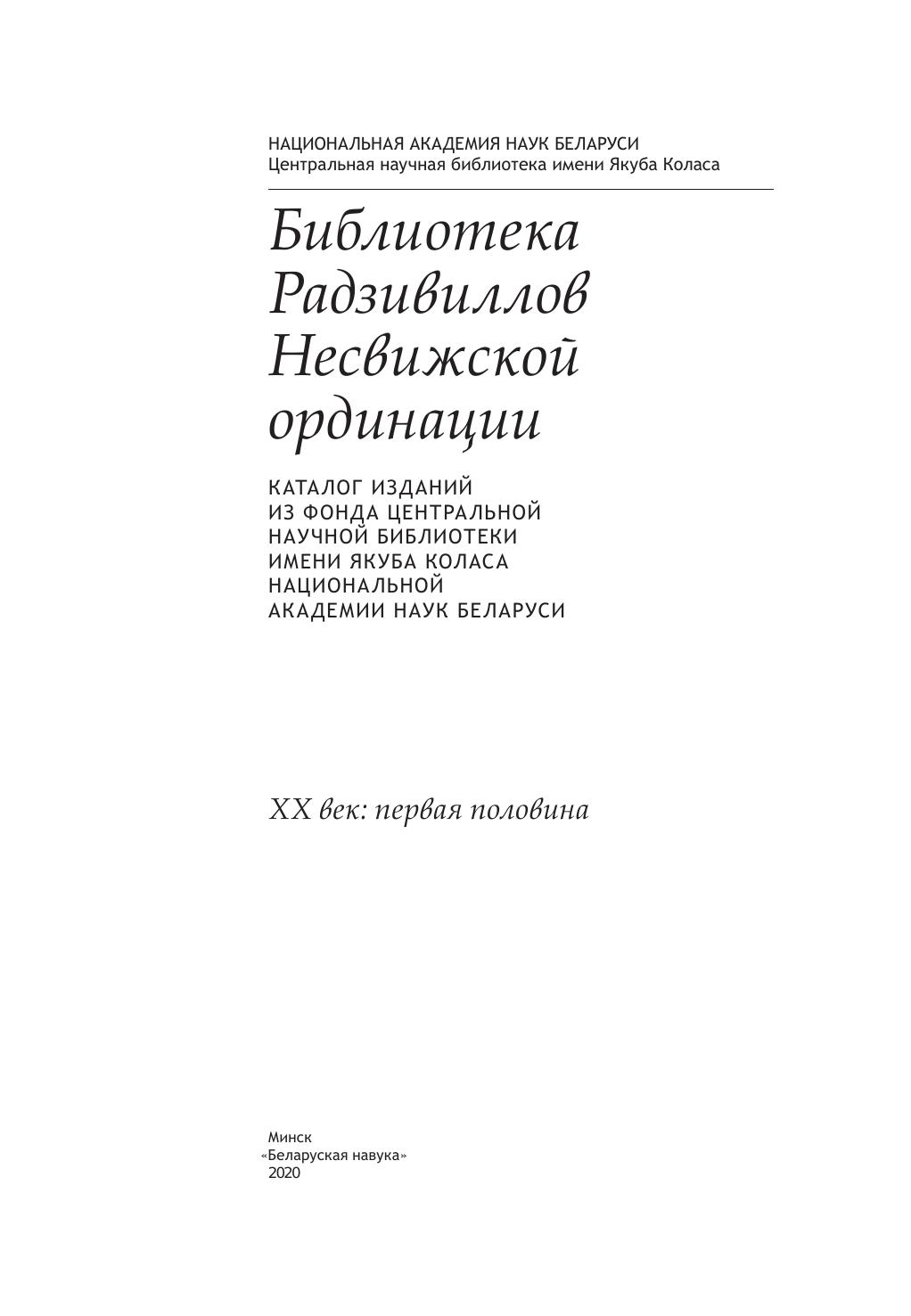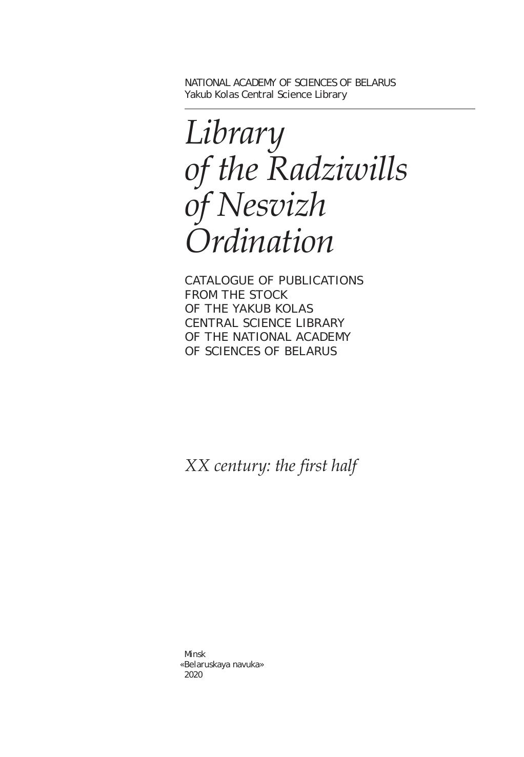Библиотека Радзивиллов Несвижской ординации = Library of the Radziwills of Nesvizh Ordination: каталог изданий из фонда Центр. науч. б-ки им. Якуба Коласа Нац. акад. наук Беларуси: XX век: первая половина