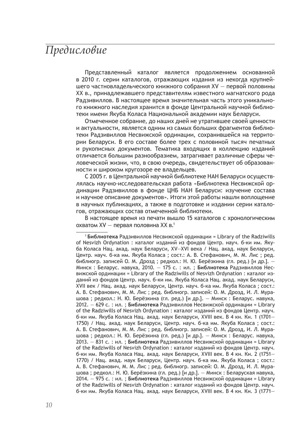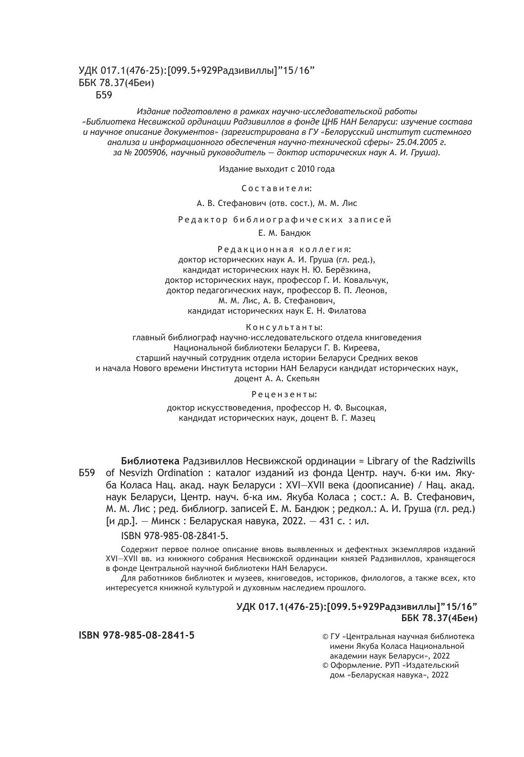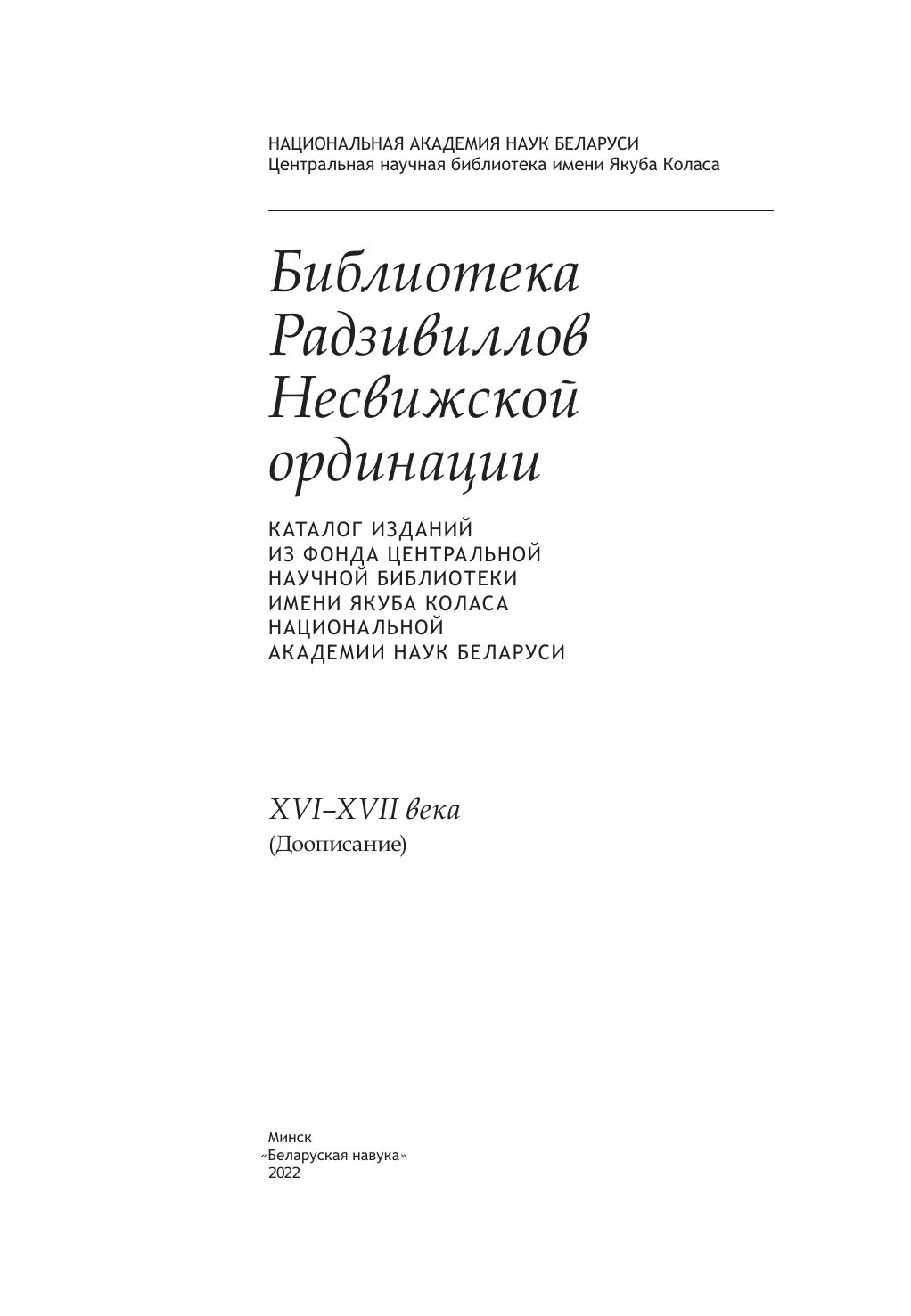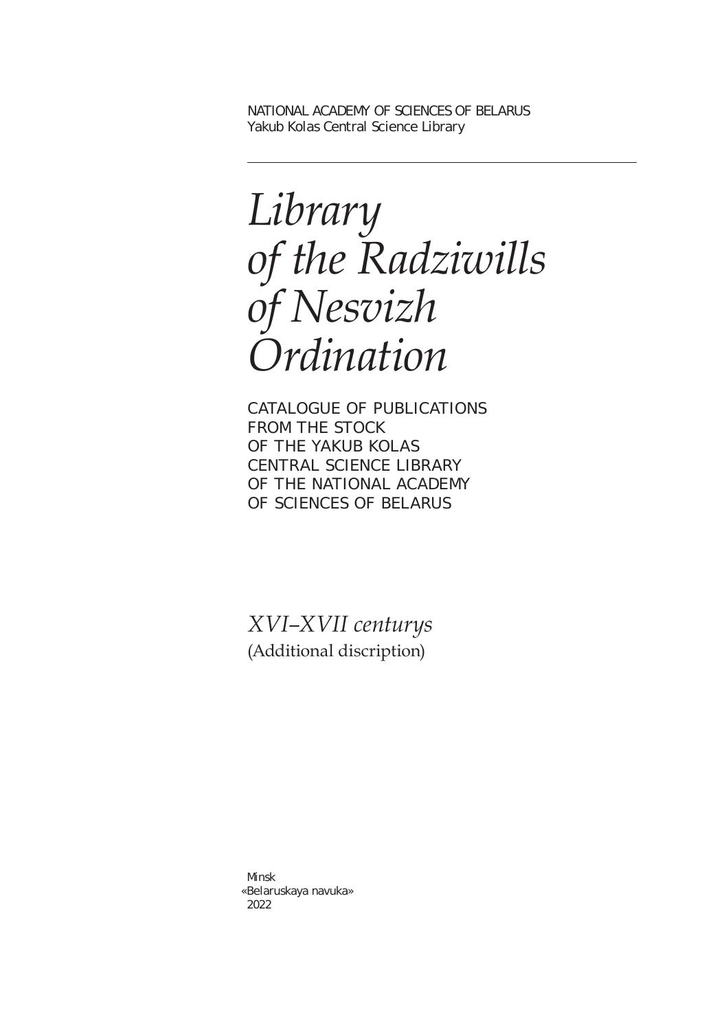 Библиотека Радзивиллов Несвижской ординации = Library of the Radziwills of Nesvizh Ordination: каталог изданий из фонда Центр. науч. б-ки им. Якуба Коласа Нац. акад. наук Беларуси: XVI—XVII века (доописание)
