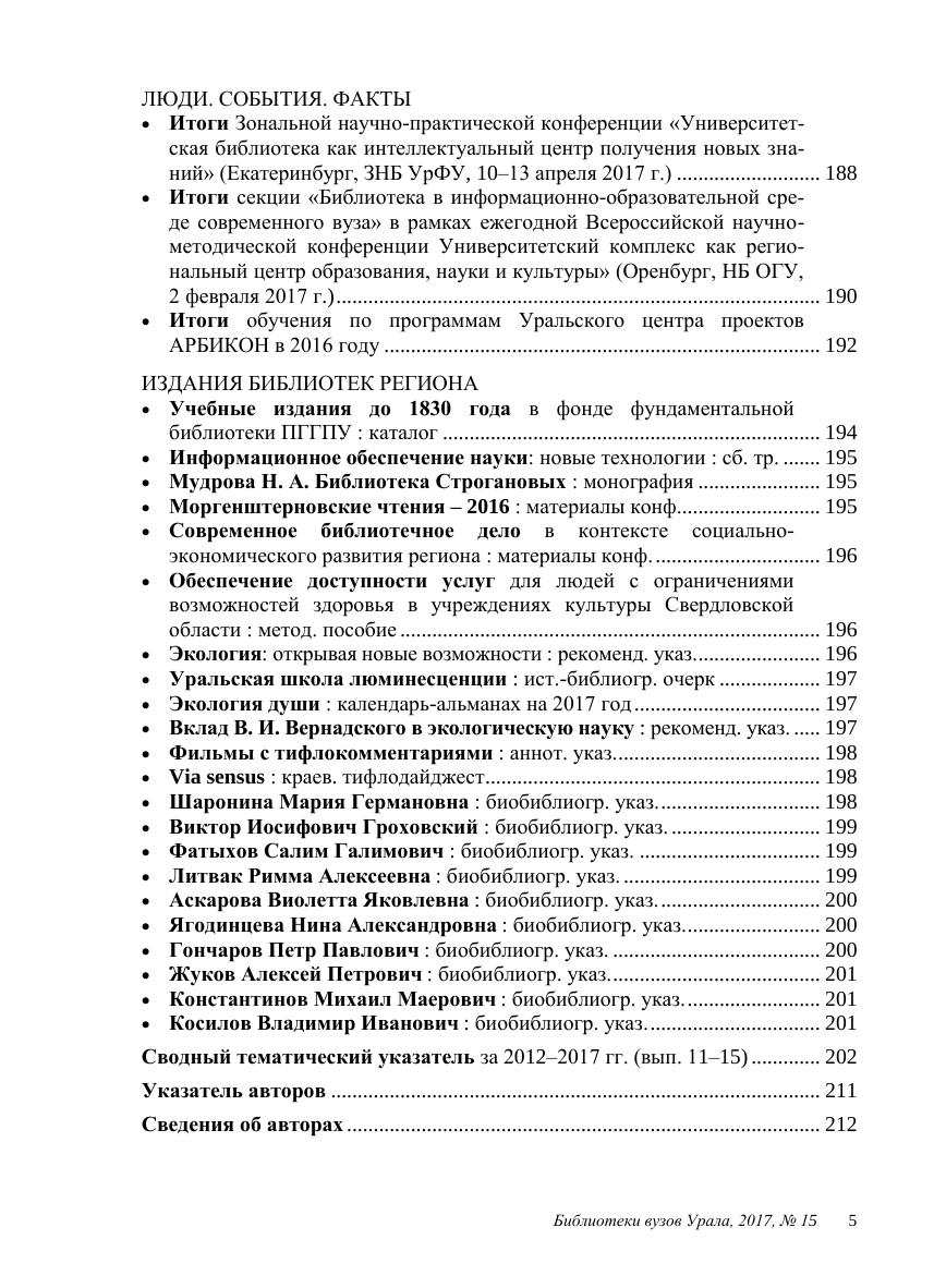 Научно-практический сборник издается с 2002 г. Зональной научной библиотекой Уральского федерального университета имени первого Президента России Б. Н. Ельцина по материалам научно-исследовательской и практической деятельности библиотек высших учебных заведений Уральского региона. Данный выпуск включает в том числе материалы Зональной научно-практической конференции «Университетская библиотека как интеллектуальный центр получения новых знаний», которая проводилась 10–13 апреля 2017 г. в Екатеринбурге. Содержит вспомогательные указатели (тематический и авторов) к вып. 11–15 за 2012–2017 гг. Адресуется специалистам, студентам и всем заинтересованным читателям.