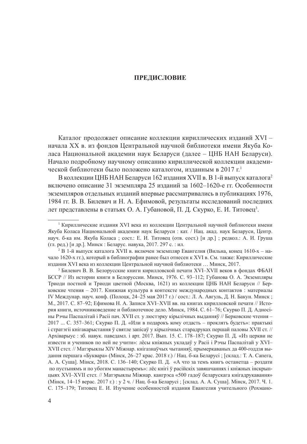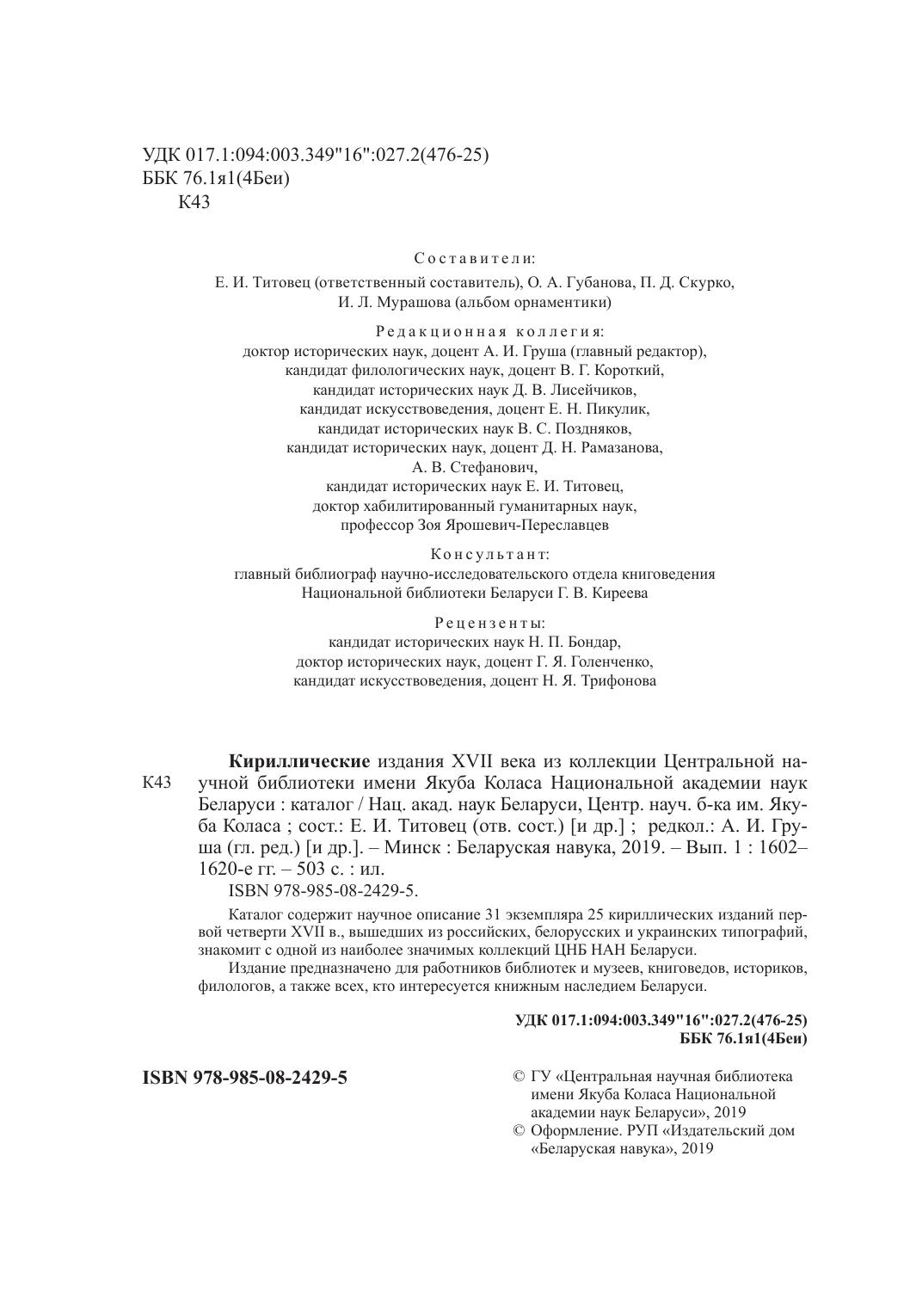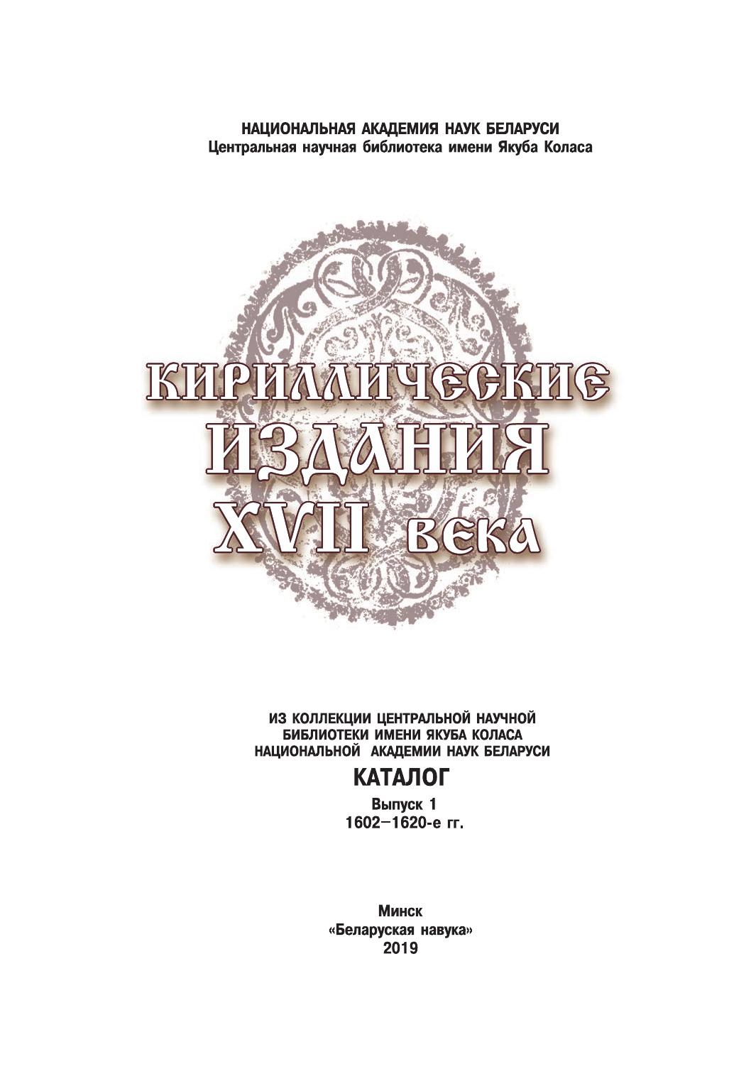 Каталог содержит научное описание 31 экземпляра 25 кириллических изданий первой четверти XVII в., вышедших из российских, белорусских и украинских типографий, знакомит с одной из наиболее значимых коллекций ЦНБ НАН Беларуси. Издание предназначено для работников библиотек и музеев, книговедов, историков, филологов, а также всех, кто интересуется книжным наследием Беларуси.