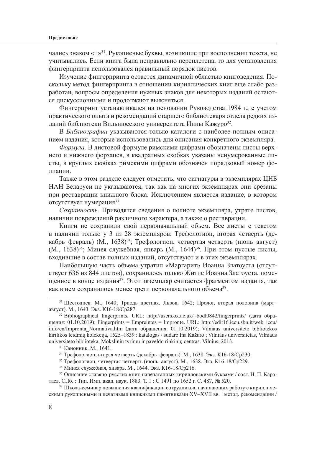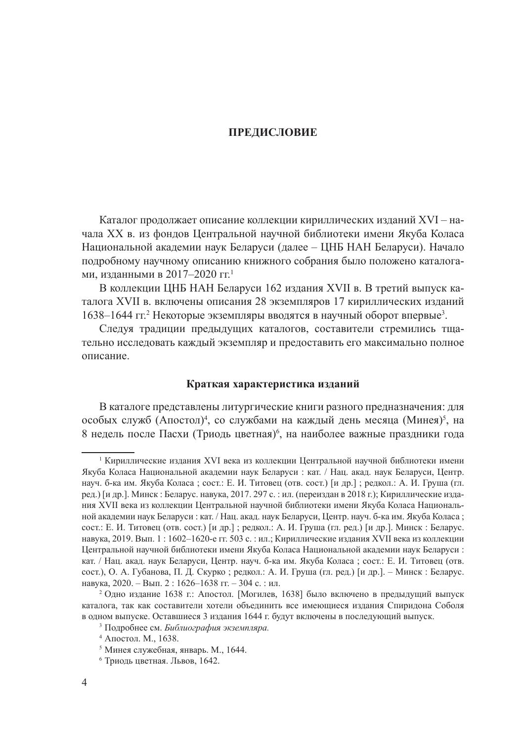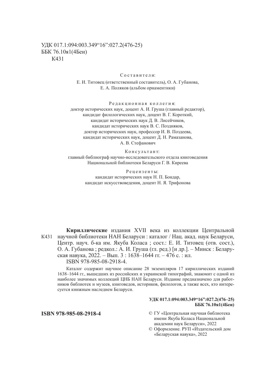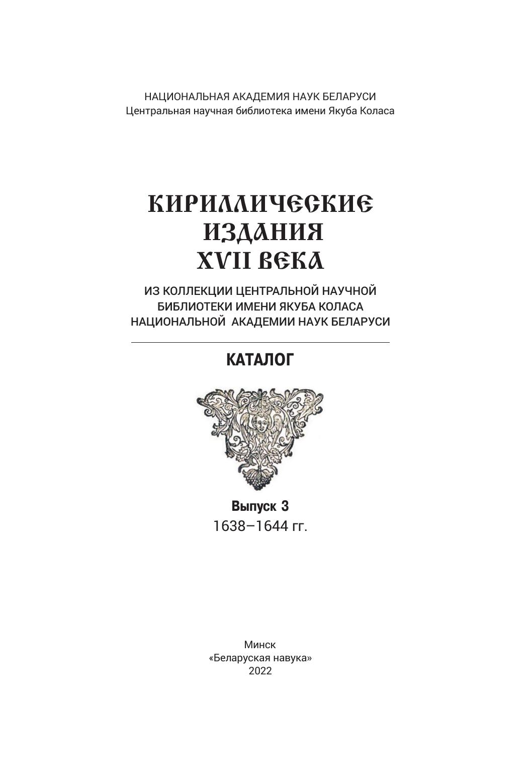 Каталог содержит научное описание 28 экземпляров 17 кириллических изданий 1638–1644 гг., вышедших из российских и украинской типографий, знакомит с одной из наиболее значимых коллекций ЦНБ НАН Беларуси. Издание предназначено для работ-