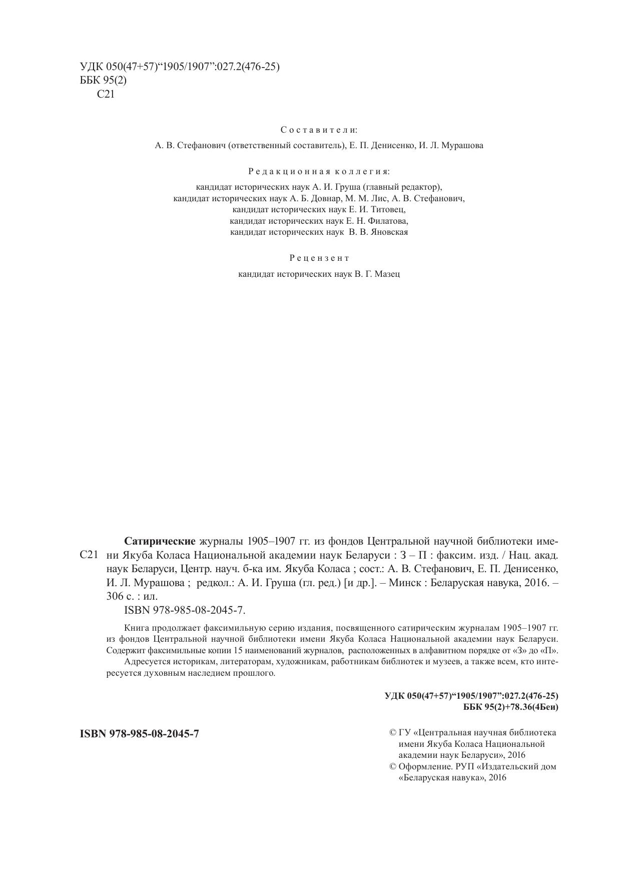 Книга продолжает факсимильную серию издания, посвященного сатирическим журналам 1905–1907 гг. из фондов Центральной научной библиотеки имени Якуба Коласа Национальной академии наук Беларуси. Содержит факсимильные копии 15 наименований журналов, расположенных в алфавитном порядке от «З» до «П». Адресуется историкам, литераторам, художникам, работникам библиотек и музеев, а также всем, кто интересуется духовным наследием прошлого.