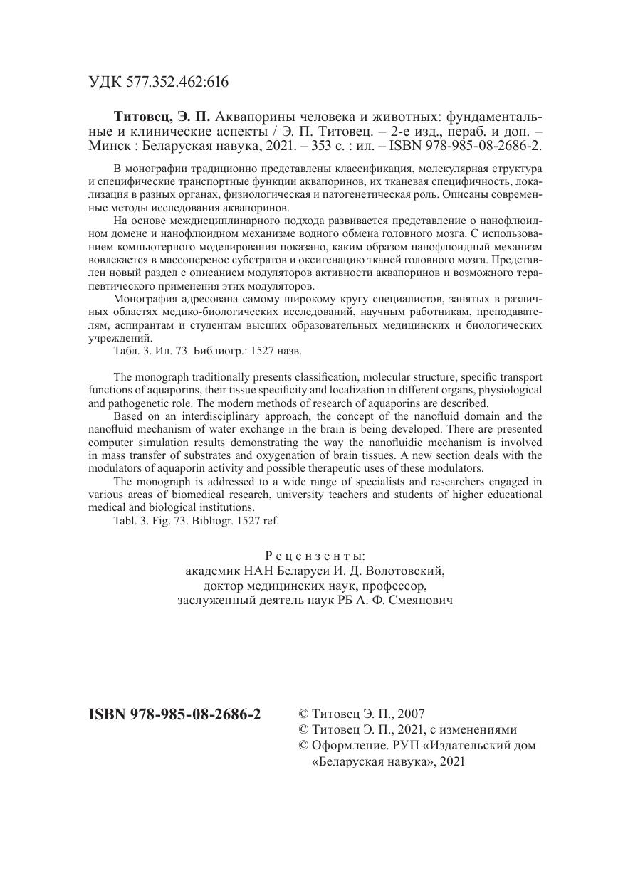 В монографии традиционно представлены классификация, молекулярная структура и специфические транспортные функции аквапоринов, их тканевая специфичность, локализация в разных органах, физиологическая и патогенетическая роль. Описаны современные методы исследования аквапоринов.