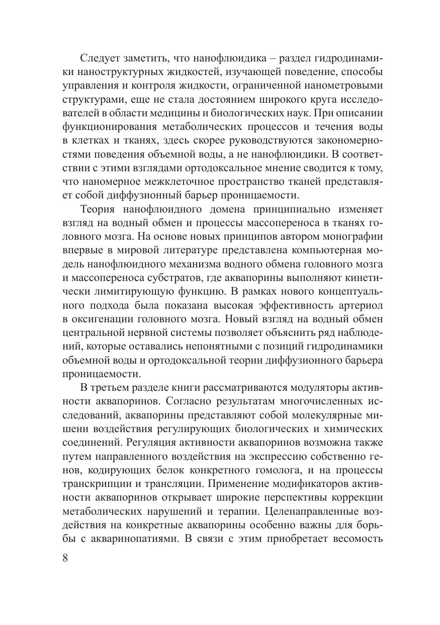 На основе междисциплинарного подхода развивается представление о нанофлюидном домене и нанофлюидном механизме водного обмена головного мозга. С использованием компьютерного моделирования показано, каким образом нанофлюидный механизм вовлекается в массоперенос субстратов и оксигенацию тканей головного мозга. Представлен новый раздел с описанием модуляторов активности аквапоринов и возможного терапевтического применения этих модуляторов.