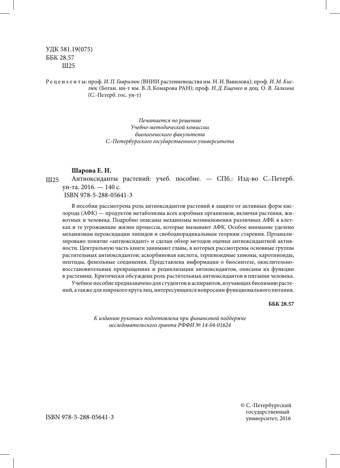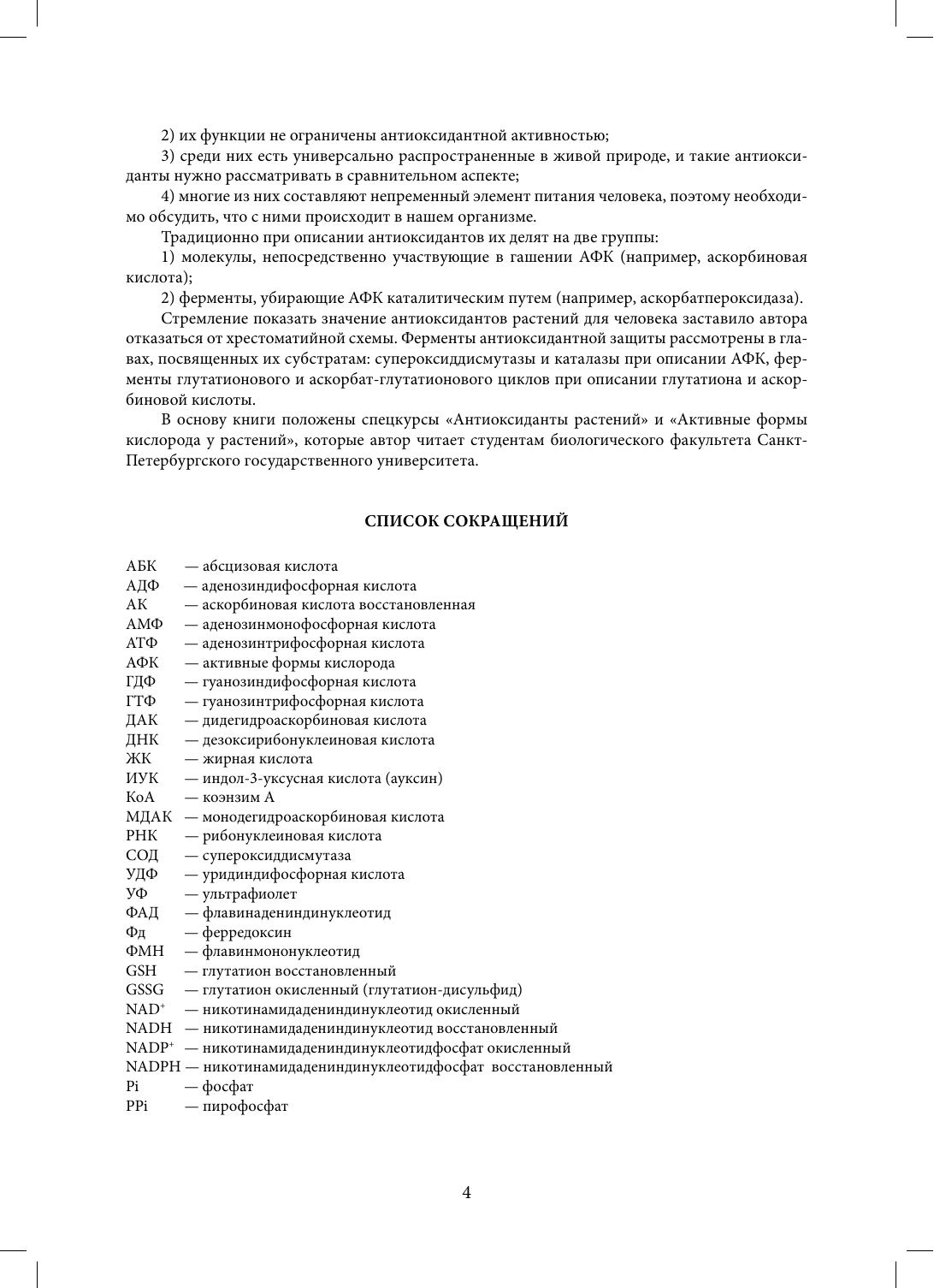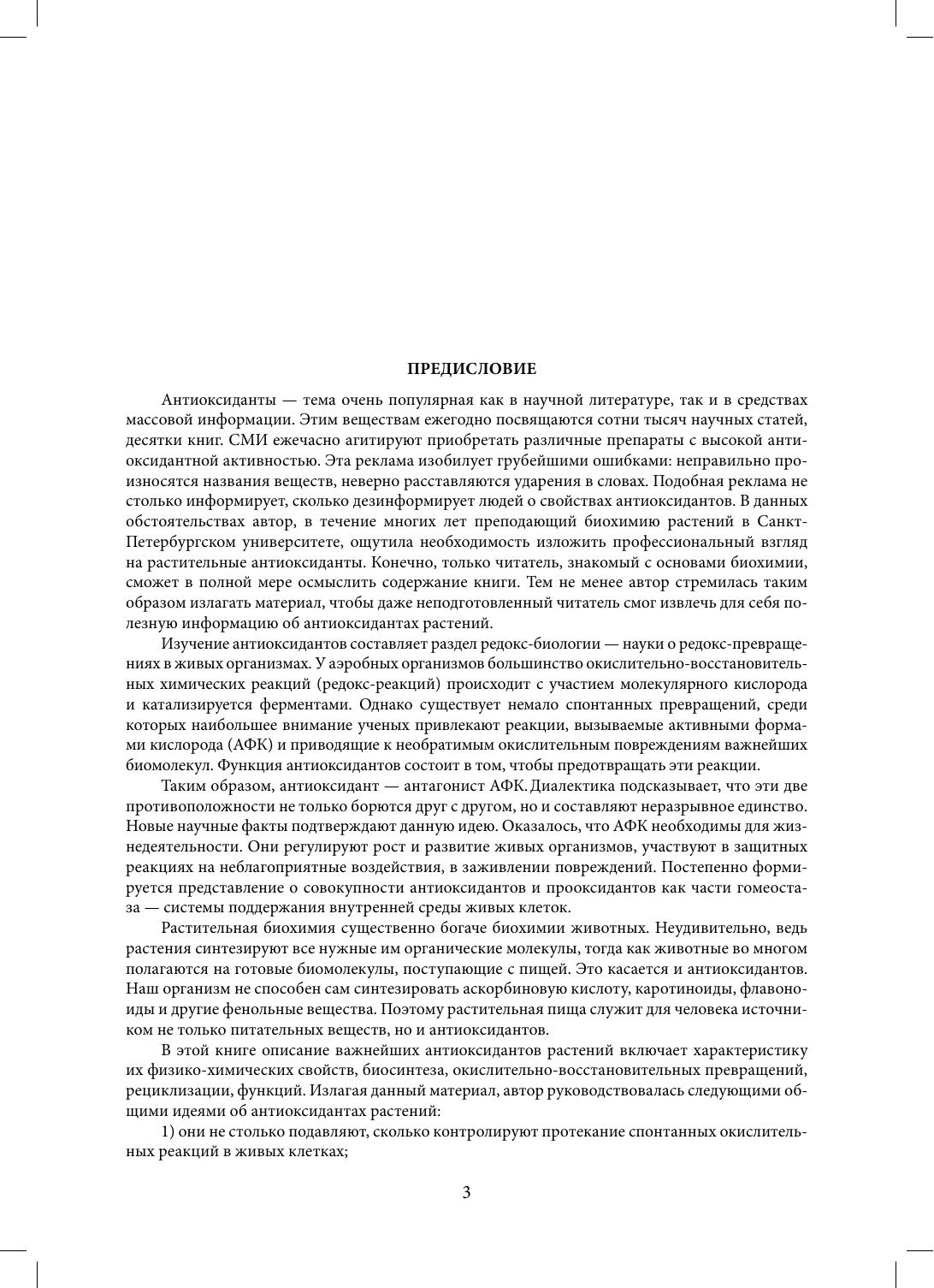 В пособии рассмотрена роль антиоксидантов растений в защите от активных форм кислорода (АФК) — продуктов метаболизма всех аэробных организмов, включая растения, животных и человека. Подробно описаны механизмы возникновения различных АФК в клетках и те угрожающие жизни процессы, которые вызывают АФК. Особое внимание уделено механизмам пероксидации липидов и свободнорадикальным теориям старения. Проанализировано понятие «антиоксидант» и сделан обзор методов оценки антиоксидантной активности. Центральную часть книги занимают главы, в которых рассмотрены основные группы растительных антиоксидантов: аскорбиновая кислота, терпеноидные хиноны, каротиноиды, пептиды, фенольные соединения. Представлена информация о биосинтезе, окислительно-восстановительных превращениях и рециклизации антиоксидантов, описаны их функции в растениях. Критически обсуждена роль растительных антиоксидантов в питании человека. Учебное пособие предназначено для студентов и аспирантов, изучающих биохимию растений, а также для широкого круга лиц, интересующихся вопросами функционального питания.