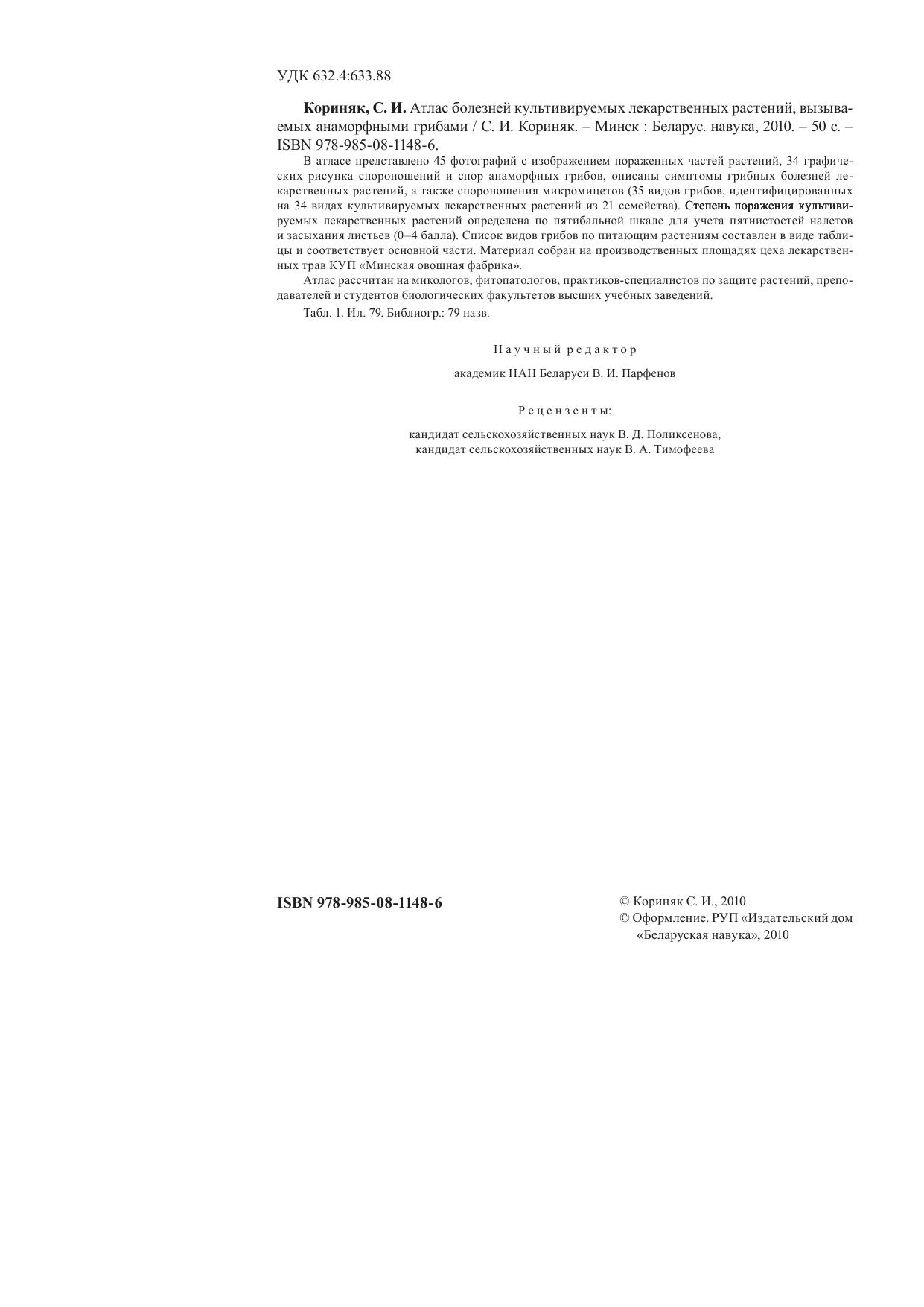 В атласе представлено 45 фотографий с изображением пораженных частей растений, 34 графических рисунка спороношений и спор анаморфных грибов, описаны симптомы грибных болезней лекарственных растений, а также спороношения микромицетов (35 видов грибов, идентифицированных на 34 видах культивируемых лекарственных растений из 21 семейства). Степень поражения культивируемых лекарственных растений определена по пятибальной шкале для учета пятнистостей налетов и засыхания листьев (0–4 балла). Список видов грибов по питающим растениям составлен в виде таблицы и соответствует основной части. Материал собран на производственных площадях цеха лекарственных трав КУП «Минская овощная фабрика». Атлас рассчитан на микологов, фитопатологов, практиков-специалистов по защите растений, преподавателей и студентов биологических факультетов высших учебных заведений.