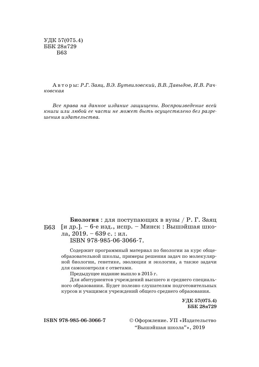 Содержит программный материал по биологии за курс общеобразовательной школы, примеры решения задач по молекулярной биологии, генетике, эволюции и экологии, а также задачи для самоконтроля с ответами. Предыдущее издание вышло в 2015 г. Для абитуриентов учреждений высшего и среднего специального образования. Будет полезно слушателям подготовительных курсов и учащимся учреждений общего среднего образования.