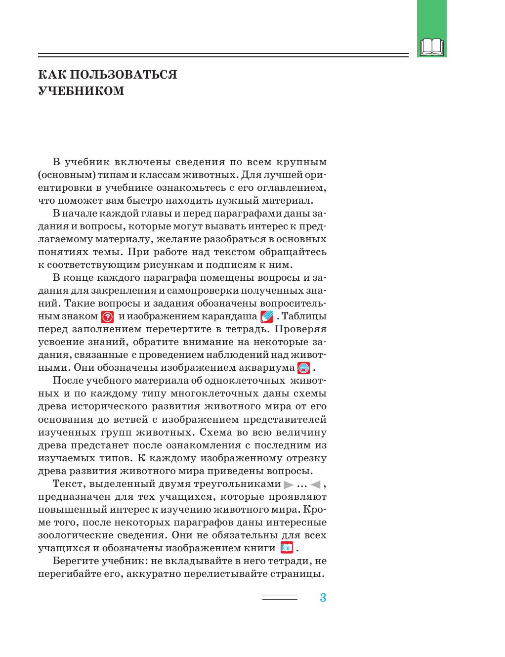 Учебник написан в соответствии с обязательным минимумом содержания биологического образования и требований к уровню подготовки учащихся основной (базовой) школы. Он содержит материал по всем основным типам и классам животных. Особое внимание уделено ознакомлению с многообразием и единством животного мира, жизненными отправлениями, усложнением организации в процессе исторического развития, приспособлениями к средам жизни и конкретным местообитаниям, выяснению родственных отношений животных изучаемых типов и их происхождения.