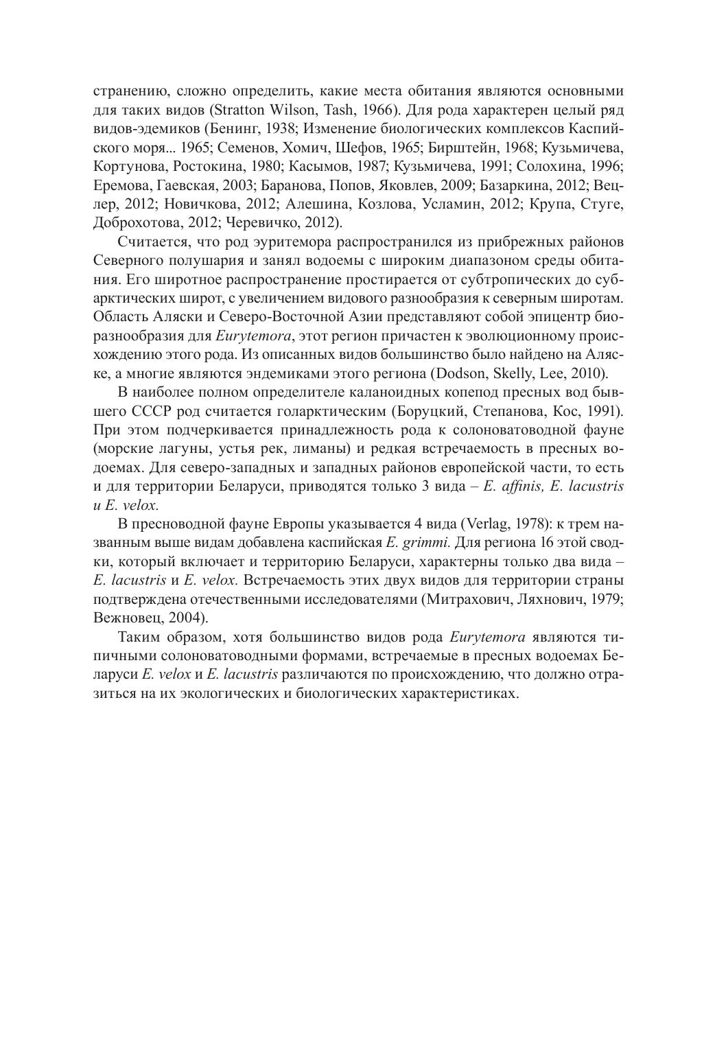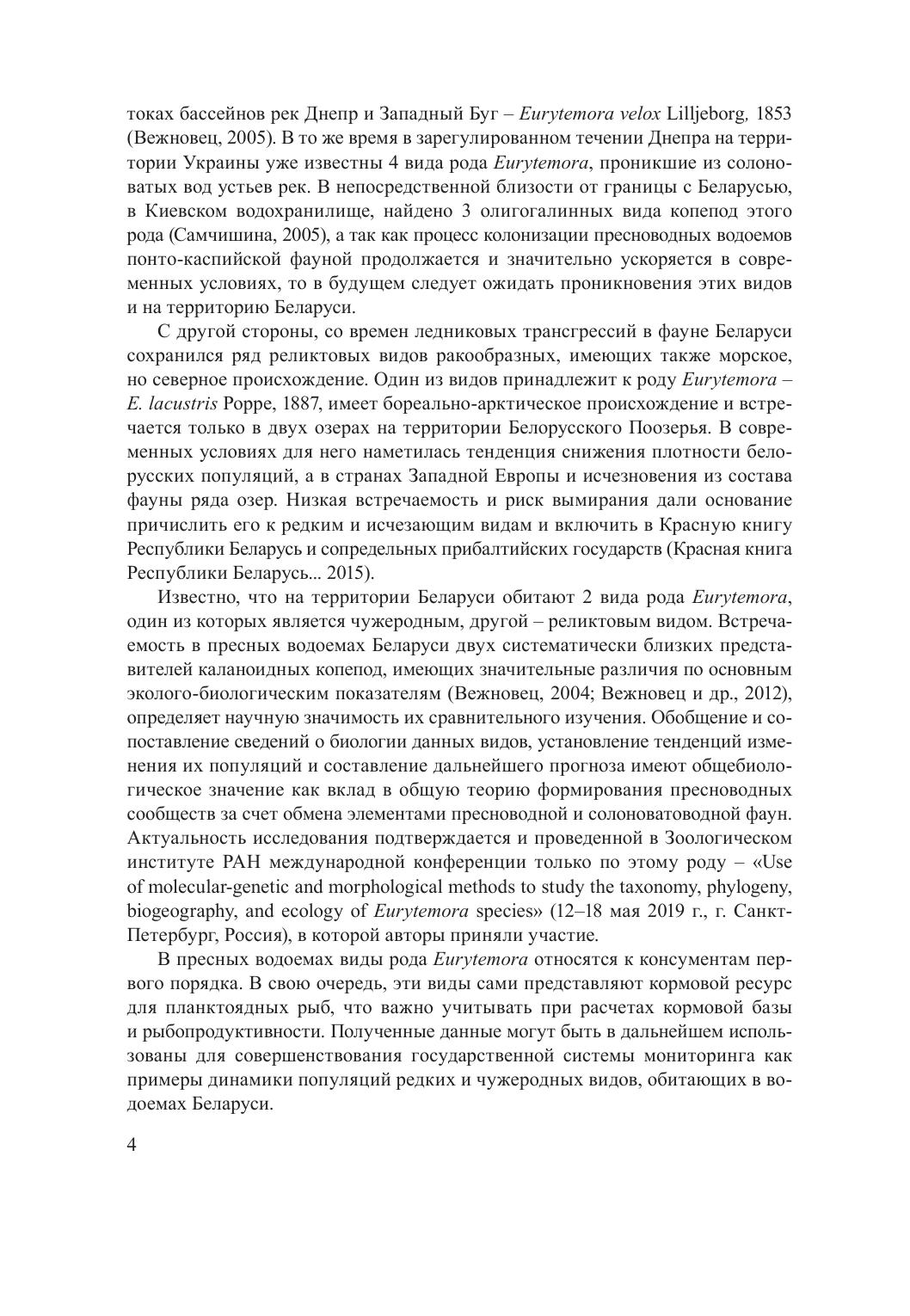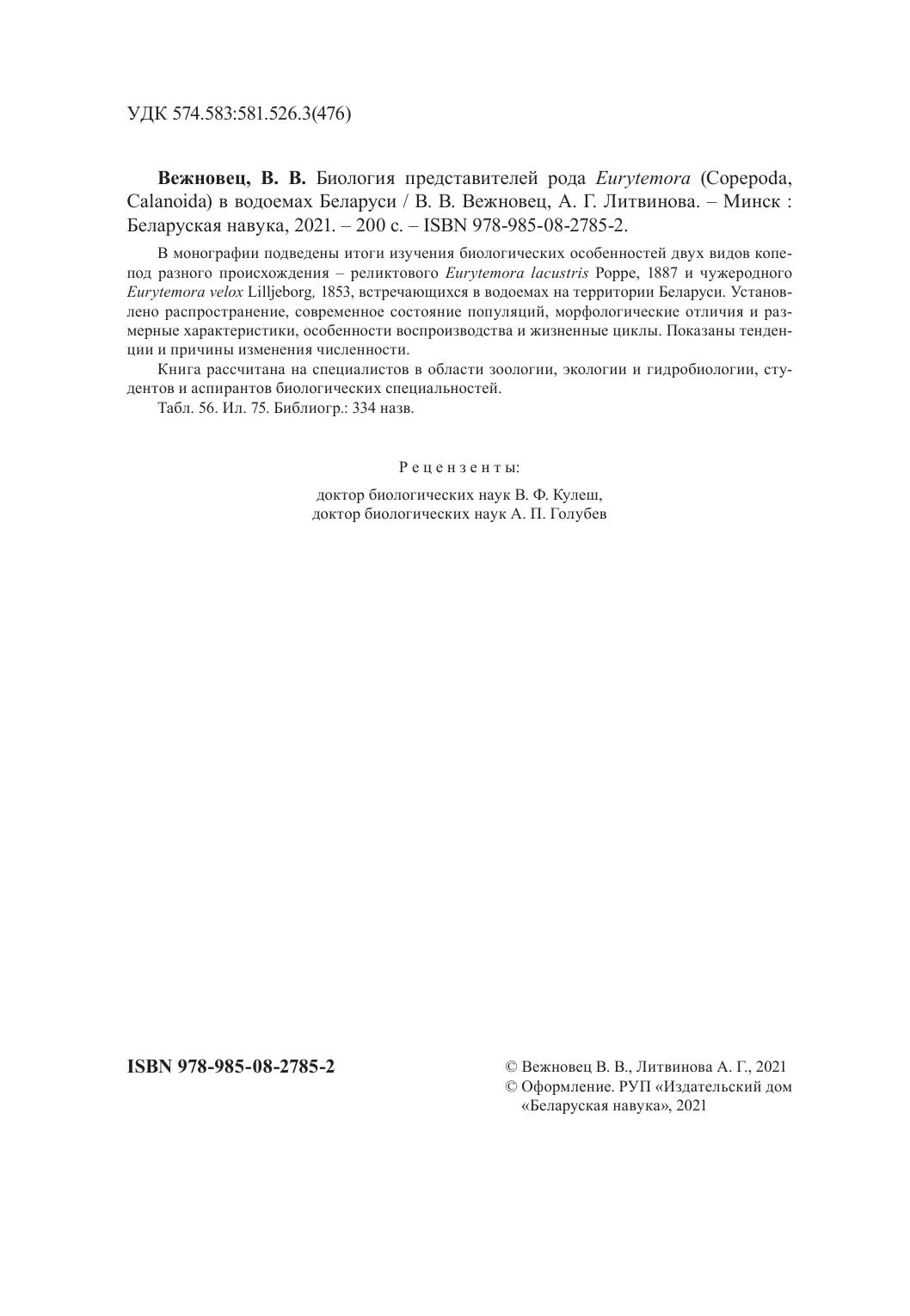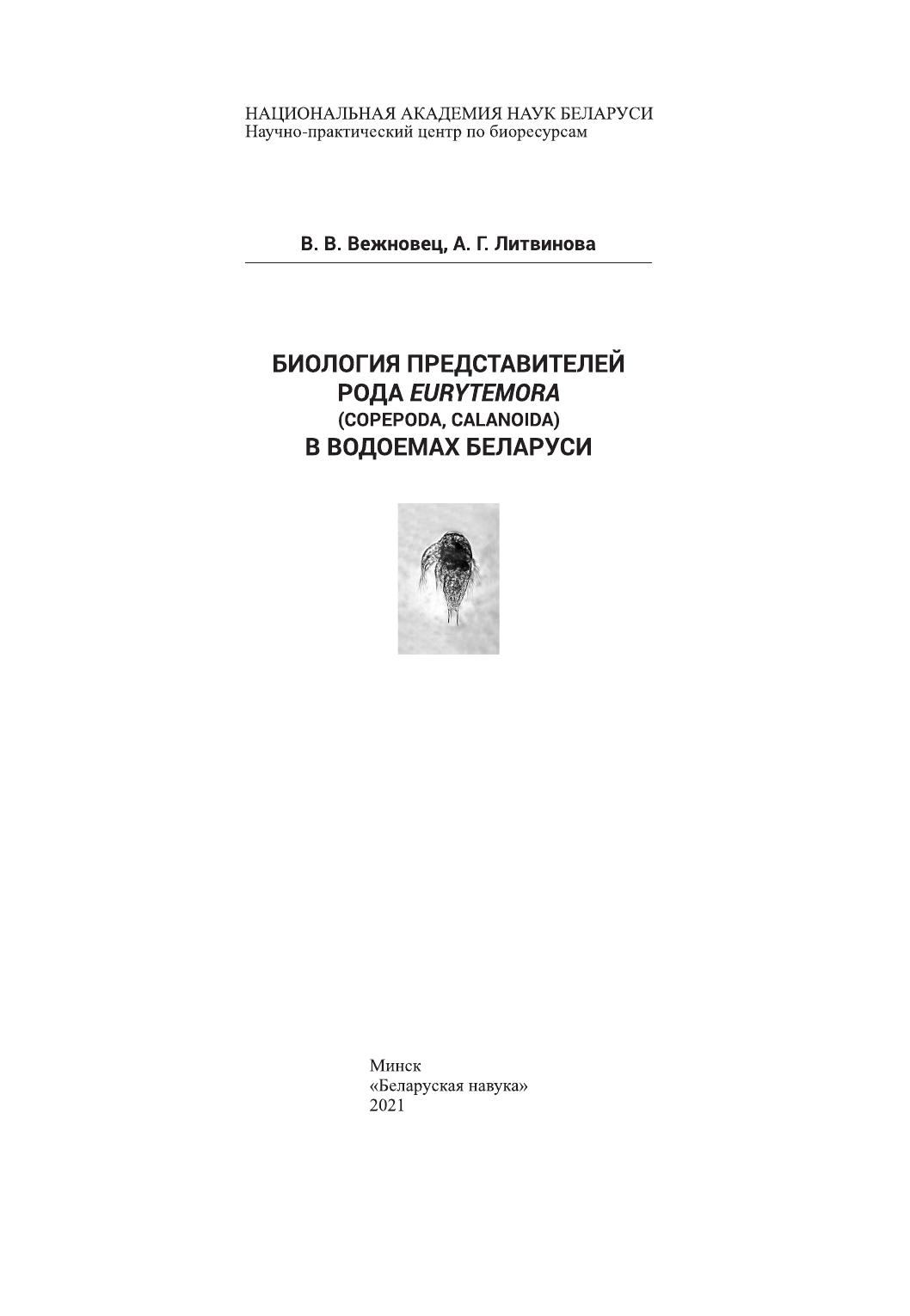 В монографии подведены итоги изучения биологических особенностей двух видов копепод разного происхождения – реликтового Eurytemora lacustris Poppe, 1887 и чужеродного Eurytemora velox Lilljeborg, 1853, встречающихся в водоемах на территории Беларуси. Установлено распространение, современное состояние популяций, морфологические отличия и размерные характеристики, особенности воспроизводства и жизненные циклы. Показаны тенденции и причины изменения численности.