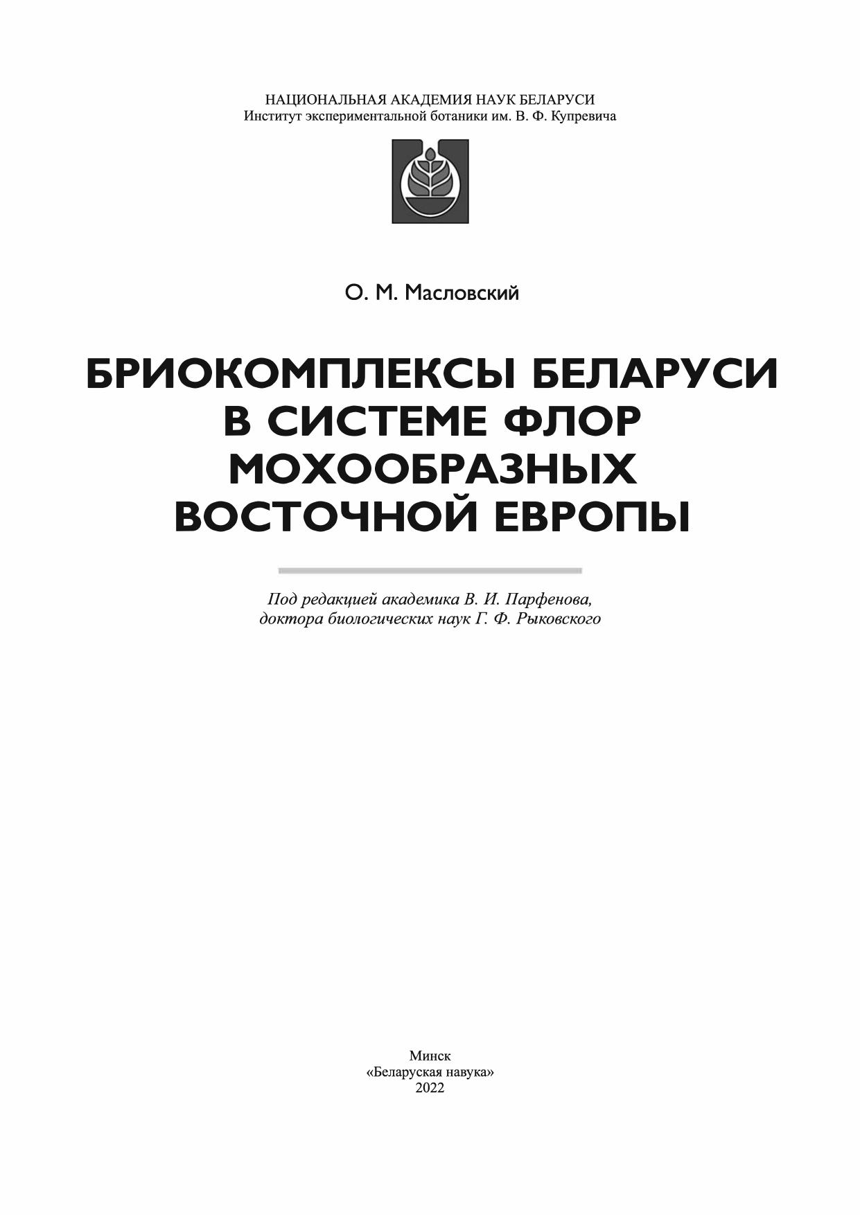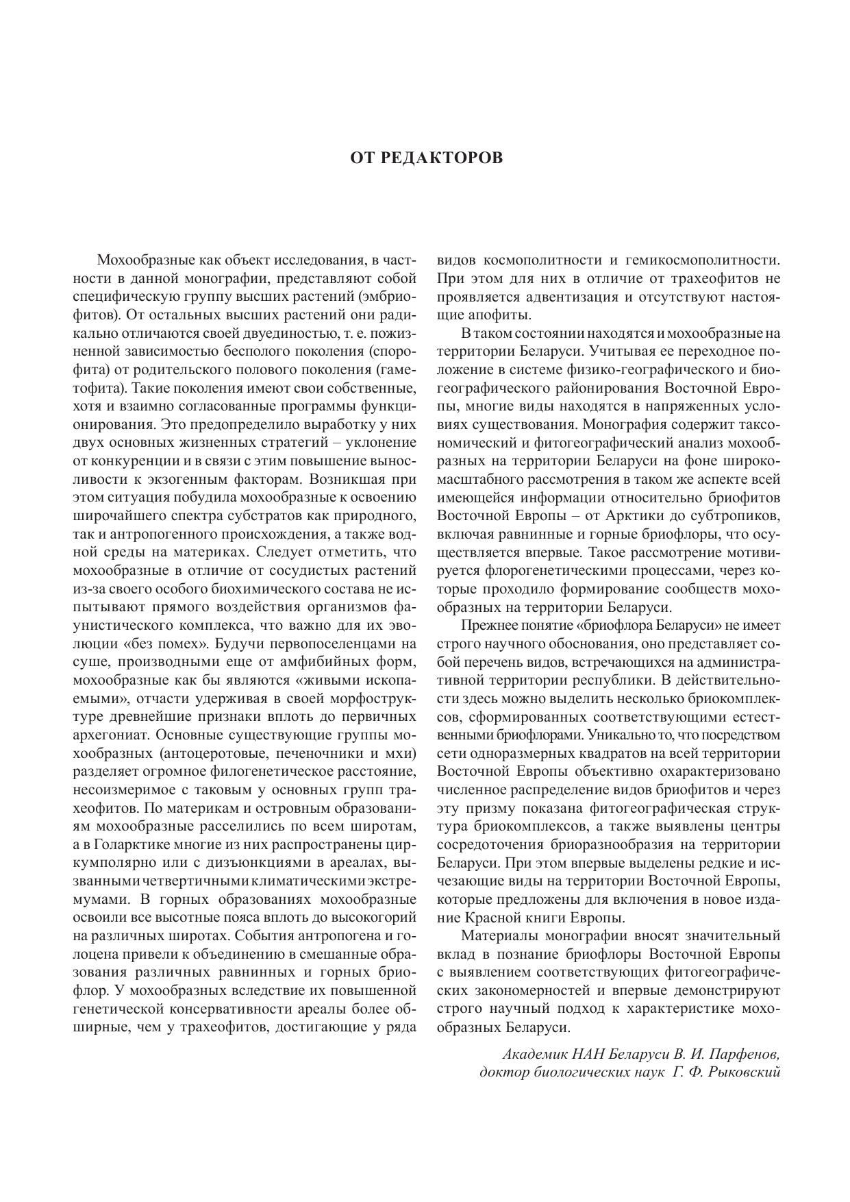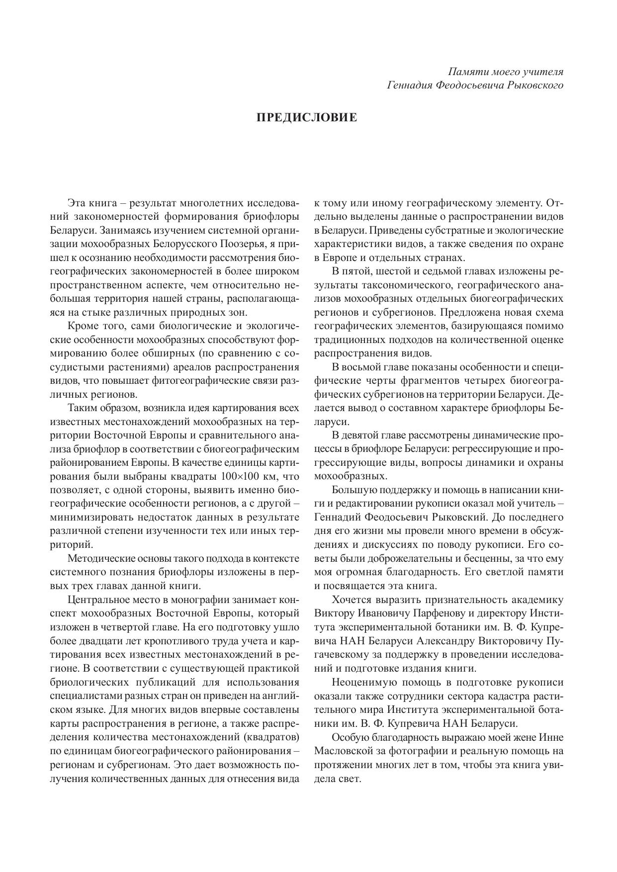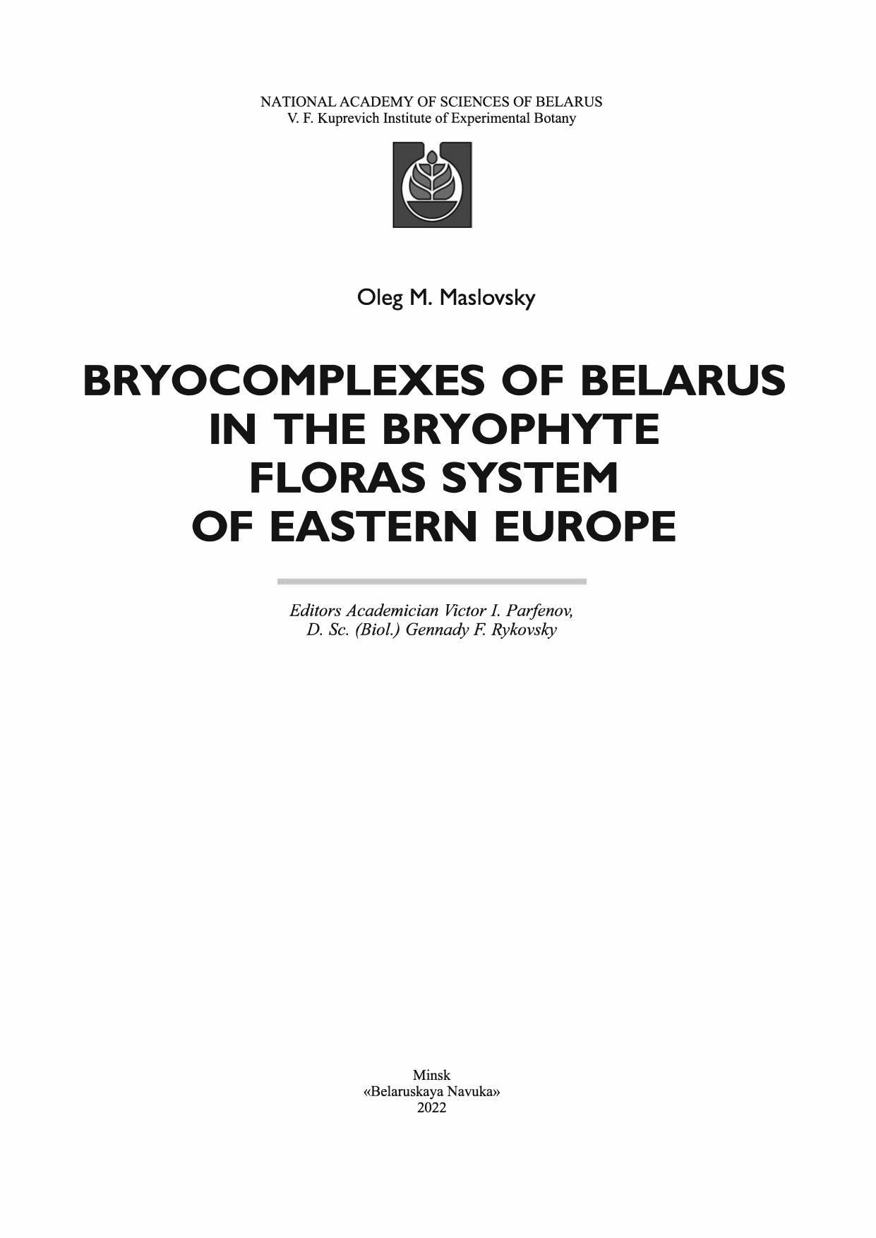 The book is result of long years bryofloristic investigations of the territory of the Belarus and Eastern Europe. System approach for investigation of flora is grounded, the main systematic, geographic, ecological and biological specifics of Belarus bryological complexes in bryofloras system of Eastern Europe. Check-list of bryophytes and its geography and ecology (including maps of distribution) are showed. System of geographical elements is proposed. Anthropogenic influence to bryoflora and questions of protection of bryophytes are discussed.