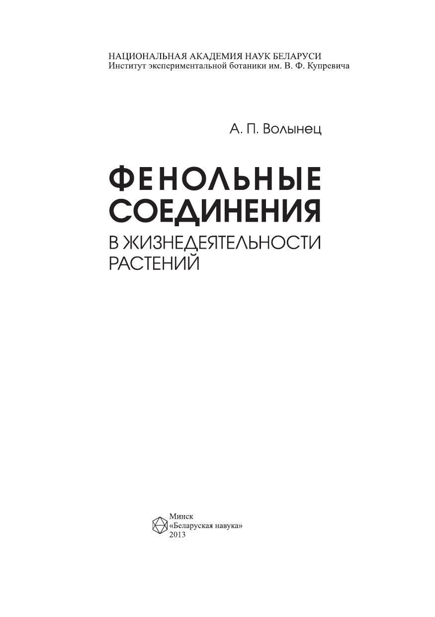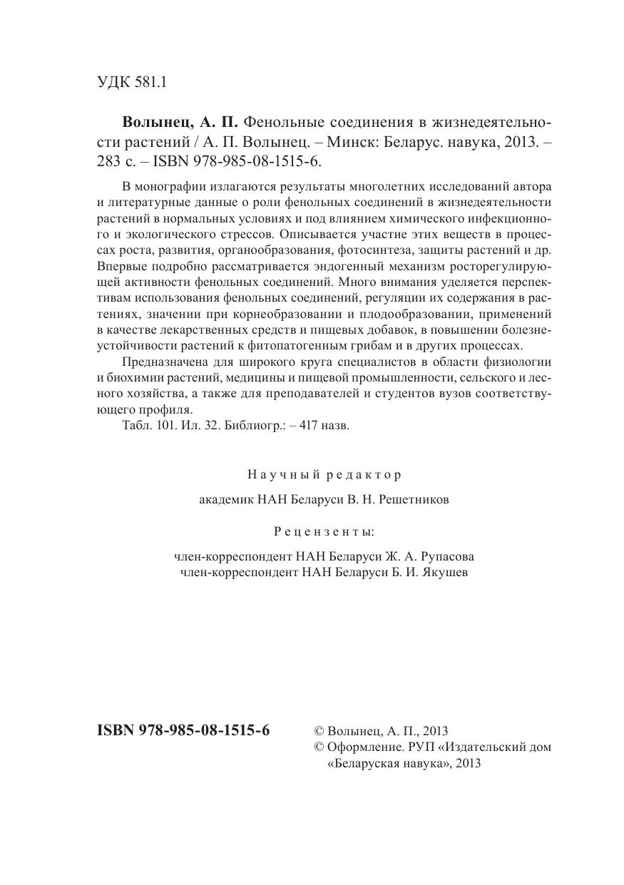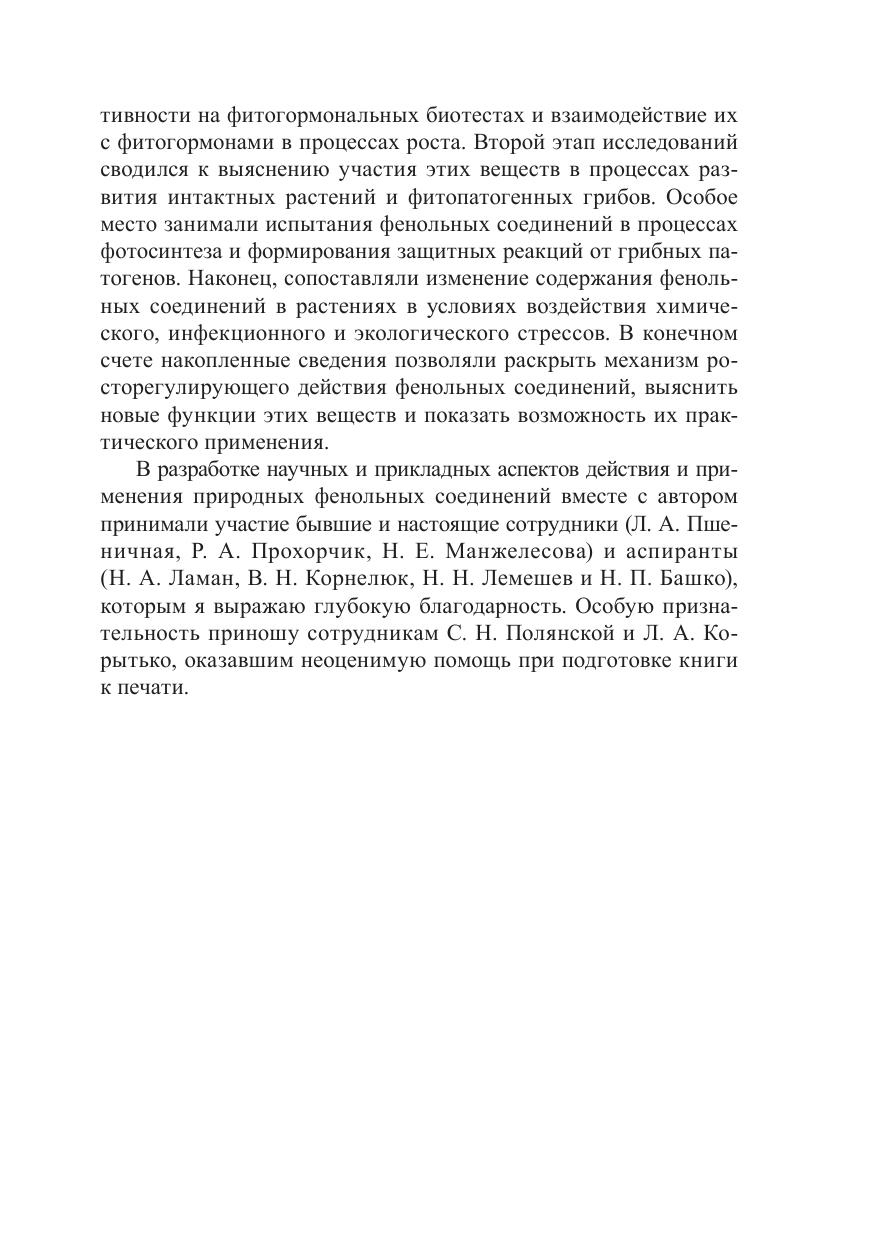 В монографии излагаются результаты многолетних исследований автора и литературные данные о роли фенольных соединений в жизнедеятельности растений в нормальных условиях и под влиянием химического инфекционного и экологического стрессов. Описывается участие этих веществ в процессах роста, развития, органообразования, фотосинтеза, защиты растений и др. Впервые подробно рассматривается эндогенный механизм росторегулирующей активности фенольных соединений. Много внимания уделяется перспективам использования фенольных соединений, регуляции их содержания в растениях, значении при корнеобразовании и плодообразовании, применений в качестве лекарственных средств и пищевых добавок, в повышении болезнеустойчивости растений к фитопатогенным грибам и в других процессах. Предназначена для широкого круга специалистов в области физиологии и биохимии растений, медицины и пищевой промышленности, сельского и лесного хозяйства, а также для преподавателей и студентов вузов соответствующего профиля.