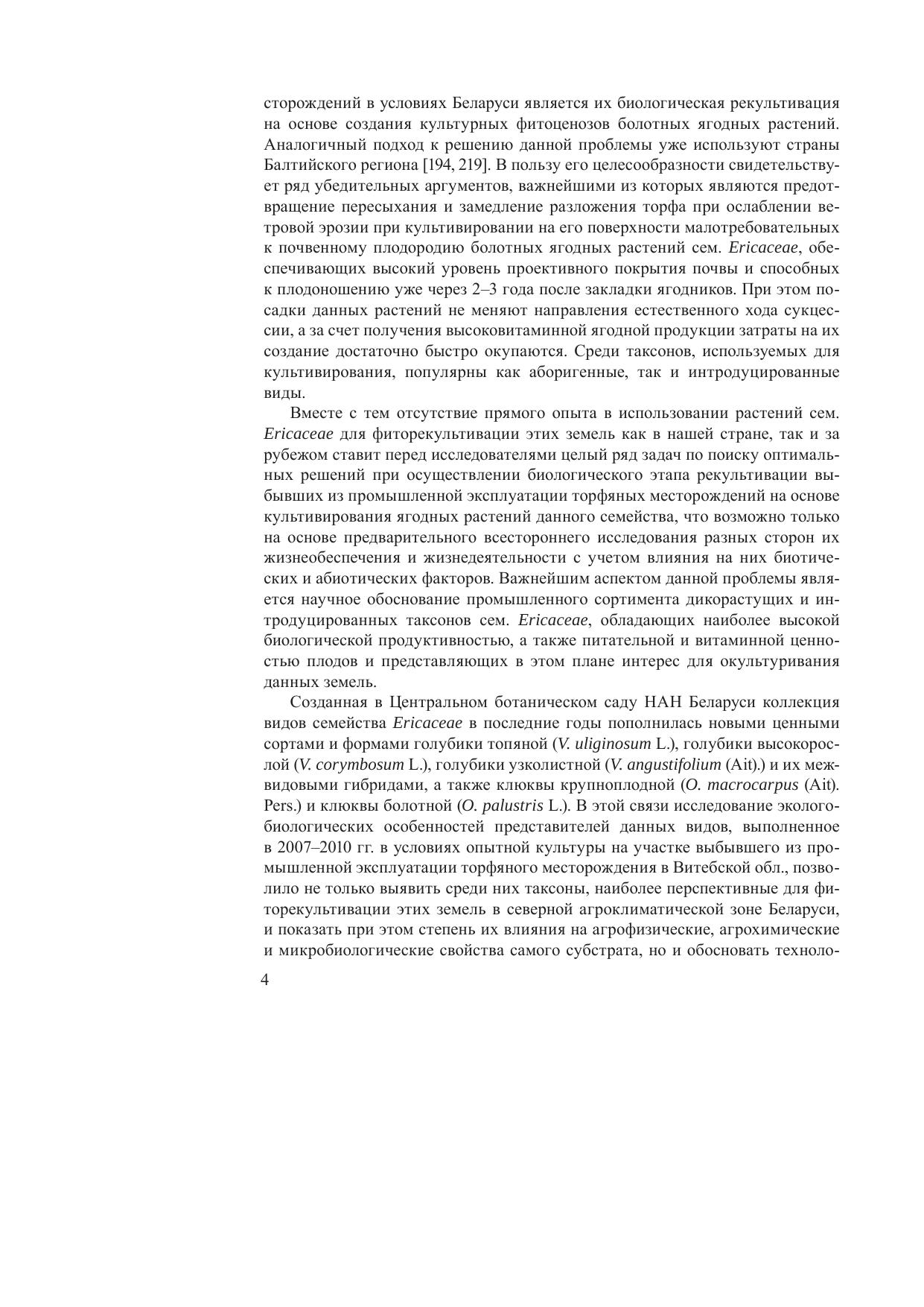 В монографии обобщены результаты многолетних исследований сезонного развития, ростовых и биопродукционных процессов, а также биохимического состава плодов 15 представителей родов Vaccinium и Oxycoccus сем. Ericaceae при возделывании в опытной культуре на участке выбывшего из промышленной эксплуатации торфяного месторождения в одном из северных районов Беларуси. Установлено положительное влияние данных объектов на водно- физические, физико-химические и микробиологические свойства торфяного субстрата, что позволяет рекомендовать их использование для фиторекультивации этих выведенных из хозяйственного оборота малоплодородных земель. Научно обоснован сортимент вересковых для практического использования по показателям качества ягодной продукции и устойчивости ее биохимического состава к внешним воздействиям. Показаны основные технологические приемы при создании производственных посадок клюквы крупноплодной в одном из хозяйств республики и дана оценка экономической эффективности данных мероприятий. Предназначена для широкого круга специалистов в области природопользования, ботаник, интродукции, физиологии и биохимии растений, сельского и лесного хозяйства.