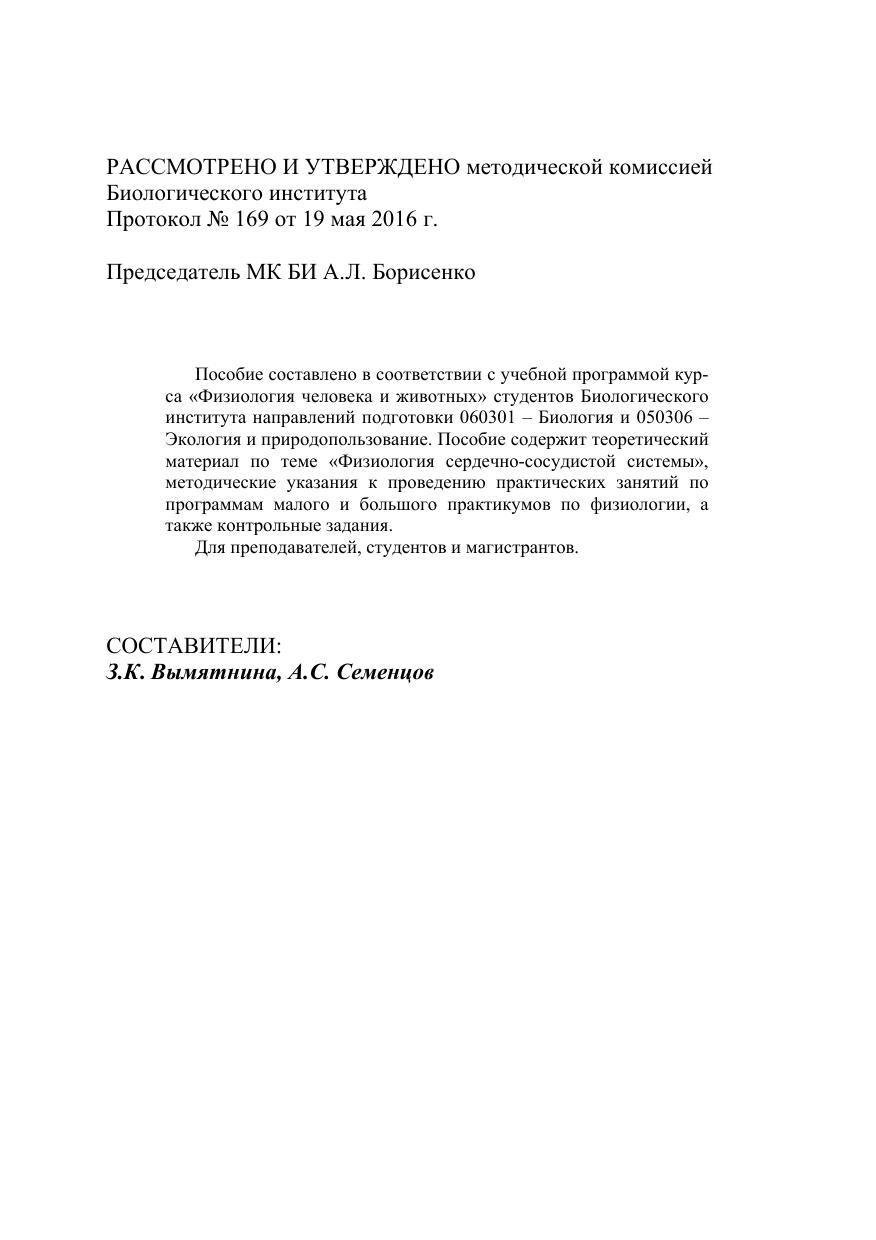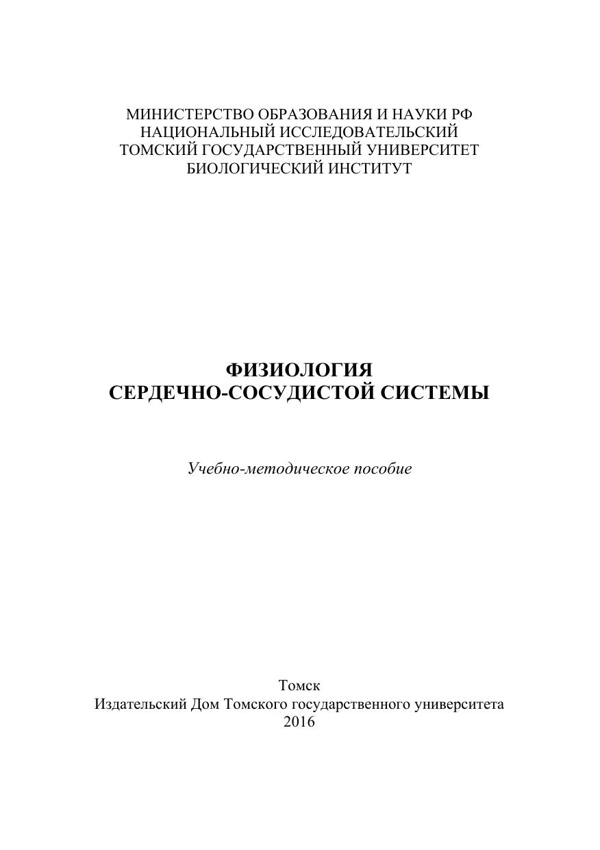 Пособие составлено в соответствии с учебной программой курса «Физиология человека и животных» студентов Биологического института направлений подготовки 060301 – Биология и 050306 – Экология и природопользование. Пособие содержит теоретический материал по теме «Физиология сердечно-сосудистой системы», методические указания к проведению практических занятий по программам малого и большого практикумов по физиологии, а также контрольные задания. Для преподавателей, студентов и магистрантов.
