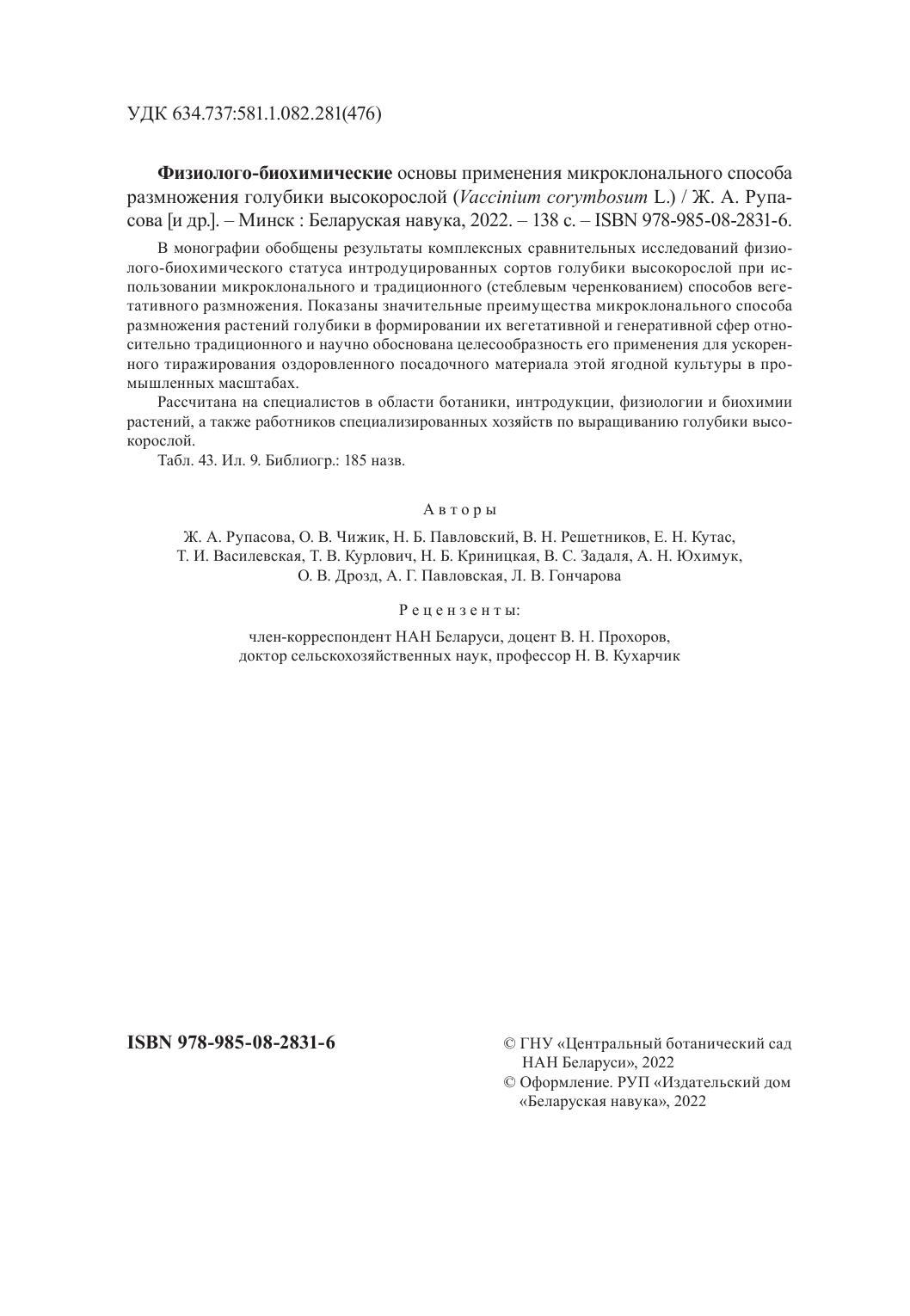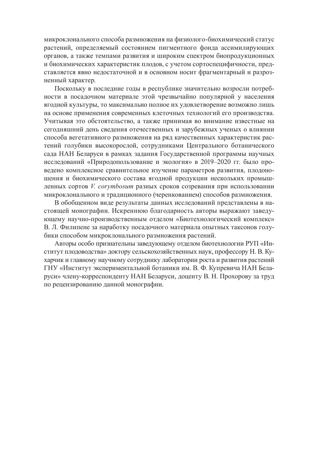 В монографии обобщены результаты комплексных сравнительных исследований физиолого-биохимического статуса интродуцированных сортов голубики высокорослой при использовании микроклонального и традиционного (стеблевым черенкованием) способов вегетативного размножения. Показаны значительные преимущества микроклонального способа размножения растений голубики в формировании их вегетативной и генеративной сфер относительно традиционного и научно обоснована целесообразность его применения для ускоренного тиражирования оздоровленного посадочного материала этой ягодной культуры в промышленных масштабах.