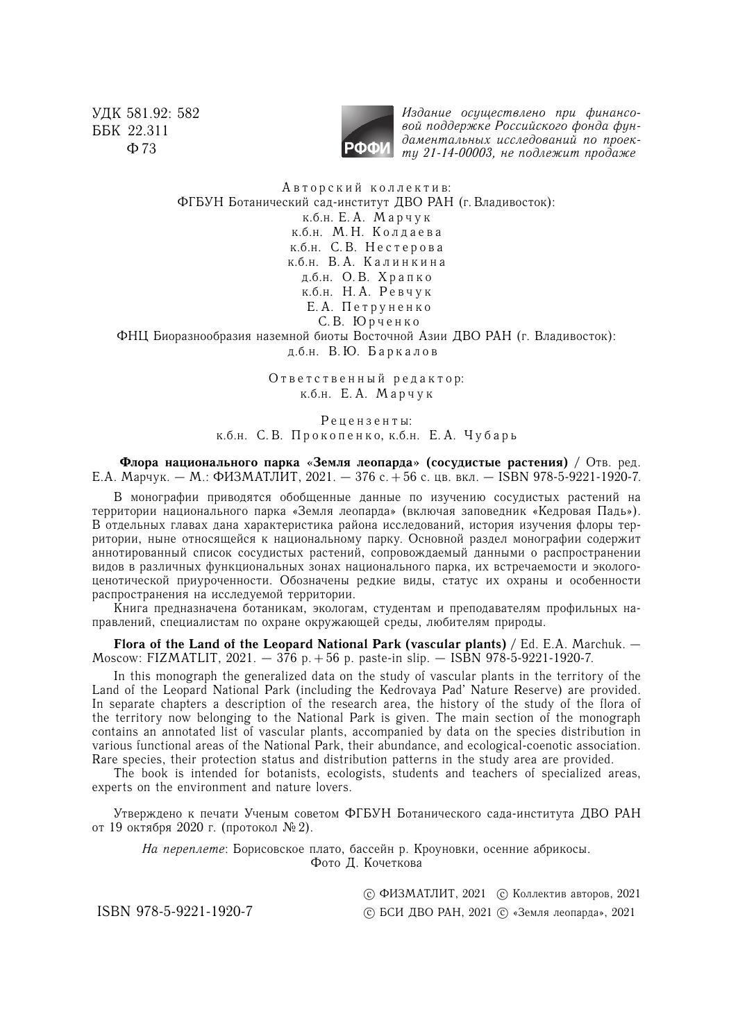 В монографии приводятся обобщенные данные по изучению сосудистых растений на территории национального парка «Земля леопарда» (включая заповедник «Кедровая Падь»).