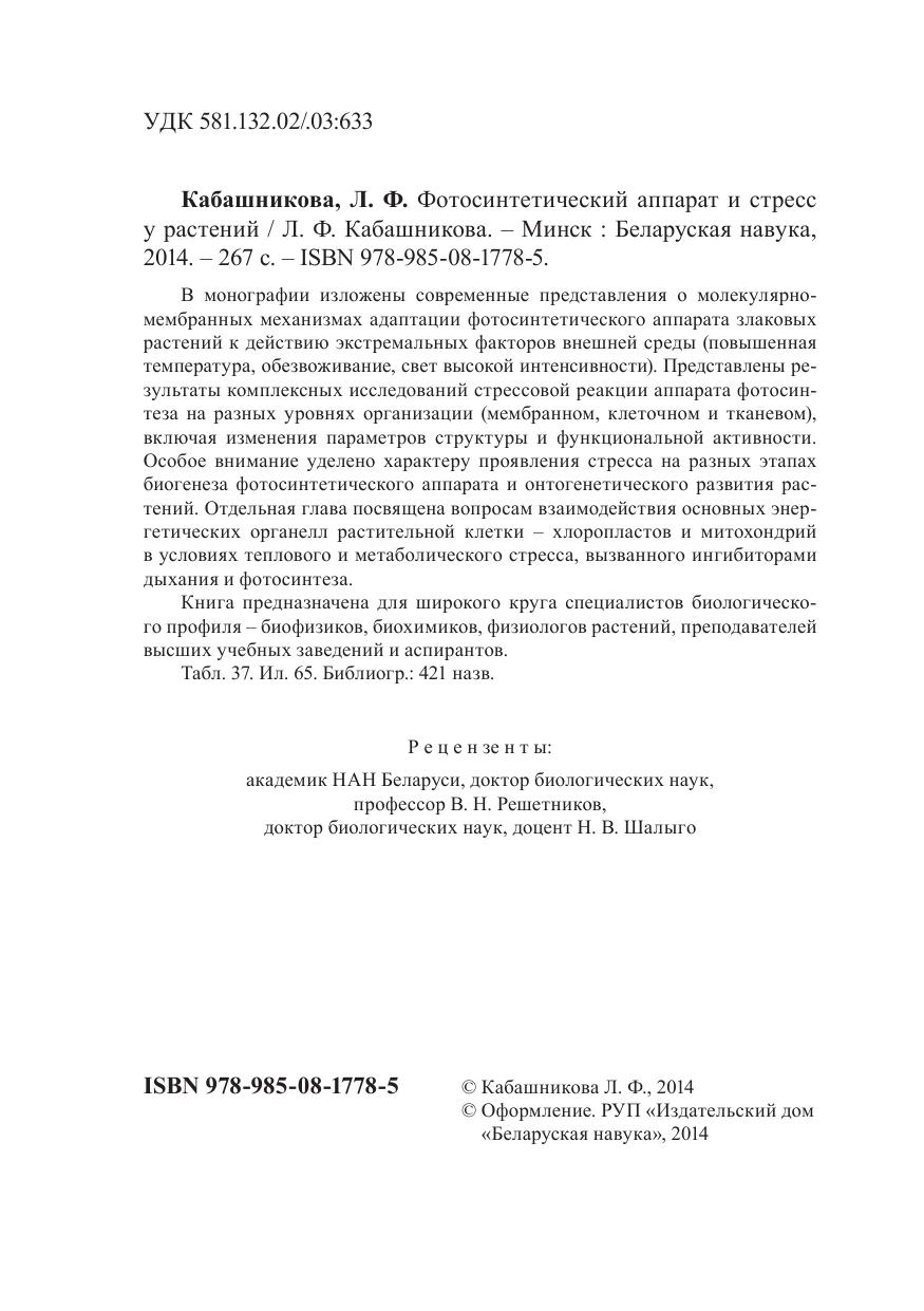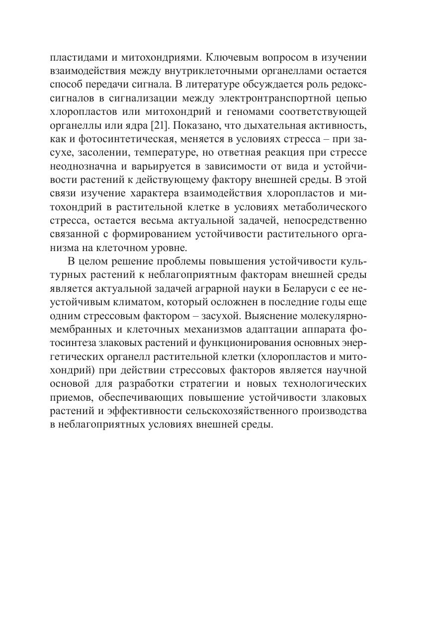 В монографии изложены современные представления о молекулярно-мембранных механизмах адаптации фотосинтетического аппарата злаковых растений к действию экстремальных факторов внешней среды (повышенная температура, обезвоживание, свет высокой интенсивности). Представлены результаты комплексных исследований стрессовой реакции аппарата фотосинтеза на разных уровнях организации (мембранном, клеточном и тканевом), включая изменения параметров структуры и функциональной активности. Особое внимание уделено характеру проявления стресса на разных этапах биогенеза фотосинтетического аппарата и онтогенетического развития растений. Отдельная глава посвящена вопросам взаимодействия основных энергетических органелл растительной клетки – хлоропластов и митохондрий в условиях теплового и метаболического стресса, вызванного ингибиторами дыхания и фотосинтеза. Книга предназначена для широкого круга специалистов биологического профиля – биофизиков, биохимиков, физиологов растений, преподавателей высших учебных заведений и аспирантов.