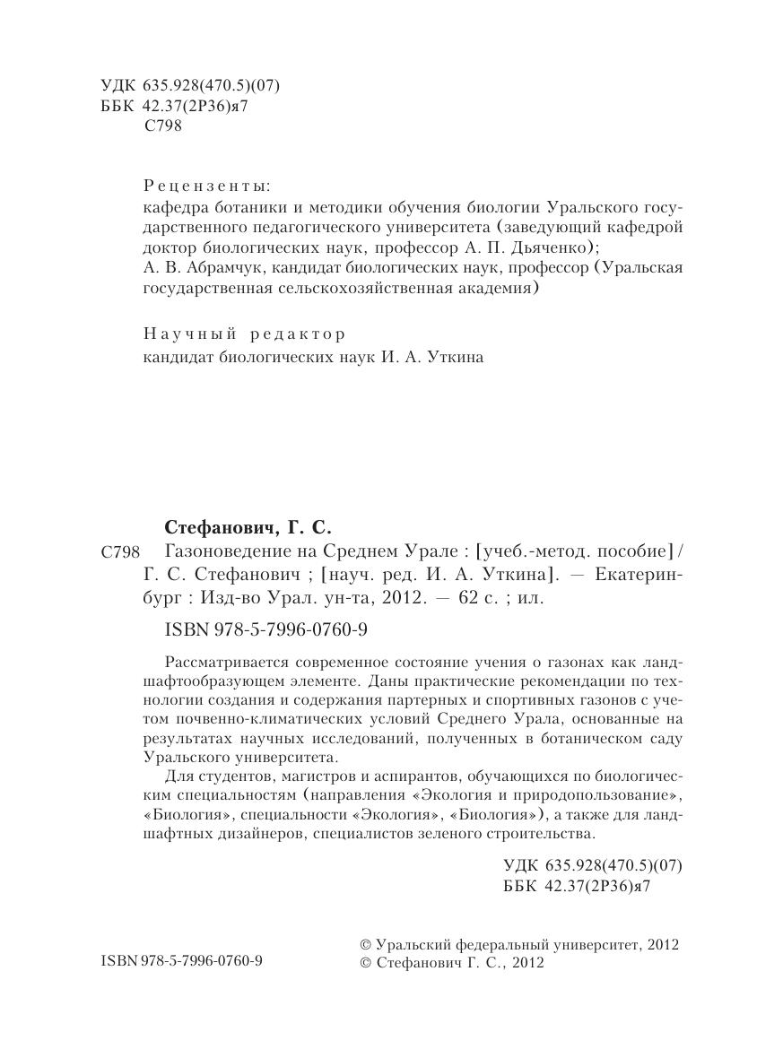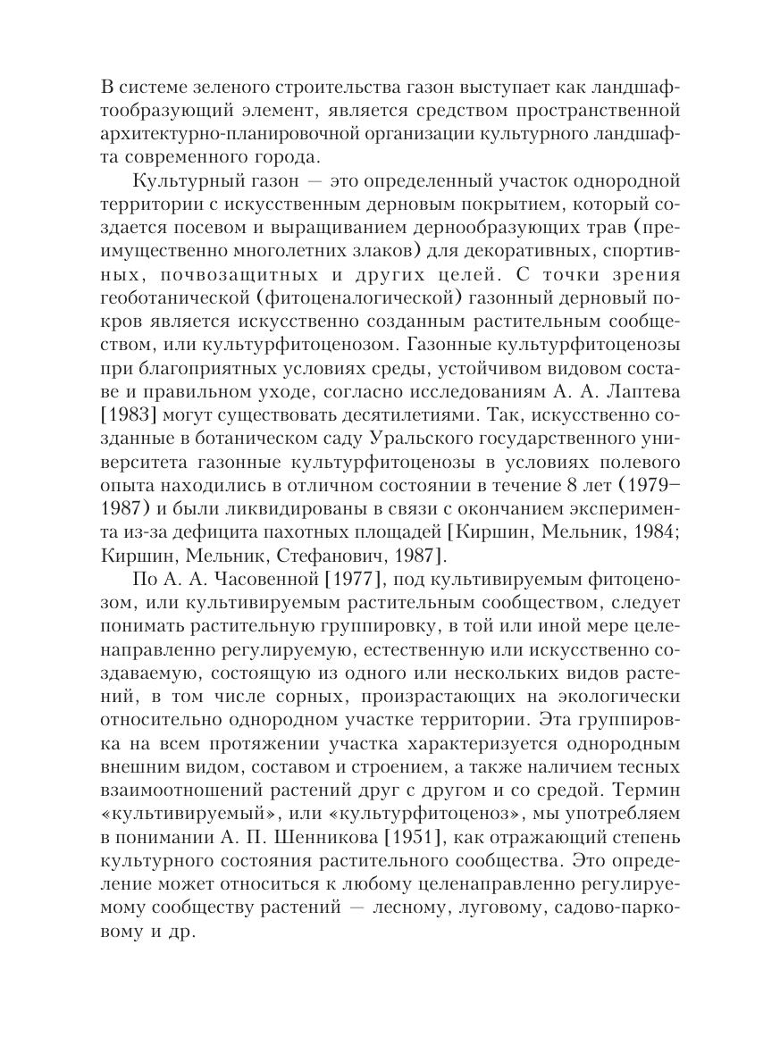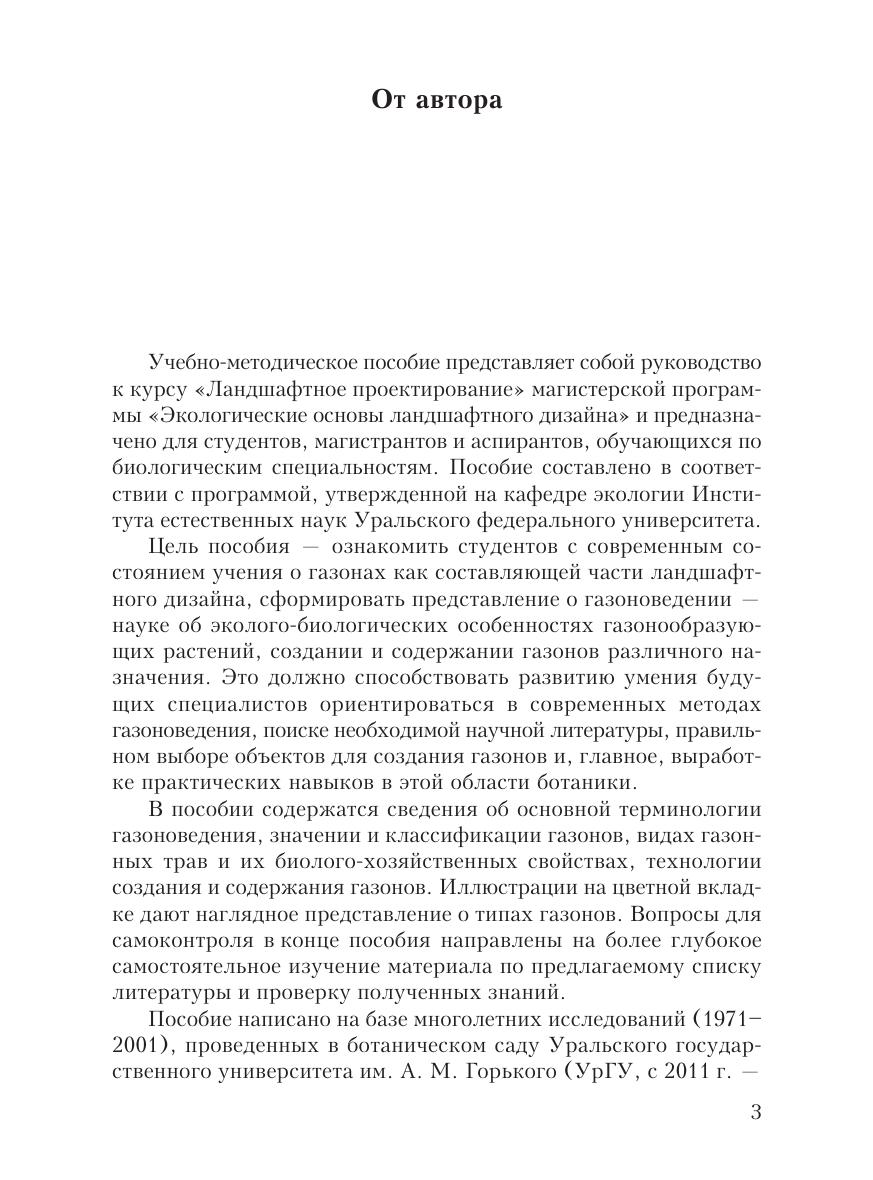 Рассматривается современное состояние учения о газонах как ландшафтообразующем элементе. Даны практические рекомендации по технологии создания и содержания партерных и спортивных газонов с учетом почвенно-климатических условий Среднего Урала, основанные на результатах научных исследований, полученных в ботаническом саду Уральского университета. Для студентов, магистров и аспирантов, обучающихся по биологическим специальностям (направления «Экология и природопользование», «Биология», специальности «Экология», «Биология»), а также для ландшафтных дизайнеров, специалистов зеленого строительства.