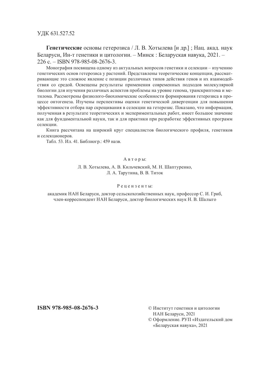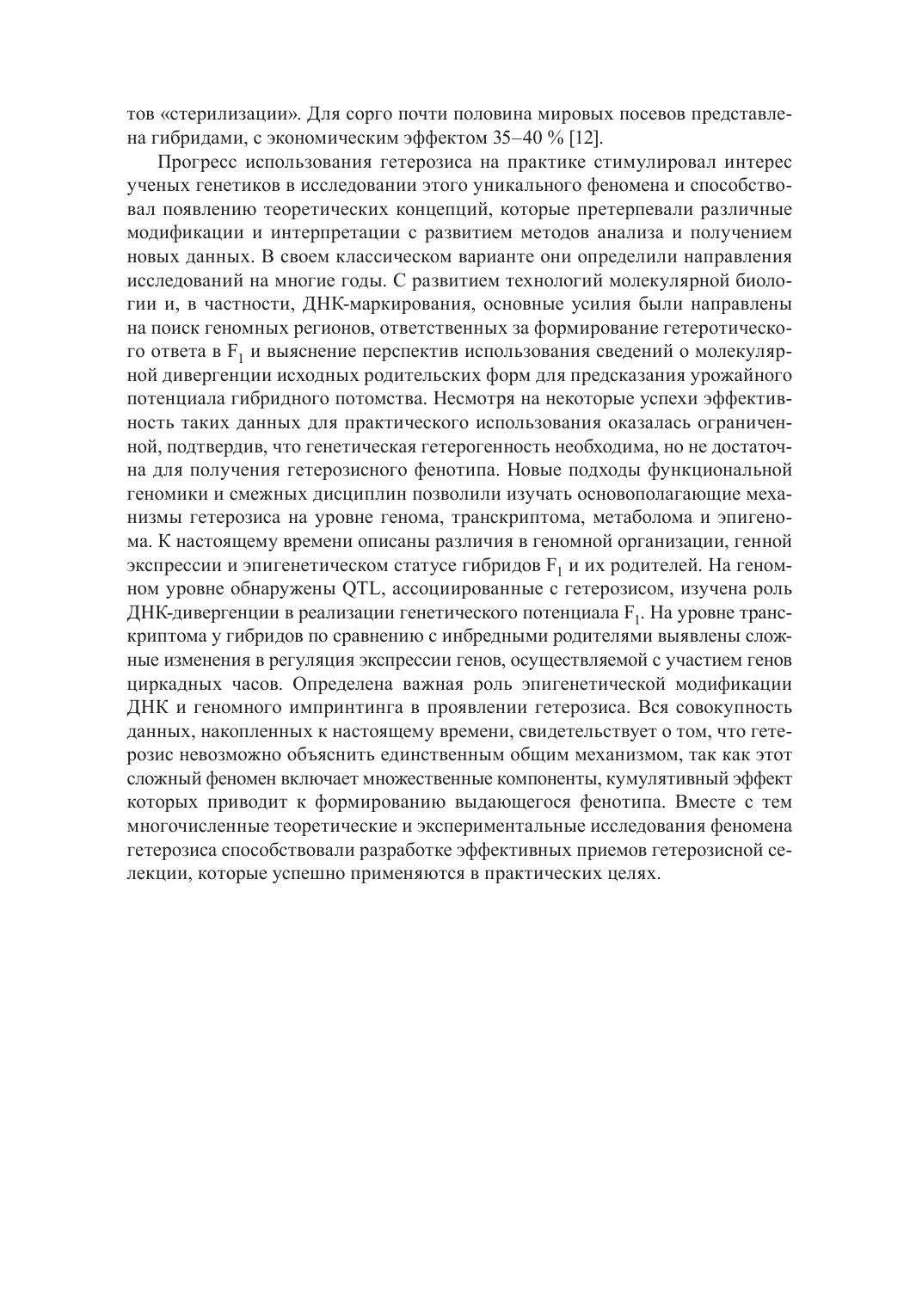 Монография посвящена одному из актуальных вопросов генетики и селекции – изучению генетических основ гетерозиса у растений. Представлены теоретические концепции, рассматривающие это сложное явление с позиции различных типов действия генов и их взаимодействия со средой. Освещены результаты применения современных подходов молекулярной биологии для изучения различных аспектов проблемы на уровне генома, транскриптома и метилома. Рассмотрены физиолого-биохимические особенности формирования гетерозиса в процессе онтогенеза. Изучены перспективы оценки генетической дивергенции для повышения эффективности отбора пар скрещивания в селекции на гетерозис. Показано, что информация, полученная в результате теоретических и экспериментальных работ, имеет большое значение как для фундаментальной науки, так и для практики при разработке эффективных программ селекции.