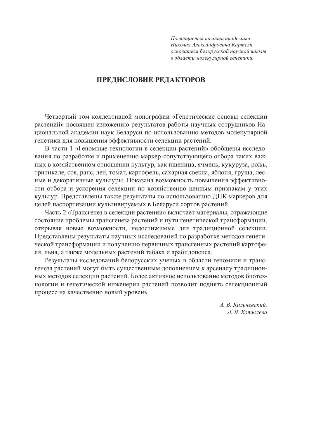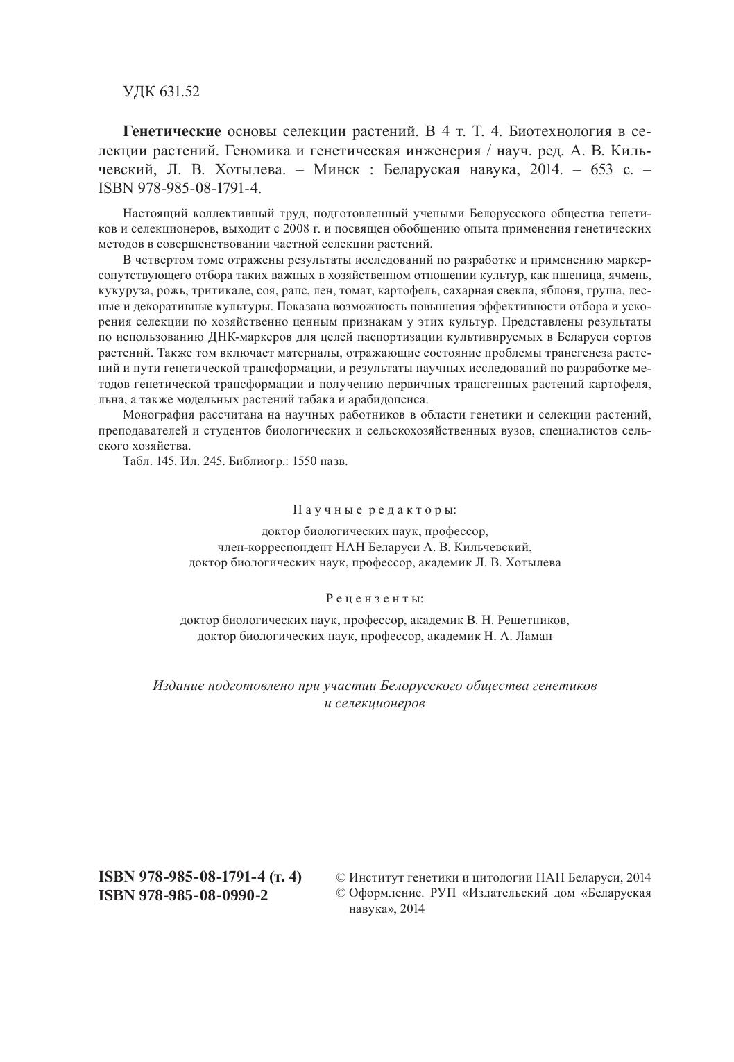 Настоящий коллективный труд, подготовленный учеными Белорусского общества генетиков и селекционеров, выходит с 2008 г. и посвящен обобщению опыта применения генетических методов в совершенствовании частной селекции растений. В четвертом томе отражены результаты исследований по разработке и применению маркерсопутствующего отбора таких важных в хозяйственном отношении культур, как пшеница, ячмень, кукуруза, рожь, тритикале, соя, рапс, лен, томат, картофель, сахарная свекла, яблоня, груша, лесные и декоративные культуры. Показана возможность повышения эффективности отбора и ускорения селекции по хозяйственно ценным признакам у этих культур. Представлены результаты по использованию ДНК-маркеров для целей паспортизации культивируемых в Беларуси сортов растений. Также том включает материалы, отражающие состояние проблемы трансгенеза растений и пути генетической трансформации, и результаты научных исследований по разработке методов генетической трансформации и получению первичных трансгенных растений картофеля, льна, а также модельных растений табака и арабидопсиса. Монография рассчитана на научных работников в области генетики и селекции растений, преподавателей и студентов биологических и сельскохозяйственных вузов, специалистов сельского хозяйства.