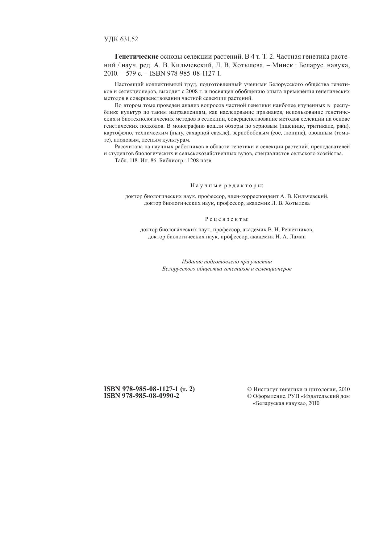 Настоящий коллективный труд, подготовленный учеными Белорусского общества генетиков и селекционеров, выходит с 2008 г. и посвящен обобщению опыта применения генетических методов в совершенствовании частной селекции растений. Во втором томе проведен анализ вопросов частной генетики наиболее изученных в республике культур по таким направлениям, как наследование признаков, использование генетических и биотехнологических методов в селекции, совершенствование методов селекции на основе генетических подходов. В монографию вошли обзоры по зерновым (пшенице, тритикале, ржи), картофелю, техническим (льну, сахарной свекле), зернобобовым (сое, люпине), овощным (томате), плодовым, лесным культурам. Рассчитана на научных работников в области генетики и селекции растений, преподавателей и студентов биологических и сельскохозяйственных вузов, специалистов сельского хозяйства.