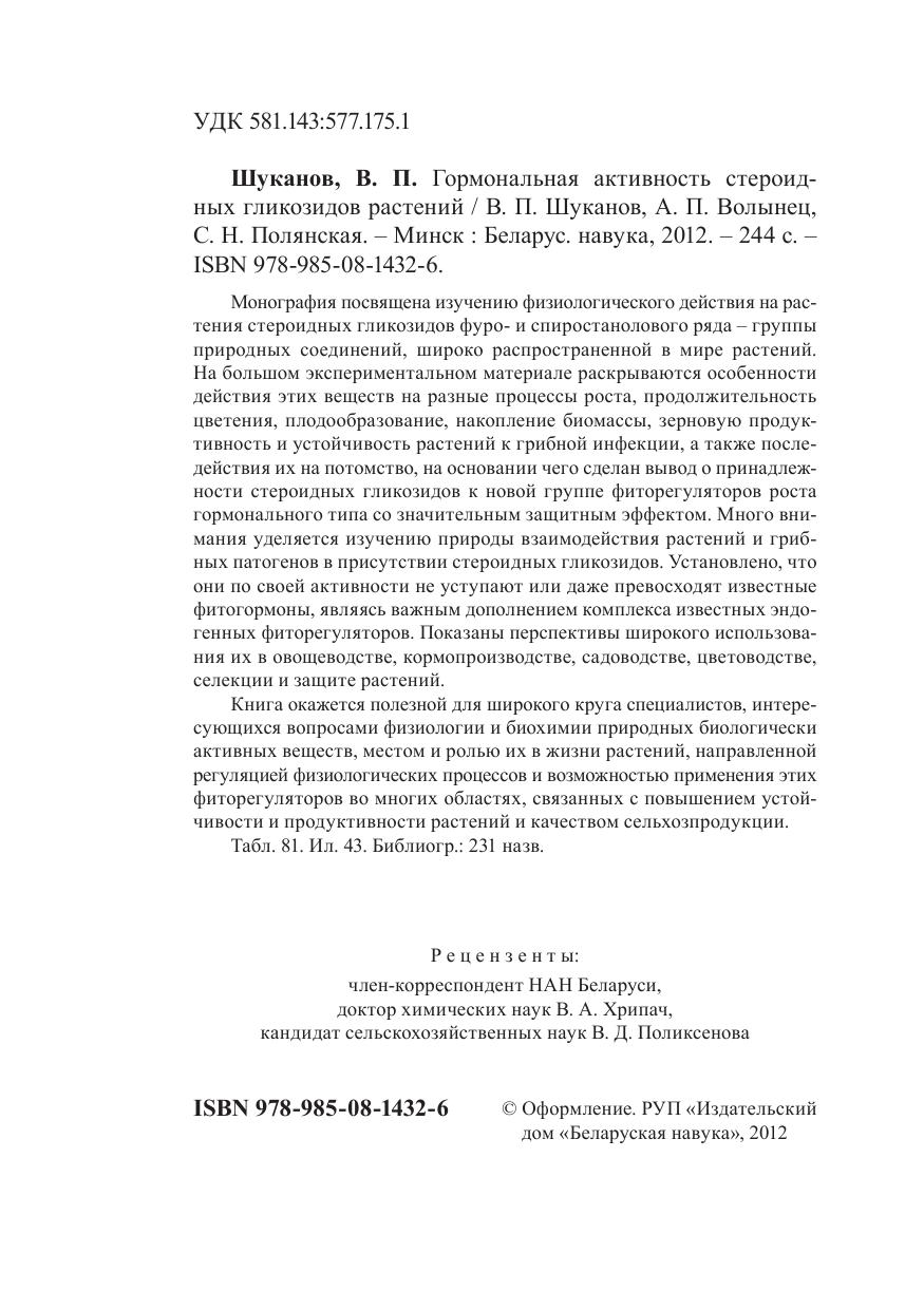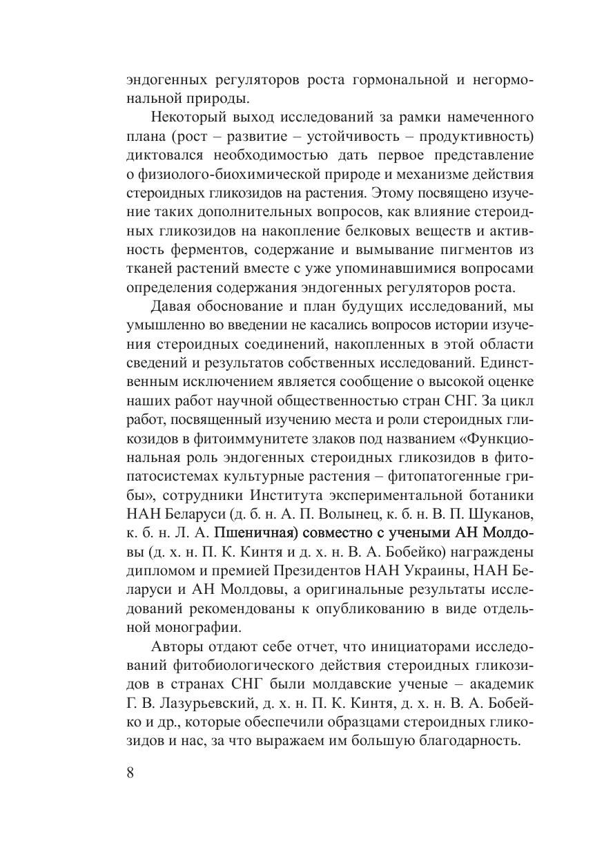 Монография посвящена изучению физиологического действия на растения стероидных гликозидов фуро- и спиростанолового ряда – группы природных соединений, широко распространенной в мире растений. На большом экспериментальном материале раскрываются особенности действия этих веществ на разные процессы роста, продолжительность цветения, плодообразование, накопление биомассы, зерновую продуктивность и устойчивость растений к грибной инфекции, а также после действия их на потомство, на основании чего сделан вывод о принадлежности стероидных гликозидов к новой группе фиторегуляторов роста гормонального типа со значительным защитным эффектом. Много внимания уделяется изучению природы взаимодействия растений и грибных патогенов в присутствии стероидных гликозидов. Установлено, что они по своей активности не уступают или даже превосходят известные фитогормоны, являясь важным дополнением комплекса известных эндогенных фиторегуляторов. Показаны перспективы широкого использования их в овощеводстве, кормопроизводстве, садоводстве, цветоводстве, селекции и защите растений. Книга окажется полезной для широкого круга специалистов, интересующихся вопросами физиологии и биохимии природных биологически активных веществ, местом и ролью их в жизни растений, направленной регуляцией физиологических процессов и возможностью применения этих фиторегуляторов во многих областях, связанных с повышением устойчивости и продуктивности растений и качеством сельхозпродукции.