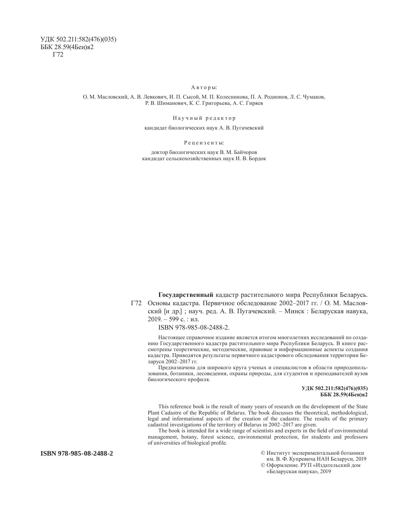 Настоящее справочное издание является итогом многолетних исследований по созданию Государственного кадастра растительного мира Республики Беларусь. В книге рассмотрены теоретические, методические, правовые и информационные аспекты создания кадастра. Приводятся результаты первичного кадастрового обследования территории Беларуси 2002–2017 гг. Предназначена для широкого круга ученых и специалистов в области природопользования, ботаники, лесоведения, охраны природы, для студентов и преподавателей вузов биологического профиля.