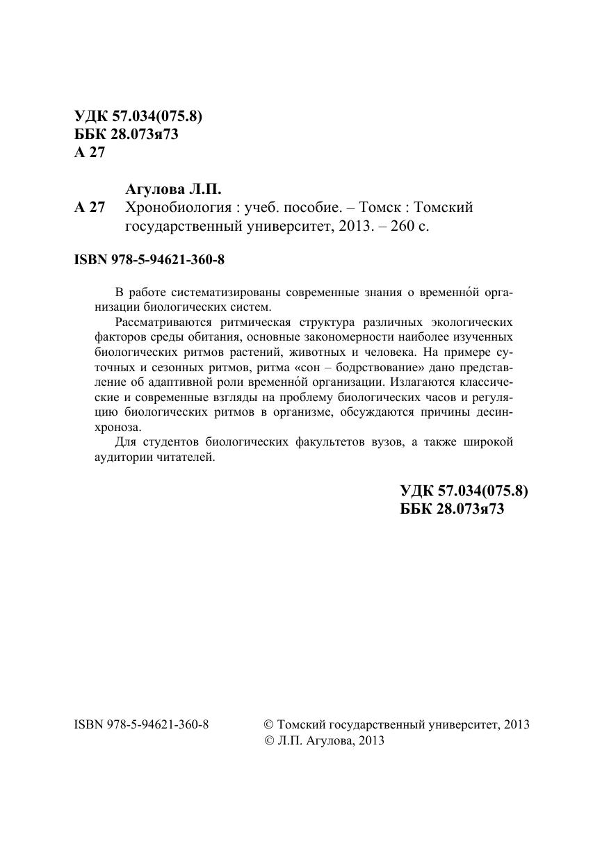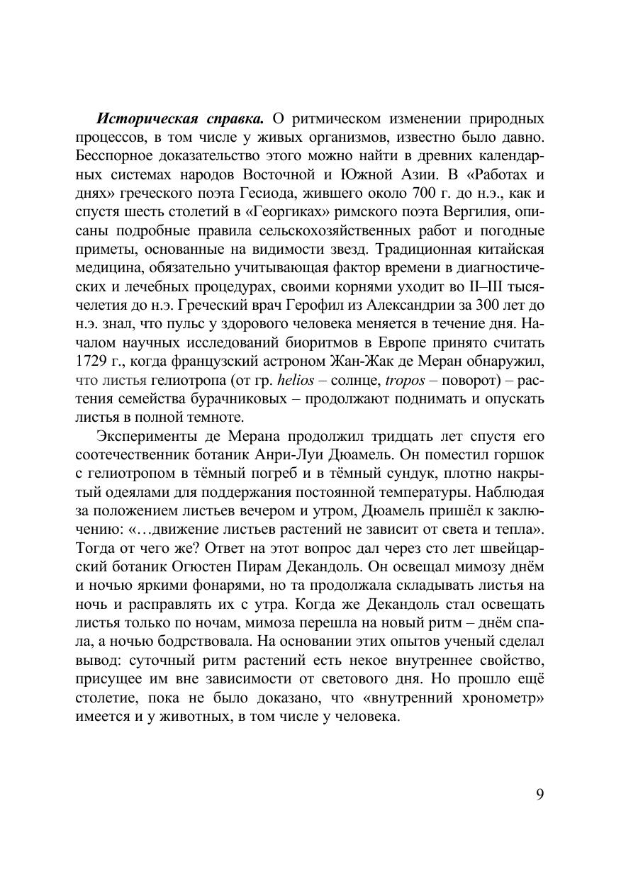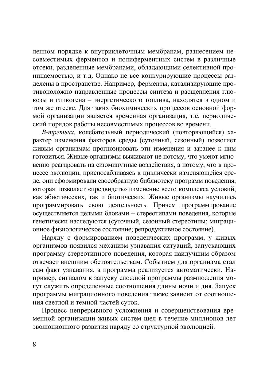 В работе систематизированы современные знания о временно?й организации биологических систем. Рассматриваются ритмическая структура различных экологических факторов среды обитания, основные закономерности наиболее изученных биологических ритмов растений, животных и человека. На примере суточных и сезонных ритмов, ритма «сон – бодрствование» дано представление об адаптивной роли временно?й организации. Излагаются классические и современные взгляды на проблему биологических часов и регуляцию биологических ритмов в организме, обсуждаются причины десинхроноза. Для студентов биологических факультетов вузов, а также широкой аудитории читателей.
