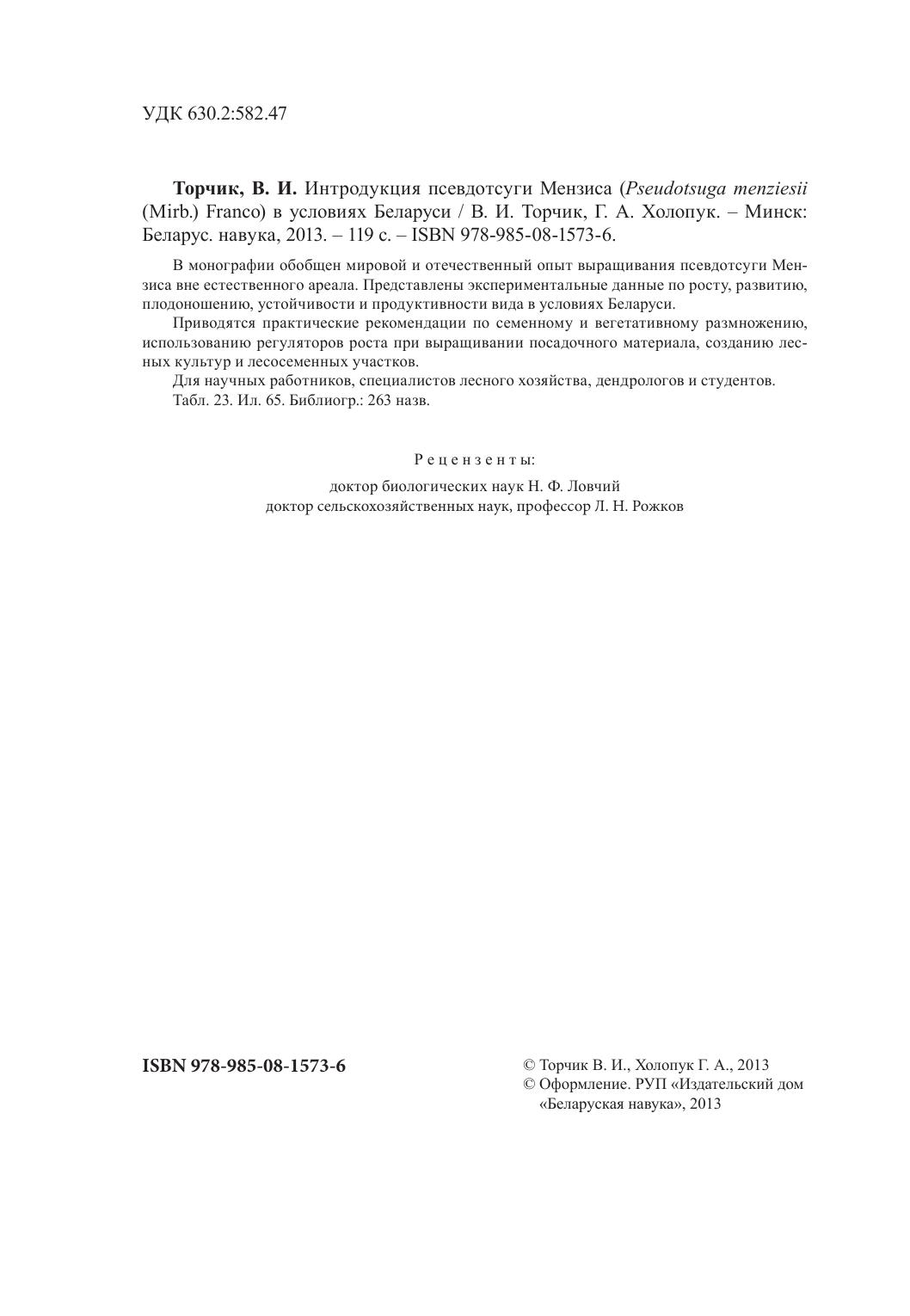 В монографии обобщен мировой и отечественный опыт выращивания псевдотсуги Мензиса вне естественного ареала. Представлены экспериментальные данные по росту, развитию, плодоношению, устойчивости и продуктивности вида в условиях Беларуси. Приводятся практические рекомендации по семенному и вегетативному размножению, использованию регуляторов роста при выращивании посадочного материала, созданию лесных культур и лесосеменных участков. Для научных работников, специалистов лесного хозяйства, дендрологов и студентов.