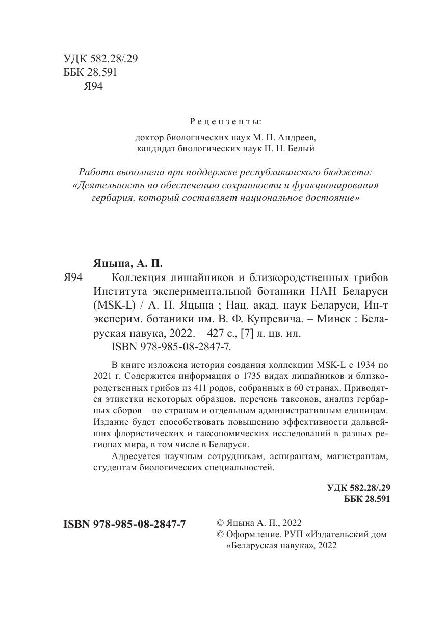 В книге изложена история создания коллекции MSK-L с 1934 по 2021 г. Содержится информация о 1735 видах лишайников и близкородственных грибов из 411 родов, собранных в 60 странах. Приводятся этикетки некоторых образцов, перечень таксонов, анализ гербарных сборов – по странам и отдельным административным единицам. Издание будет способствовать повышению эффективности дальнейших флористических и таксономических исследований в разных регионах мира, в том числе в Беларуси.