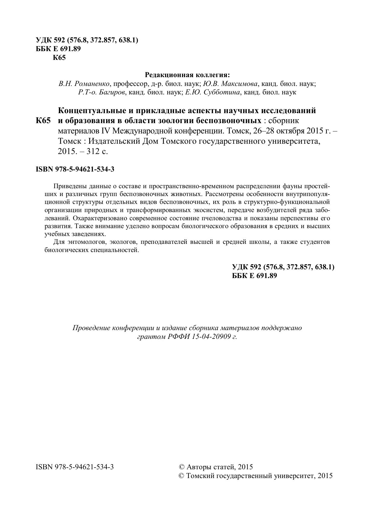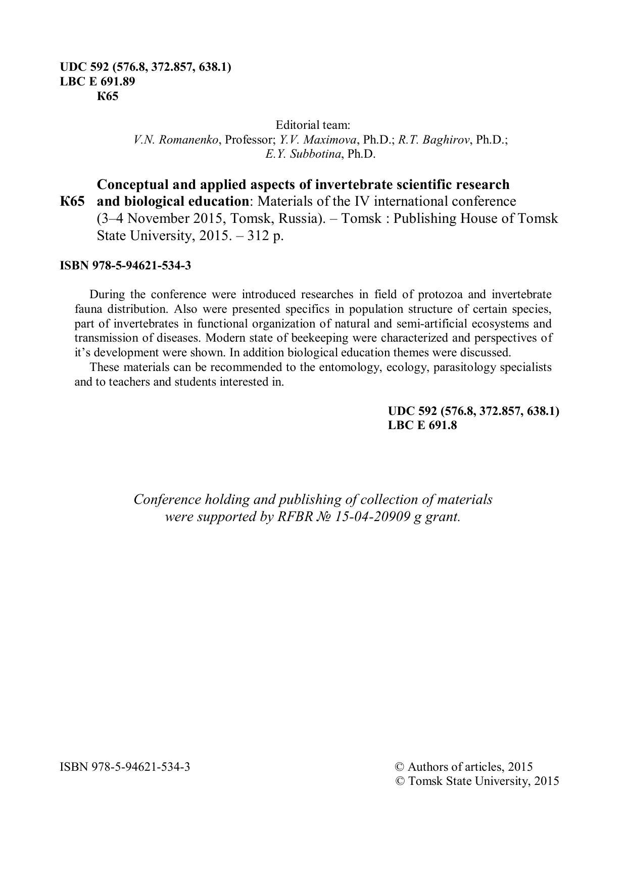 Приведены данные о составе и пространственно-временном распределении фауны простейших и различных групп беспозвоночных животных. Рассмотрены особенности внутрипопуляционной структуры отдельных видов беспозвоночных, их роль в структурно-функциональной организации природных и трансформированных экосистем, передаче возбудителей ряда забо- леваний. Охарактеризовано современное состояние пчеловодства и показаны перспективы его развития. Также внимание уделено вопросам биологического образования в средних и высших учебных заведениях. Для энтомологов, экологов, преподавателей высшей и средней школы, а также студентов биологических специальностей.