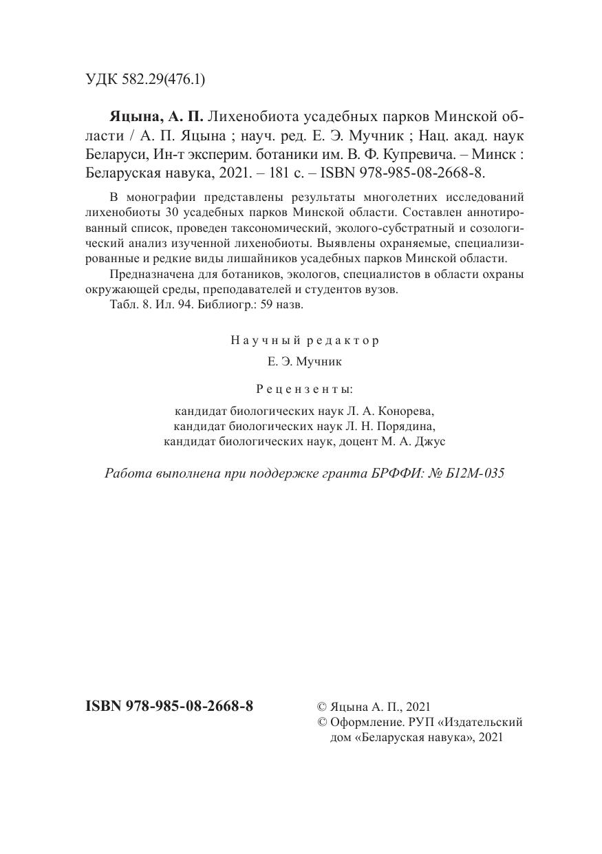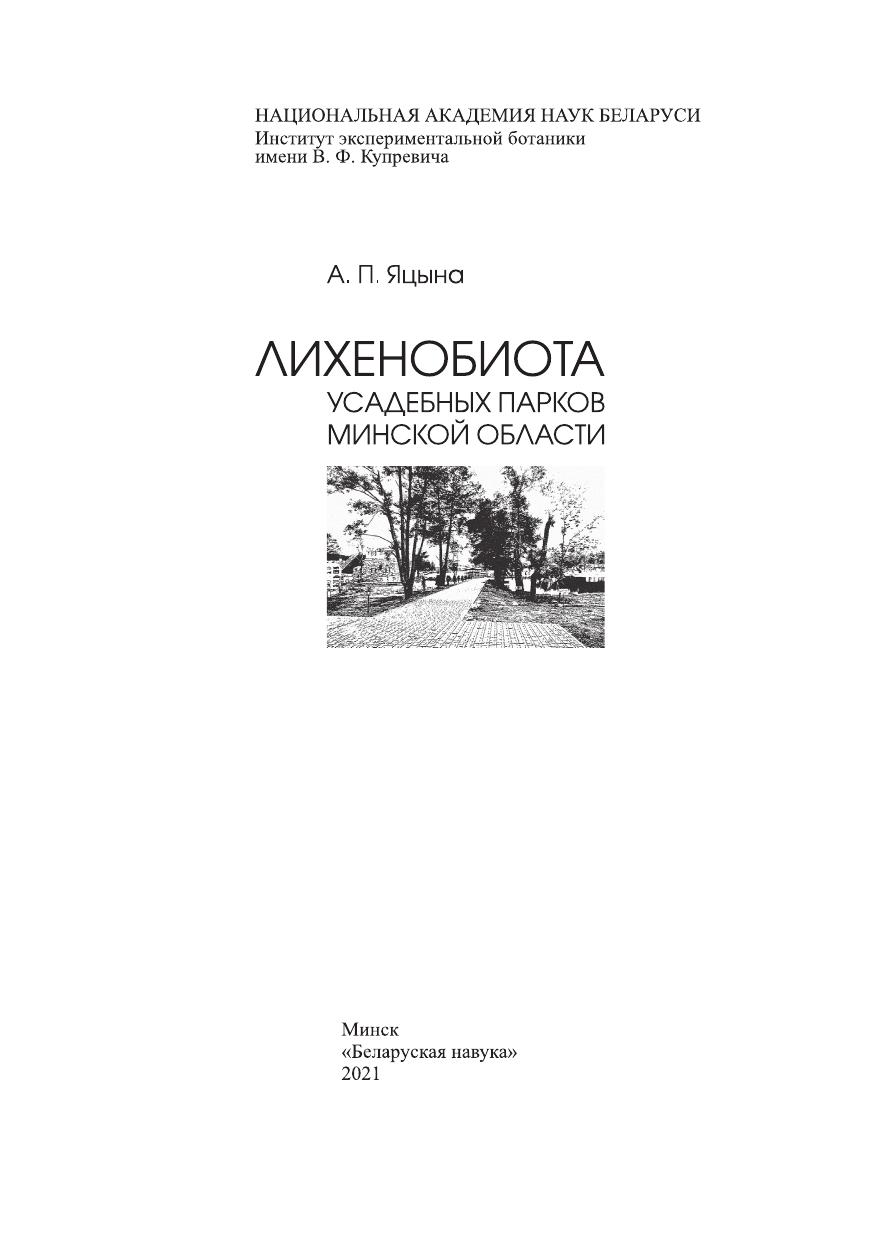 В монографии представлены результаты многолетних исследований лихенобиоты 30 усадебных парков Минской области. Составлен аннотированный список, проведен таксономический, эколого-субстратный и созологический анализ изученной лихенобиоты. Выявлены охраняемые, специализированные и редкие виды лишайников усадебных парков Минской области.