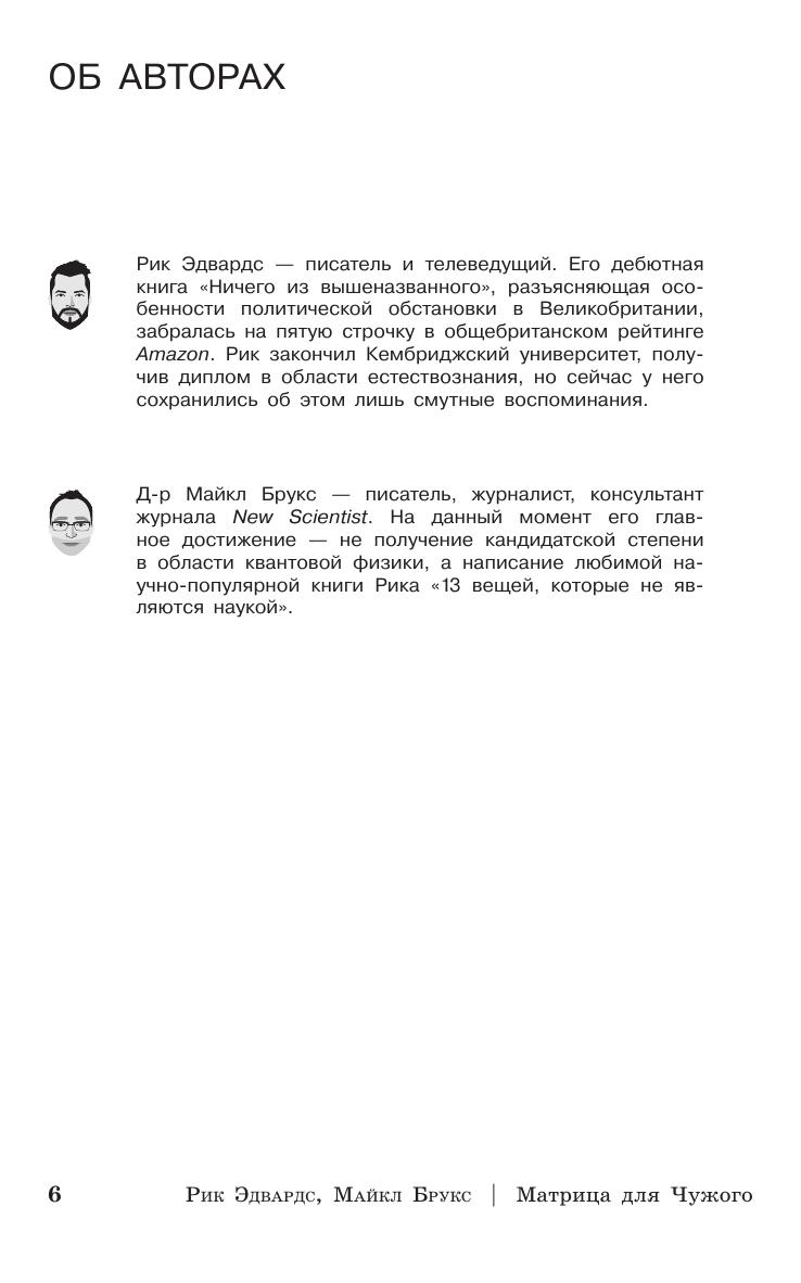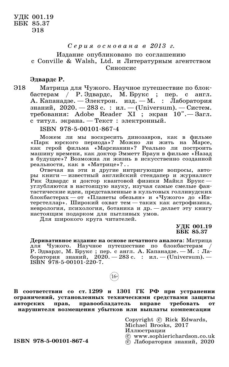 Можем ли мы воскресить динозавров, как в фильме «Парк юрского периода»? Можно ли жить на Марсе, как герой фильма «Марсианин»? Реально ли построить машину времени, как доктор Эмметт Браун в фильме «Назад в будущее»? Возможна ли жизнь в искусственно созданной реальности, как в «Матрице»? . . Отвечая на эти и другие интригующие вопросы, авторы книги—известный английский стендапер и журналист Рик Эдвардс и доктор квантовой физики Майкл Брукс—углубляются в настоящую науку, изучая самые смелые фантастические идеи, представленные в культовых голливудских блокбастерах—от «Планеты обезьян» и «Чужого» до «Интерстеллар». Широкий охват тем—таких как астрофизика, неврология, психология, ботаника и др.—делает эту книгу настоящим подарком для пытливых умов. Для широкого круга читателей.