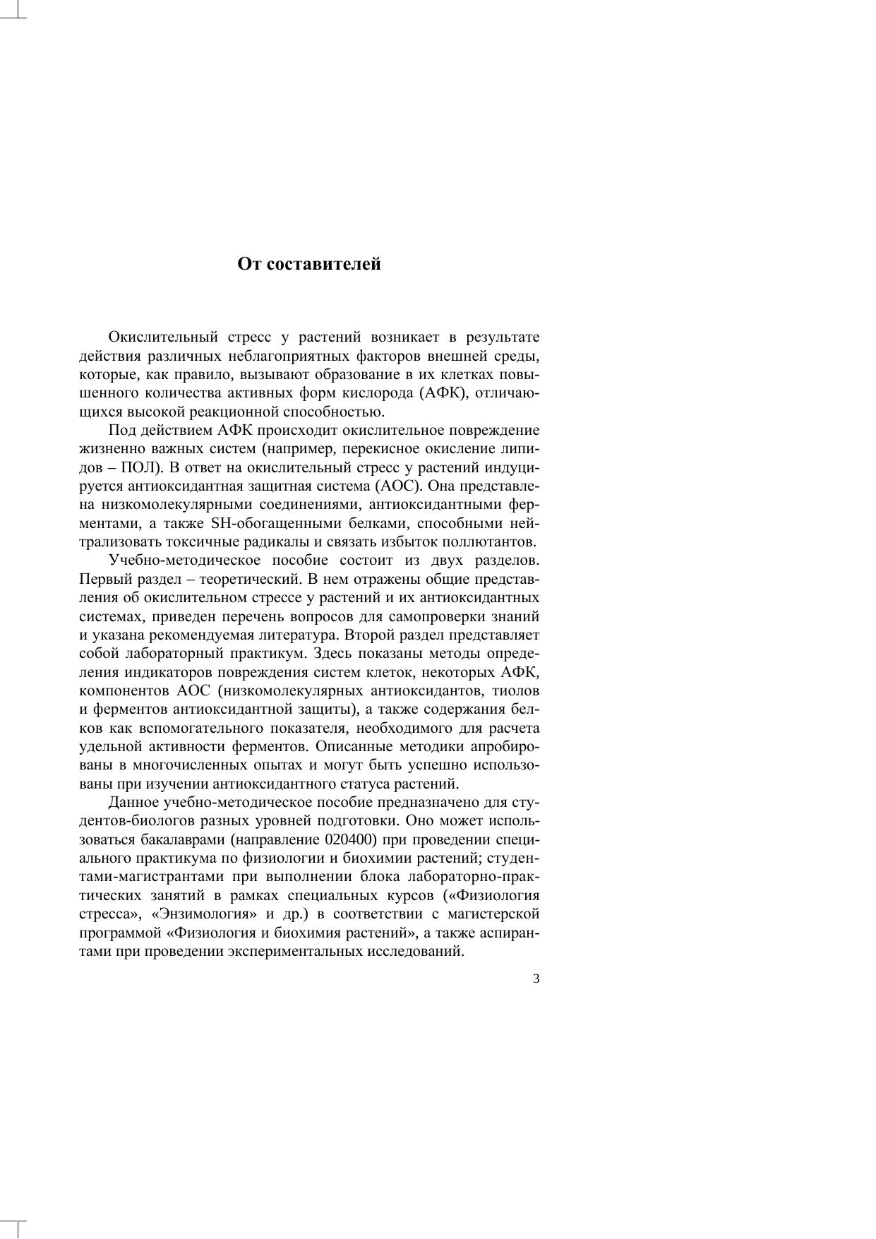 В учебно-методическом пособии отражены общие представления об окислительном стрессе у растений и антиоксидантных системах, представлены методики определения индикаторов окислительного стресса, низкомолекулярных антиоксидантов, тиолов, активности ферментов антиоксидантной защиты и содержания белков. Пособие предназначено для студентов биологического факультета разных уровней подготовки (бакалавров, специалистов, магистров) и может быть использовано аспирантами.