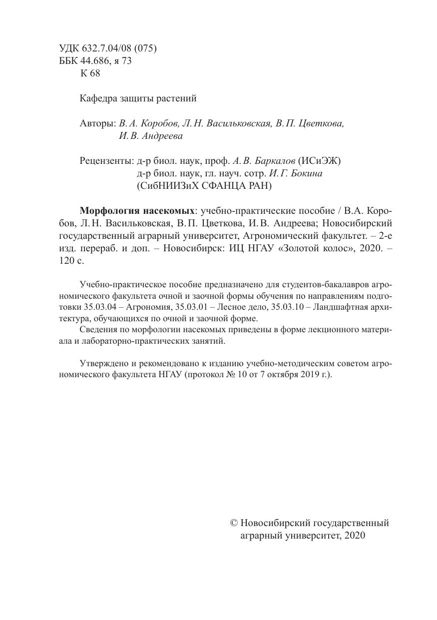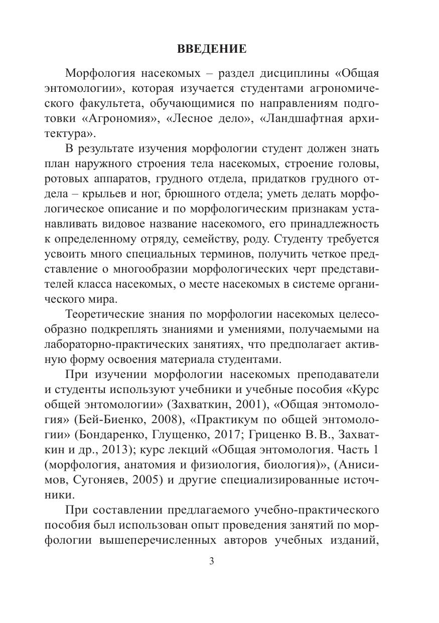 Учебно-практическое пособие предназначено для студентов-бакалавров агрономического факультета очной и заочной формы обучения по направлениям подготовки 35.03.04 – Агрономия, 35.03.01 – Лесное дело, 35.03.10 – Ландшафтная архитектура, обучающихся по очной и заочной форме. Сведения по морфологии насекомых приведены в форме лекционного материала и лабораторно-практических занятий.