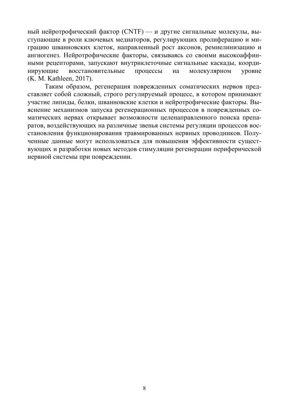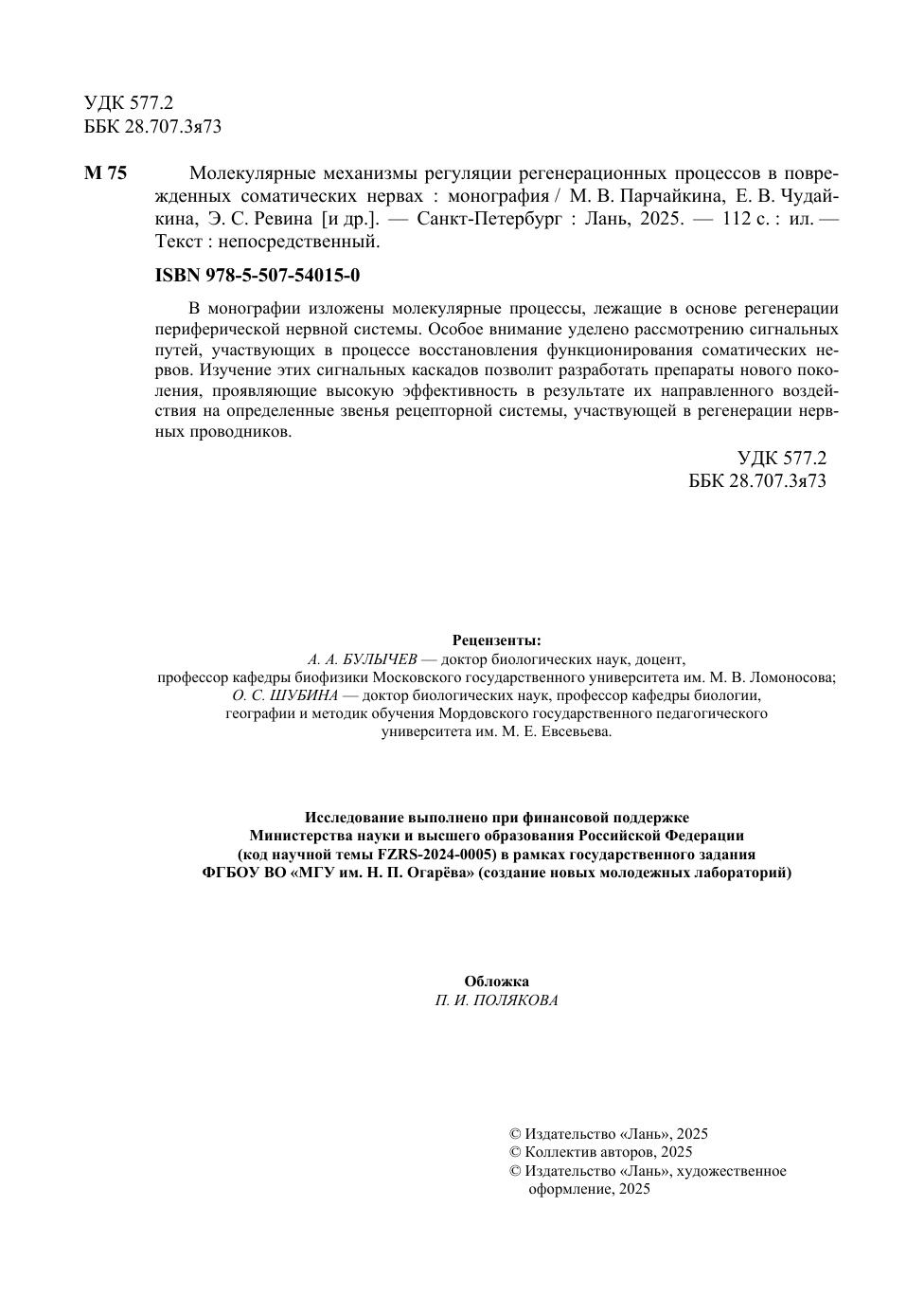 В монографии изложены молекулярные процессы, лежащие в основе регенерации периферической нервной системы. Особое внимание уделено рассмотрению сигнальных путей, участвующих в процессе восстановления функционирования соматических нервов. Изучение этих сигнальных каскадов позволит разработать препараты нового поколения, проявляющие высокую эффективность в результате их направленного воздействия на определенные звенья рецепторной системы, участвующей в регенерации нервных проводников.