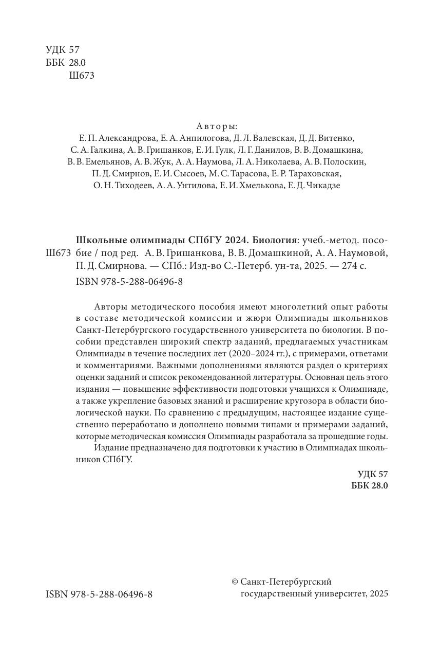 Авторы методического пособия имеют многолетний опыт работы в составе методической комиссии и жюри Олимпиады школьников Санкт-Петербургского государственного университета по биологии. В пособии представлен широкий спектр заданий, предлагаемых участникам Олимпиады в течение последних лет (2020-2024 гг.) , с примерами, ответами и комментариями. Важными дополнениями являются раздел о критериях оценки заданий и список рекомендованной литературы. Основная цель этого издания - повышение эффективности подготовки учащихся к Олимпиаде, а также укрепление базовых знаний и расширение кругозора в области биологической науки. По сравнению с предыдущим, настоящее издание существенно переработано и дополнено новыми типами и примерами заданий, которые методическая комиссия Олимпиады разработала за прошедшие годы. Издание предназначено для подготовки к участию в Олимпиадах школьников СПбГУ.