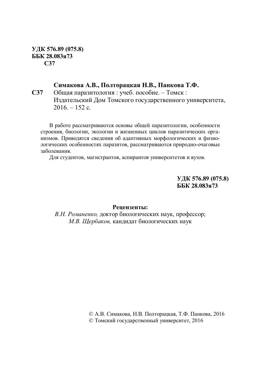 В работе рассматриваются основы общей паразитологии, особенности строения, биологии, экологии и жизненных циклов паразитических организмов. Приводятся сведения об адаптивных морфологических и физиологических особенностях паразитов, рассматриваются природно-очаговые заболевания. Для студентов, магистрантов, аспирантов университетов и вузов.