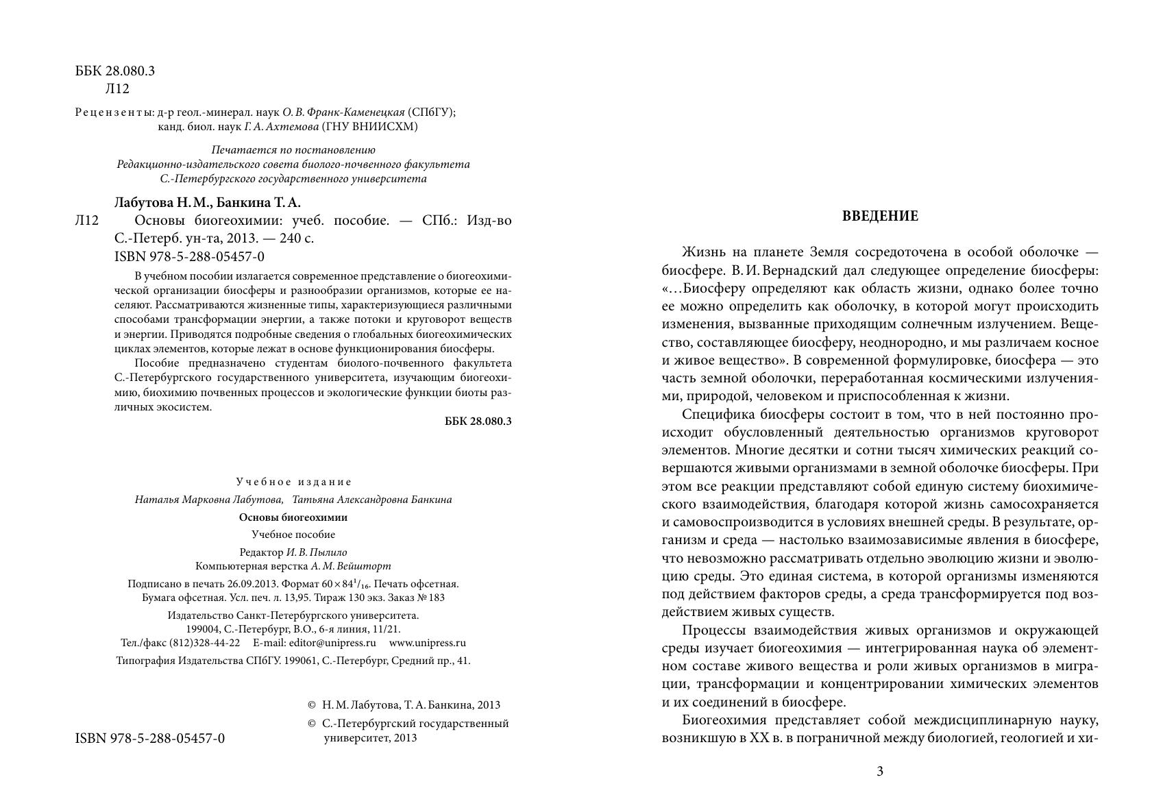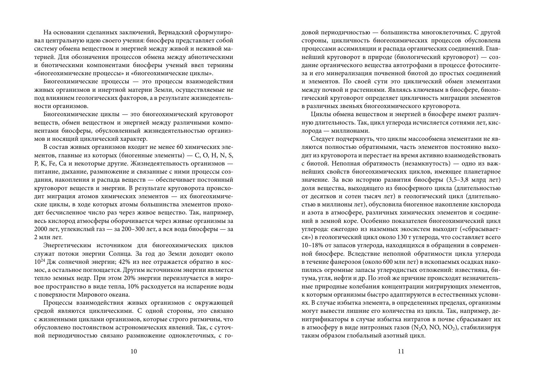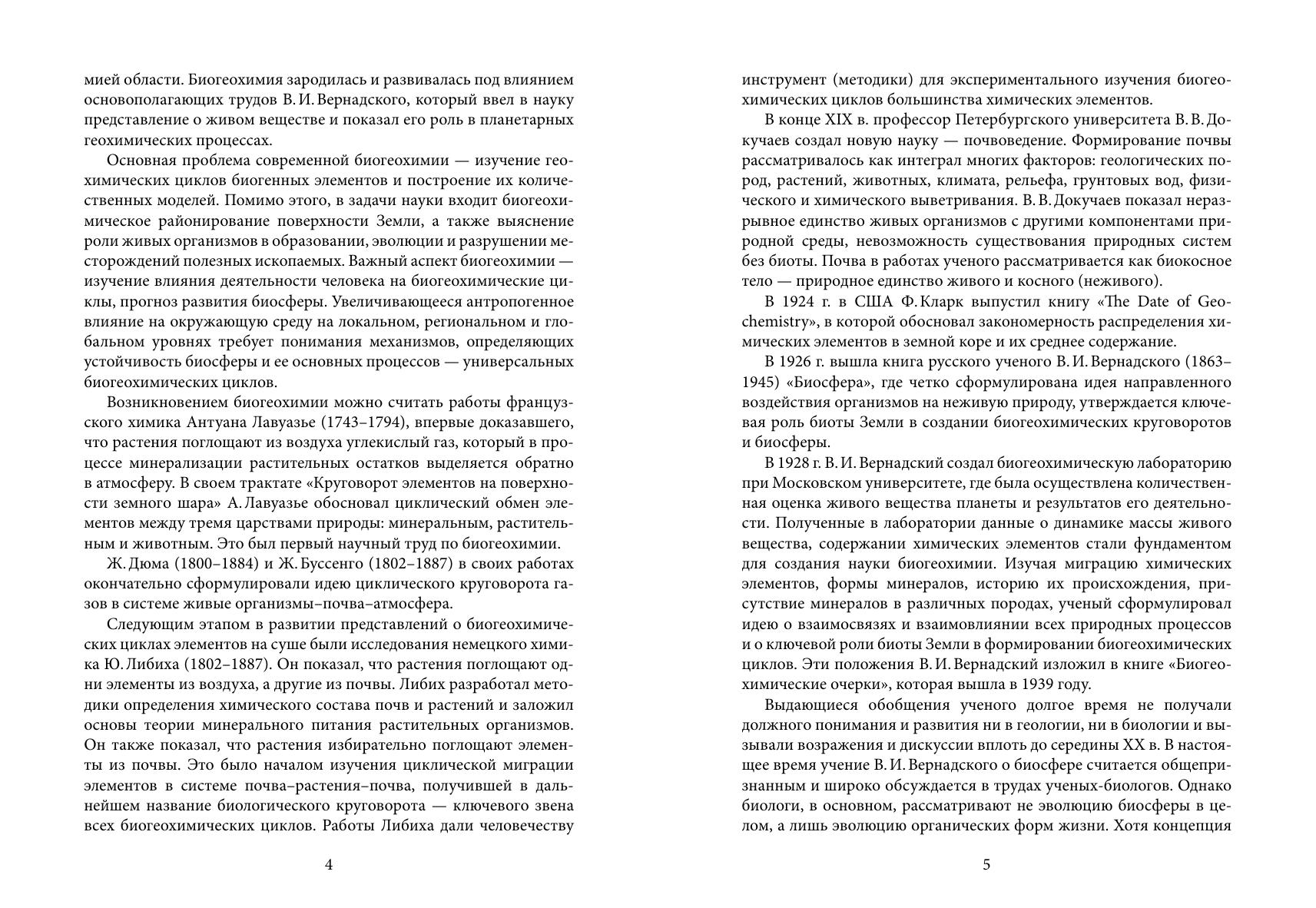 В учебном пособии излагается современное представление о биогеохимической организации биосферы и разнообразии организмов, которые ее населяют. Рассматриваются жизненные типы, характеризующиеся различными способами трансформации энергии, а также потоки и круговорот веществ и энергии. Приводятся подробные сведения о глобальных биогеохимических циклах элементов, которые лежат в основе функционирования биосферы. Пособие предназначено студентам биолого-почвенного факультета С.-Петербургского государственного университета, изучающим биогеохимию, биохимию почвенных процессов и экологические функции биоты различных экосистем.