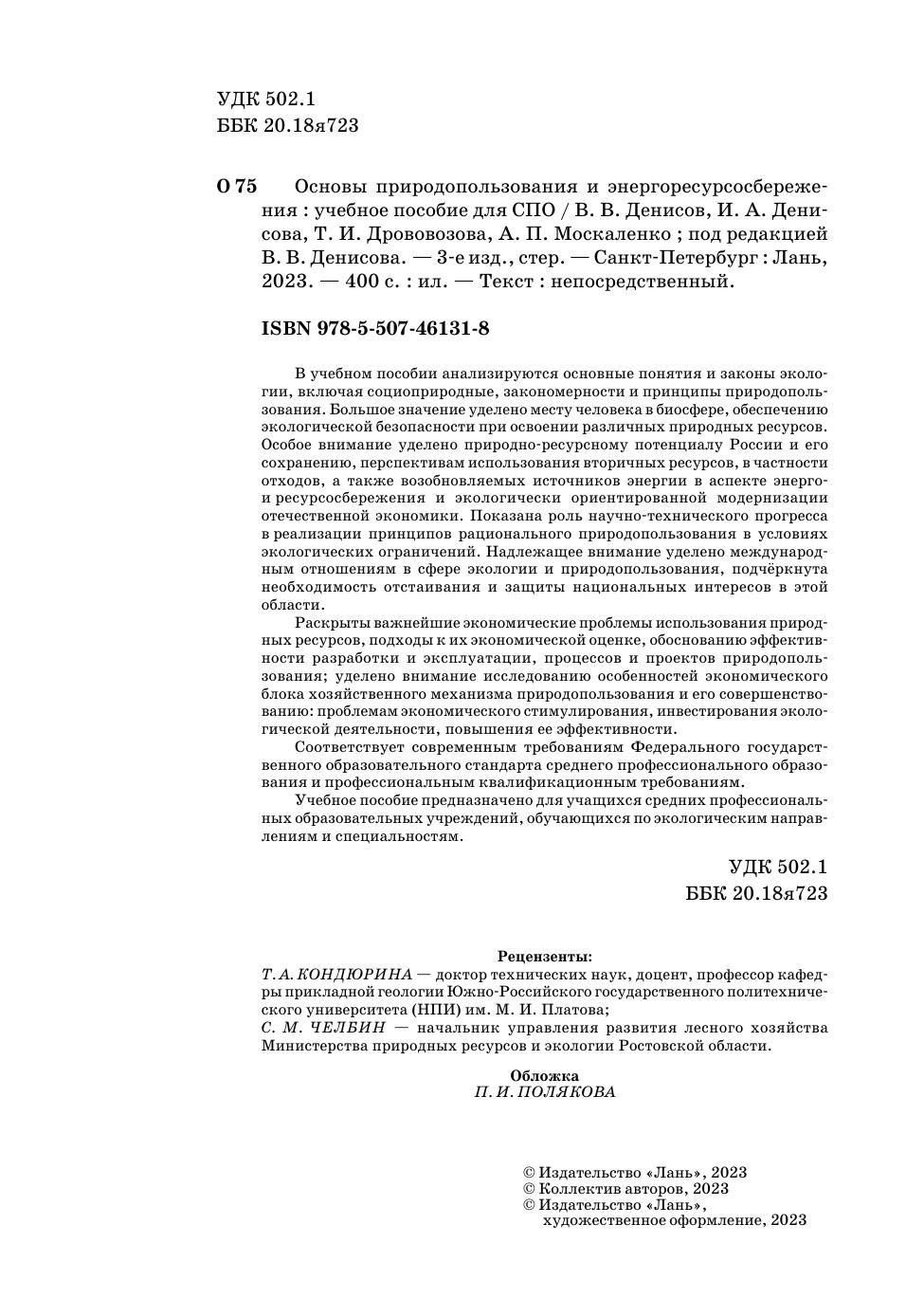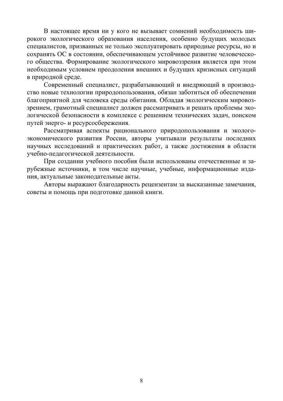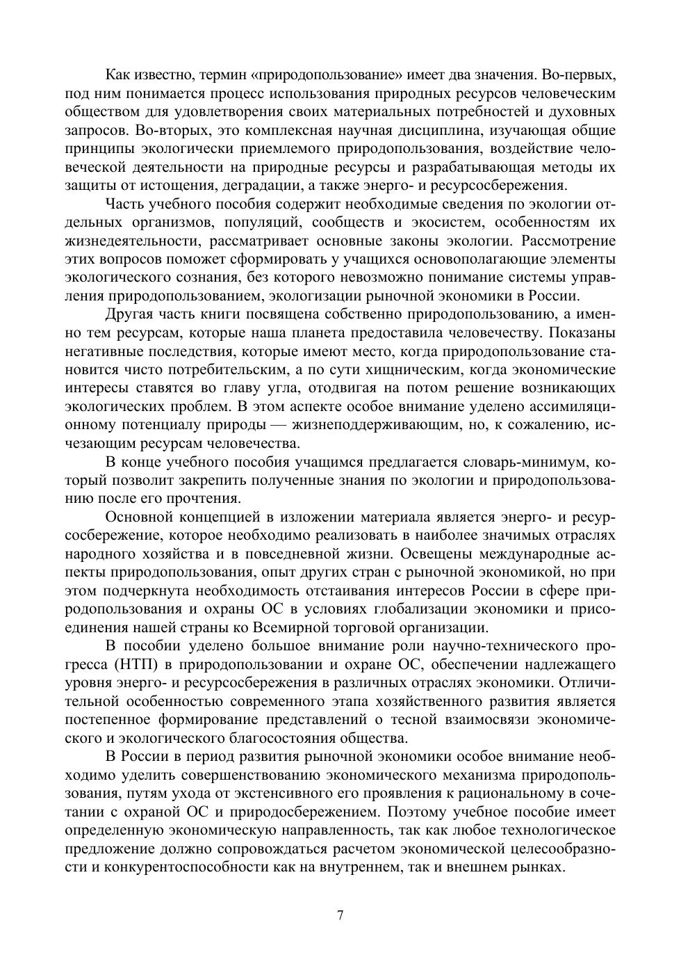 В учебном пособии анализируются основные понятия и законы экологии, включая социоприродные, закономерности и принципы природопользования. Большое значение уделено месту человека в биосфере, обеспечению экологической безопасности при освоении различных природных ресурсов. Особое внимание уделено природно-ресурсному потенциалу России и его сохранению, перспективам использования вторичных ресурсов, в частности отходов, а также возобновляемых источников энергии в аспекте энерго- и ресурсосбережения и экологически ориентированной модернизации отечественной экономики. Показана роль научно-технического прогресса в реализации принципов рационального природопользования в условиях экологических ограничений. Надлежащее внимание уделено международным отношениям в сфере экологии и природопользования, подчёркнута необходимость отстаивания и защиты национальных интересов в этой области. Раскрыты важнейшие экономические проблемы использования природных ресурсов, подходы к их экономической оценке, обоснованию эффективности разработки и эксплуатации, процессов и проектов природопользования, уделено внимание исследованию особенностей экономического блока хозяйственного механизма природопользования и его совершенствованию: проблемам экономического стимулирования, инвестирования экологической деятельности, повышения ее эффективности. Соответствует современным требованиям Федерального государственного образовательного стандарта среднего профессионального образования и профессиональным квалификационным требованиям. Учебное пособие предназначено для учащихся средних профессиональных образовательных учреждений, обучающихся по экологическим направлениям и специальностям.