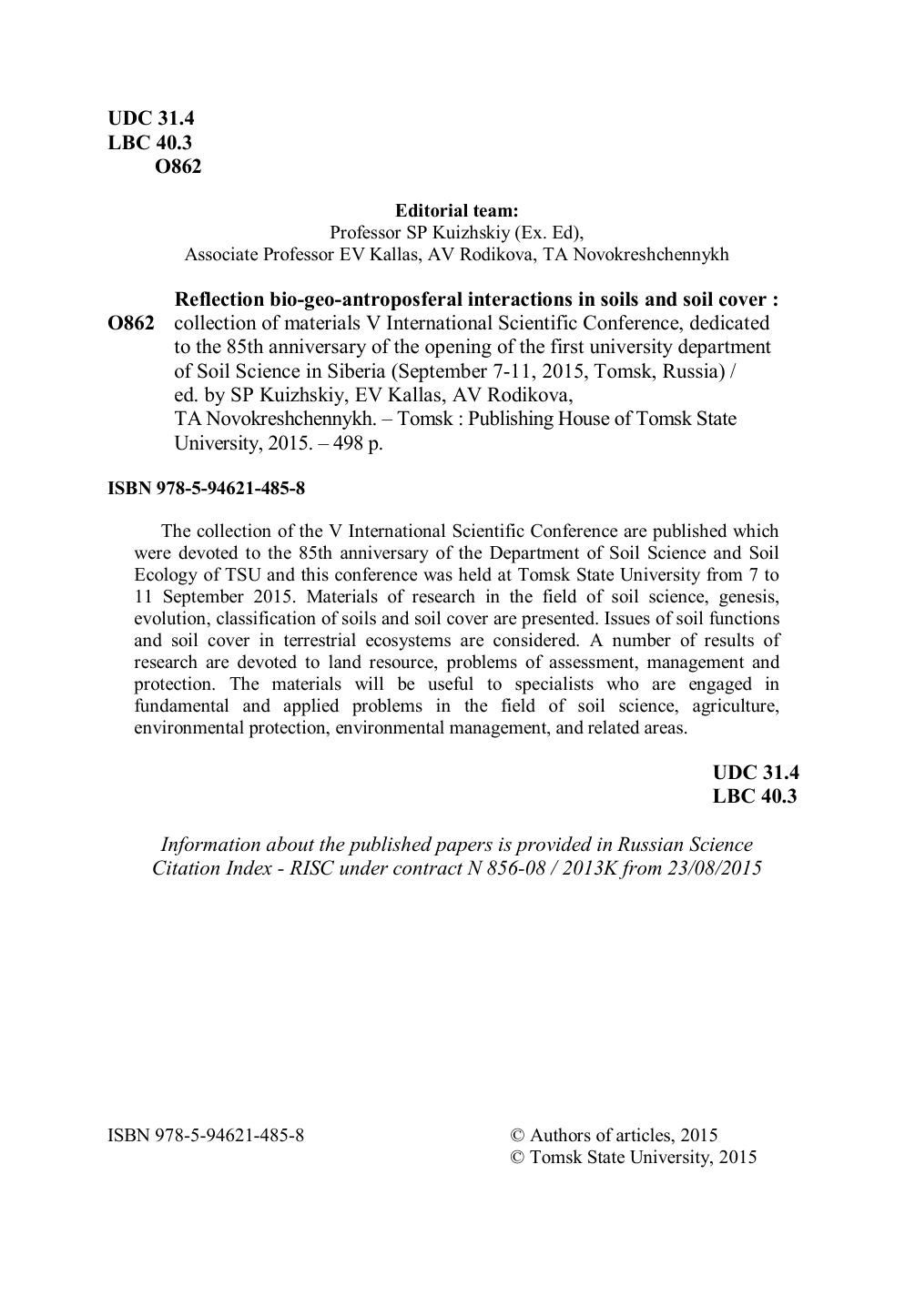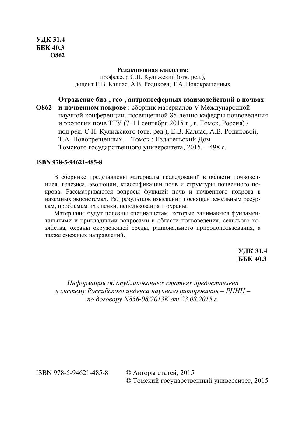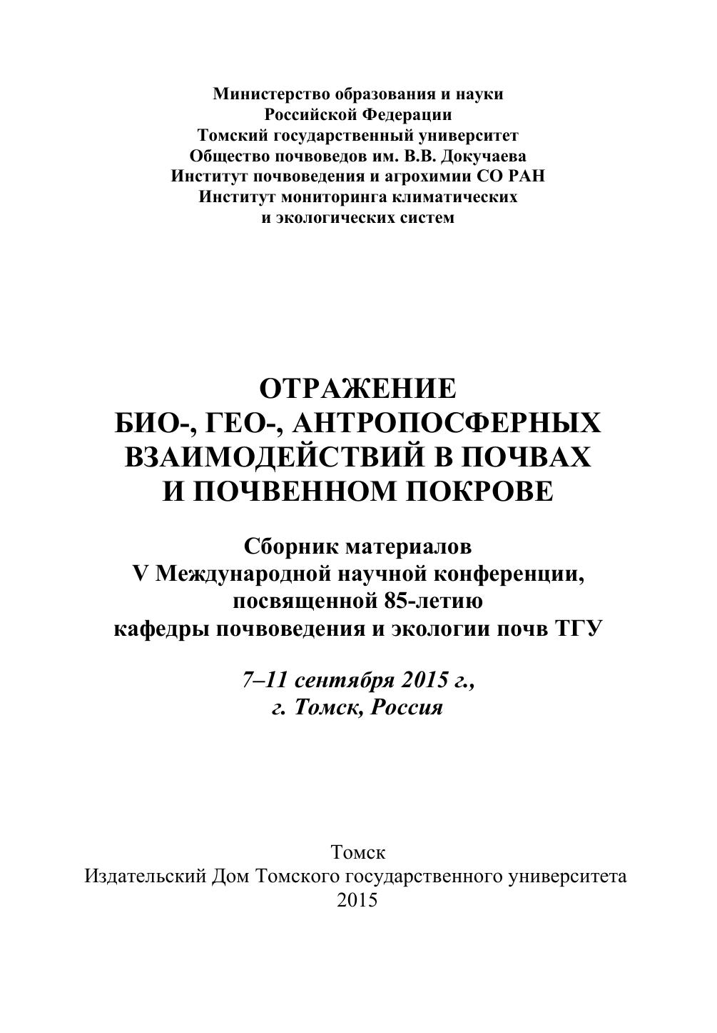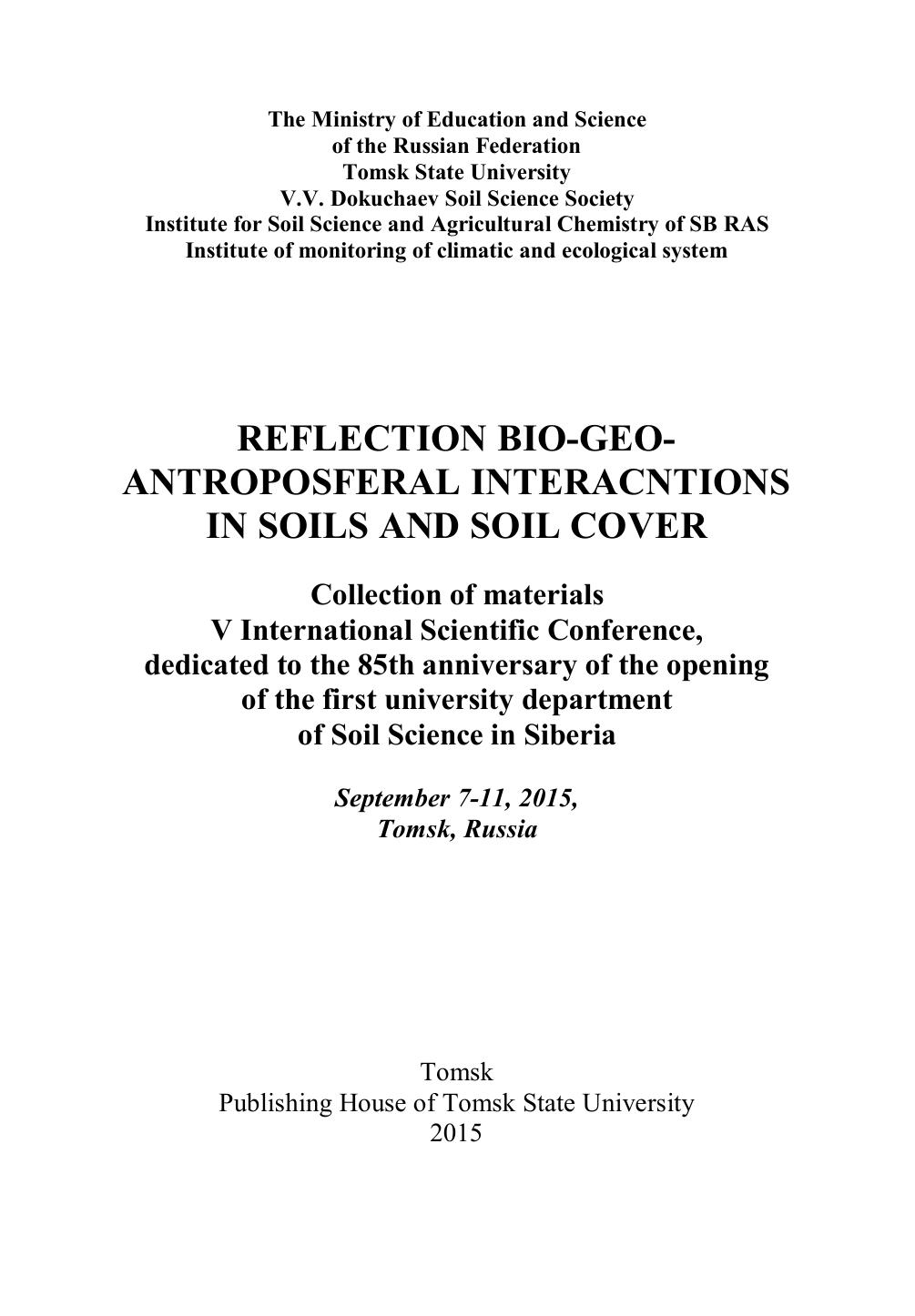 Отражение био-, гео-, антропосферных взаимодействий в почвах и почвенном покрове: сборник материалов V Международной научной конференции, посвященной 85-летию кафедры почвоведения и экологии почв ТГУ (7–11 сентября 2015 г., г. Томск, Россия)