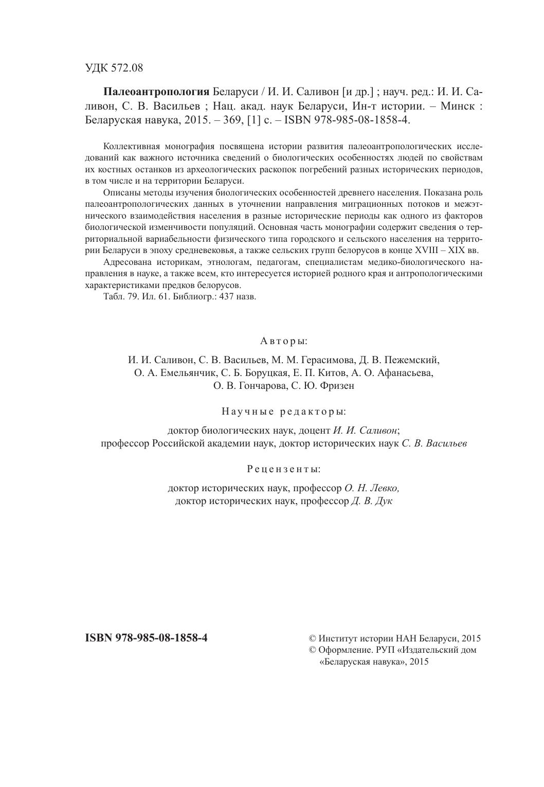 Коллективная монография посвящена истории развития палеоантропологических исследований как важного источника сведений о биологических особенностях людей по свойствам их костных останков из археологических раскопок погребений разных исторических периодов, в том числе и на территории Беларуси. Описаны методы изучения биологических особенностей древнего населения. Показана роль палеоантропологических данных в уточнении направления миграционных потоков и межэтнического взаимодействия населения в разные исторические периоды как одного из факторов биологической изменчивости популяций. Основная часть монографии содержит сведения о территориальной вариабельности физического типа городского и сельского населения на территории Беларуси в эпоху средневековья, а также сельских групп белорусов в конце XVIII – XIX вв. Адресована историкам, этнологам, педагогам, специалистам медико-биологического направления в науке, а также всем, кто интересуется историей родного края и антропологическими характеристиками предков белорусов.