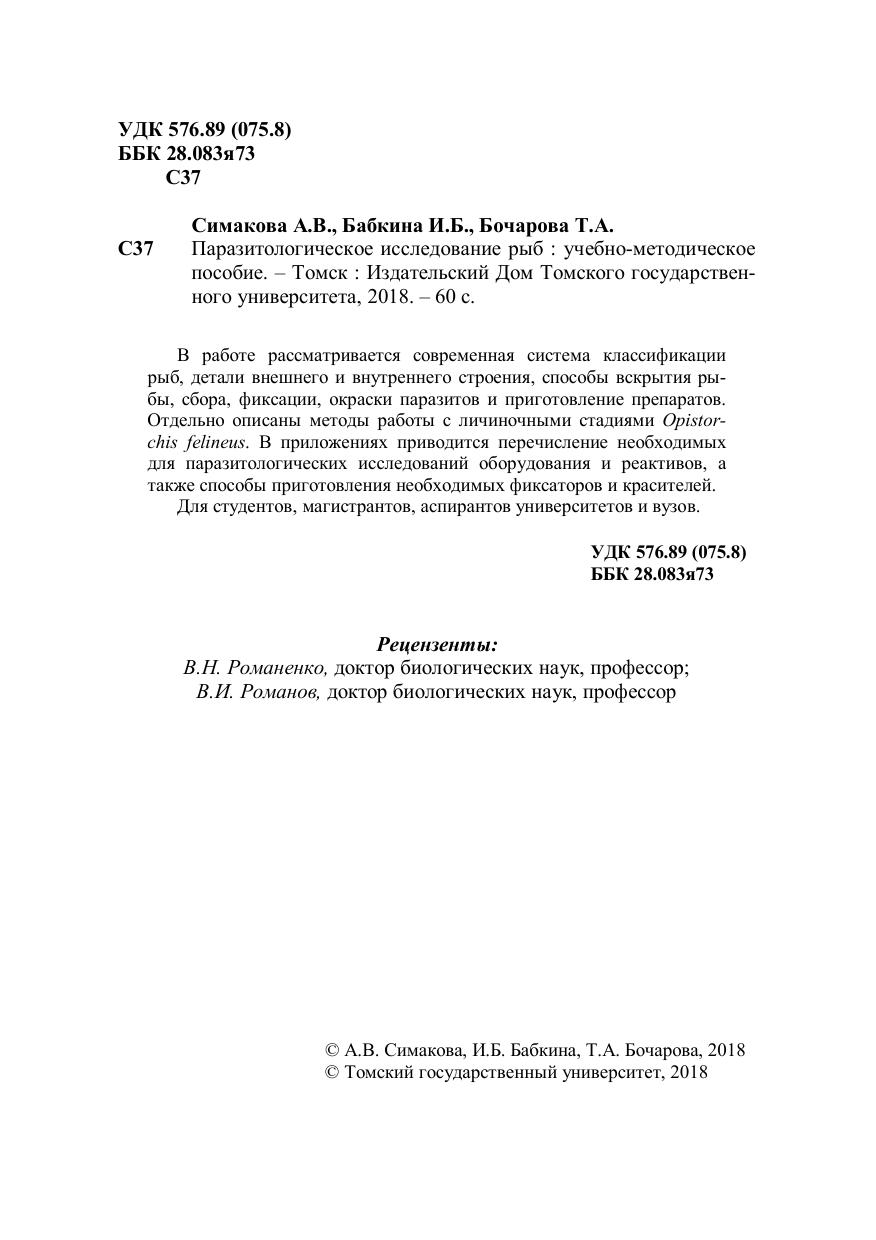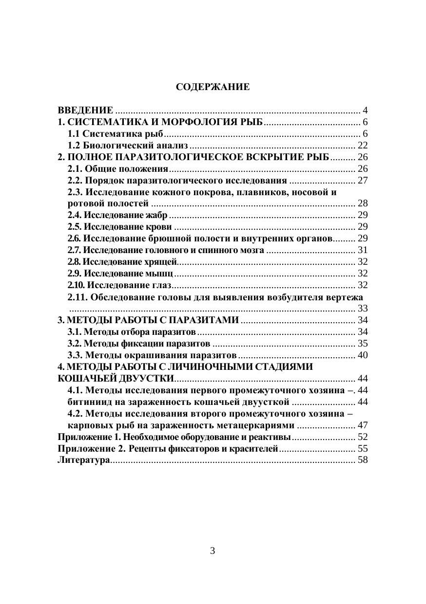 В работе рассматривается современная система классификации рыб, детали внешнего и внутреннего строения, способы вскрытия рыбы, сбора, фиксации, окраски паразитов и приготовление препаратов. Отдельно описаны методы работы с личиночными стадиями Opistorchis felineus. В приложениях приводится перечисление необходимых для паразитологических исследований оборудования и реактивов, а также способы приготовления необходимых фиксаторов и красителей. Для студентов, магистрантов, аспирантов университетов и вузов.
