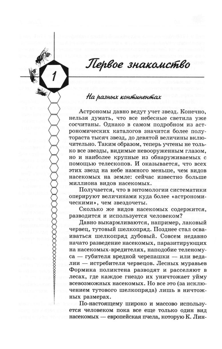 Каждый, кто впервые знакомится с пчелами, попадает в поразительно интересный, диковинный, можно сказать, фантастический мир, великолепно организованный и бесконечно гибкий, простой в своем естественном совершенстве и в то же время беспредельно сложный. Читатель заглянет в их улей декабрьским днем, когда зима поворачивает на мороз, а солнце на лето и в сонном клубе пробуждается жизнь пчелиной семьи. Он увидит их в весенний полдень, когда сады одеты белой пеной и пронизаны гудением сборщиц, опыляющих цветы, и глубокой осенью, когда поля уже давно сжаты, а пчелиные гнезда убраны.