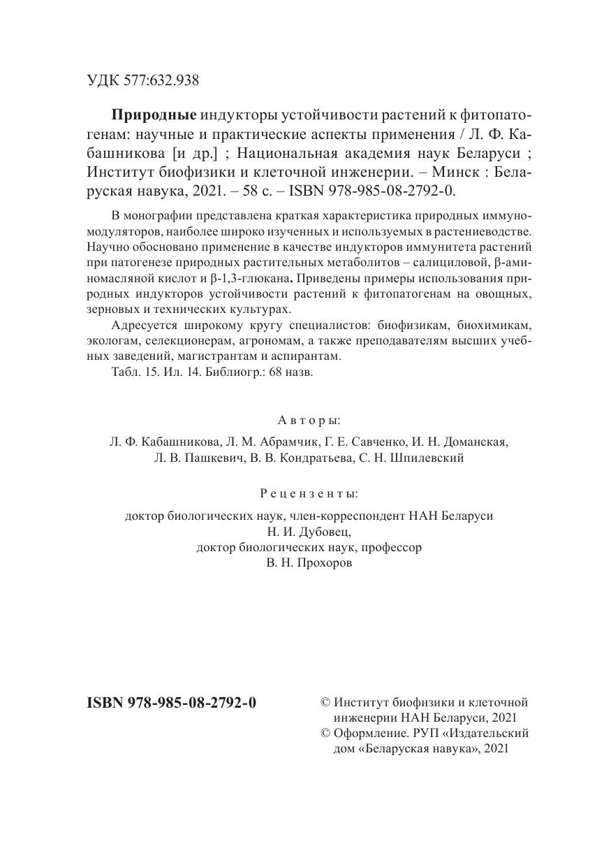 В монографии представлена краткая характеристика природных иммуномодуляторов, наиболее широко изученных и используемых в растениеводстве. Научно обосновано применение в качестве индукторов иммунитета растений при патогенезе природных растительных метаболитов – салициловой, -аминомасляной кислот и -1,3-глюкана. Приведены примеры использования природных индукторов устойчивости растений к фитопатогенам на овощных, зерновых и технических культурах.