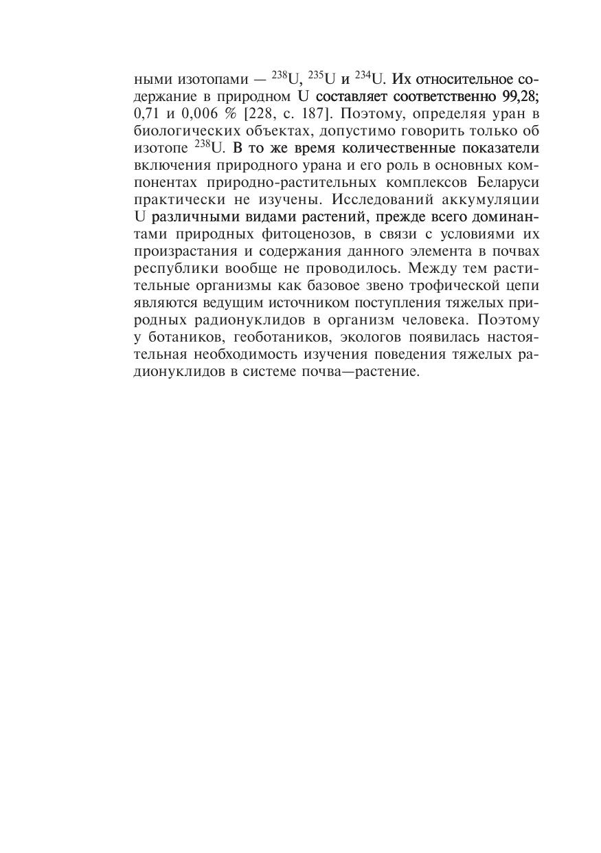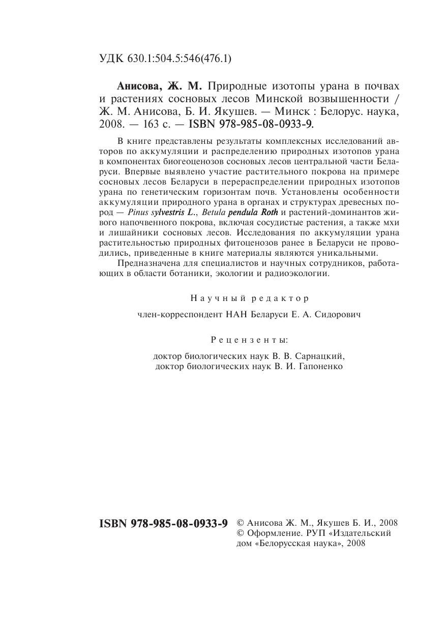 В книге представлены результаты комплексных исследований авторов по аккумуляции и распределению природных изотопов урана в компонентах биогеоценозов сосновых лесов центральной части Беларуси. Впервые выявлено участие растительного покрова на примере сосновых лесов Беларуси в перераспределении природных изотопов урана по генетическим горизонтам почв. Установлены особенности аккумуляции природного урана в органах и структурах древесных пород — Pinus sis, Bua nua и растенийдоминантов жи вого напочвенного покрова, включая сосудистые растения, а также мхи и лишайники сосновых лесов. Исследования по аккумуляции урана растительностью природных фитоценозов ранее в Беларуси не проводились, приведенные в книге материалы являются уникальными. Предназначена для специалистов и научных сотрудников, работающих в области ботаники, экологии и радиоэкологии.
