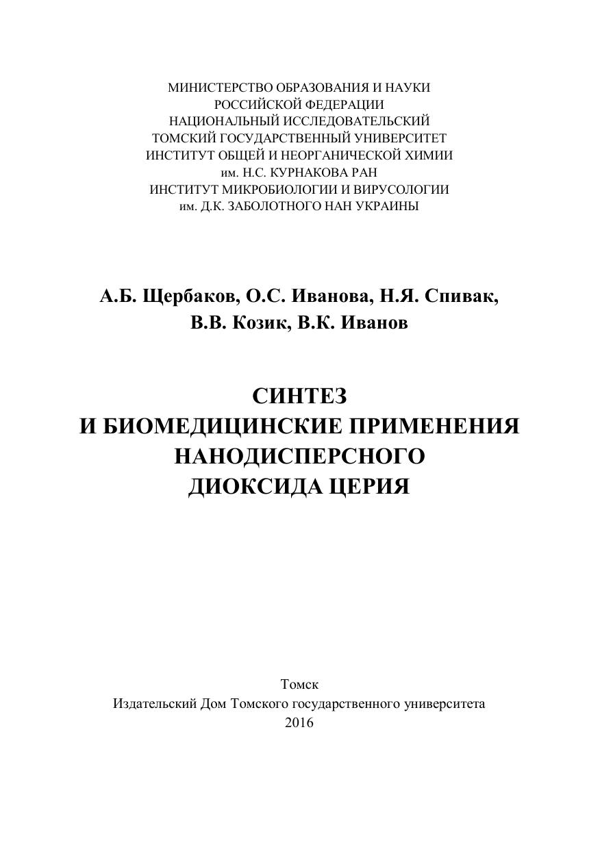 Монография посвящена обобщению результатов исследований в области направленного синтеза, физико-химических свойств и биологической активности нанодисперсного диоксида церия. Систематизированы результаты работ, выполненных с участием авторов монографии, а также критически проанализированы литературные данные, в первую очередь зарубежные. Рассмотрены вопросы формирования и роста наночастиц нанодисперсного диоксида церия, приведены сведения о физико-химических характеристиках, а также токсичности, механизме действия на живые системы и защите живых систем от окислительного стресса и электромагнитного излучения. Основное внимание сфокусировано на результатах биомедицинского применения нанодисперсного диоксида церия, полученных за последние 5–10 лет. Показаны перспективы использования нанодисперсного диоксида церия при терапии всевозможных заболеваний, в том числе онкологических и возрастных, влияние на продолжительность и качество жизни, антибактериальной и антивирусной активности и др. Для ученых, работающих в области неорганического материаловедения, медицины, биологии и нанобиотехнологии, а также аспирантов и студентов старших курсов. Монография подготовлена в рамках программы повышения конкурентоспособности Томского государственного университета