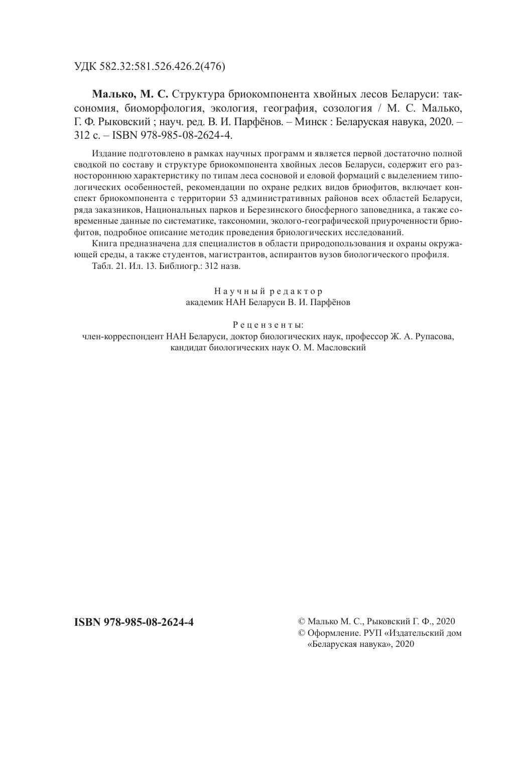 Издание подготовлено в рамках научных программ и является первой достаточно полной сводкой по составу и структуре бриокомпонента хвойных лесов Беларуси, содержит его разностороннюю характеристику по типам леса сосновой и еловой формаций с выделением типологических особенностей, рекомендации по охране редких видов бриофитов, включает конспект бриокомпонента с территории 53 административных районов всех областей Беларуси, ряда заказников, Национальных парков и Березинского биосферного заповедника, а также современные данные по систематике, таксономии, эколого-географической приуроченности бриофитов, подробное описание методик проведения бриологических исследований.