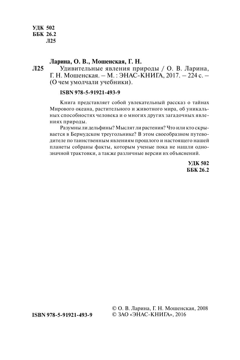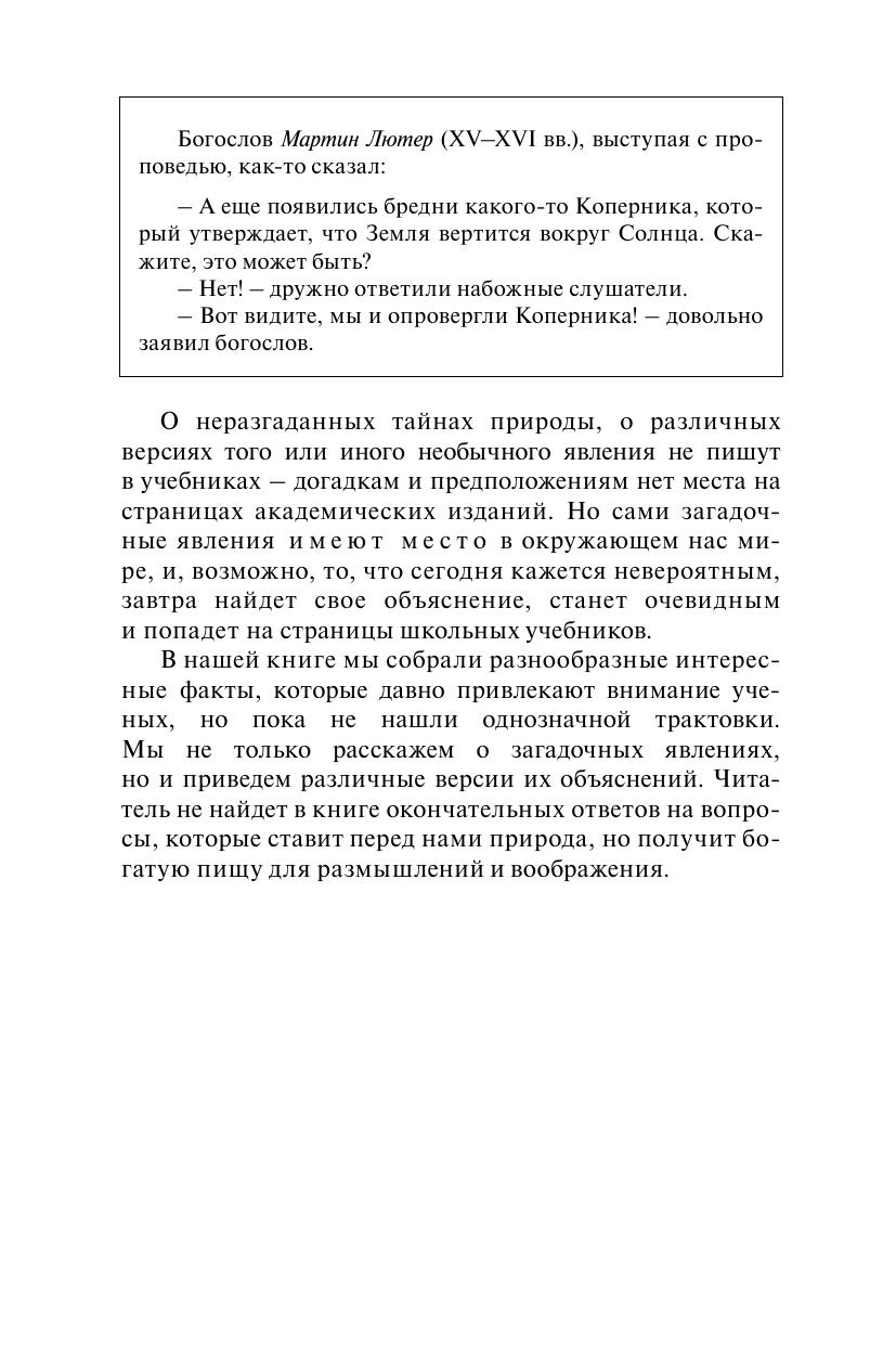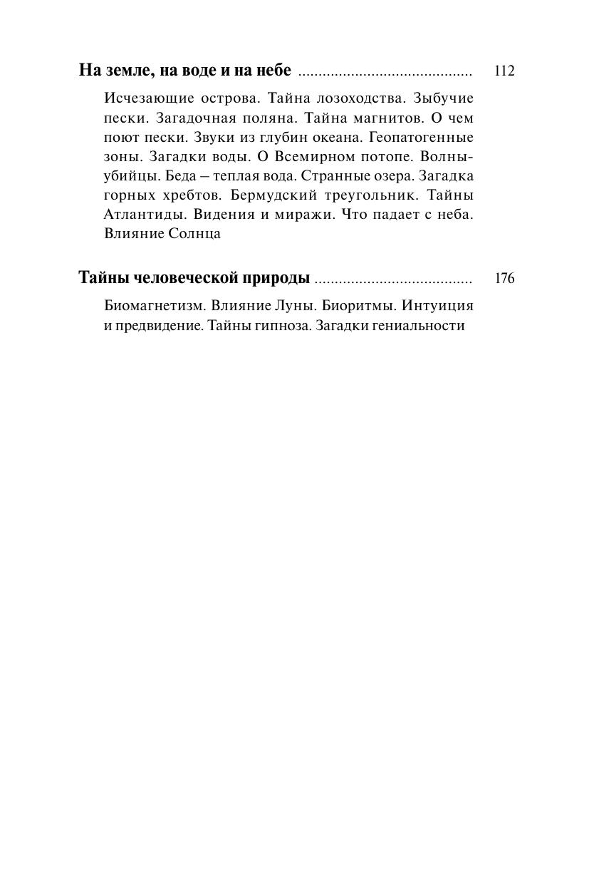 Книга представляет собой увлекательный рассказ о тайнах Мирового океана, растительного и животного мира, об уникальных способностях человека и о многих других загадочных явлениях природы. Разумны ли дельфины? Мыслят ли растения? Что или кто скрывается в Бермудском треугольнике? В этом своеобразном путеводителе по таинственным явлениям прошлого и настоящего нашей планеты собраны факты, которым ученые пока не нашли однозначной трактовки, а также различные версии их объяснений.