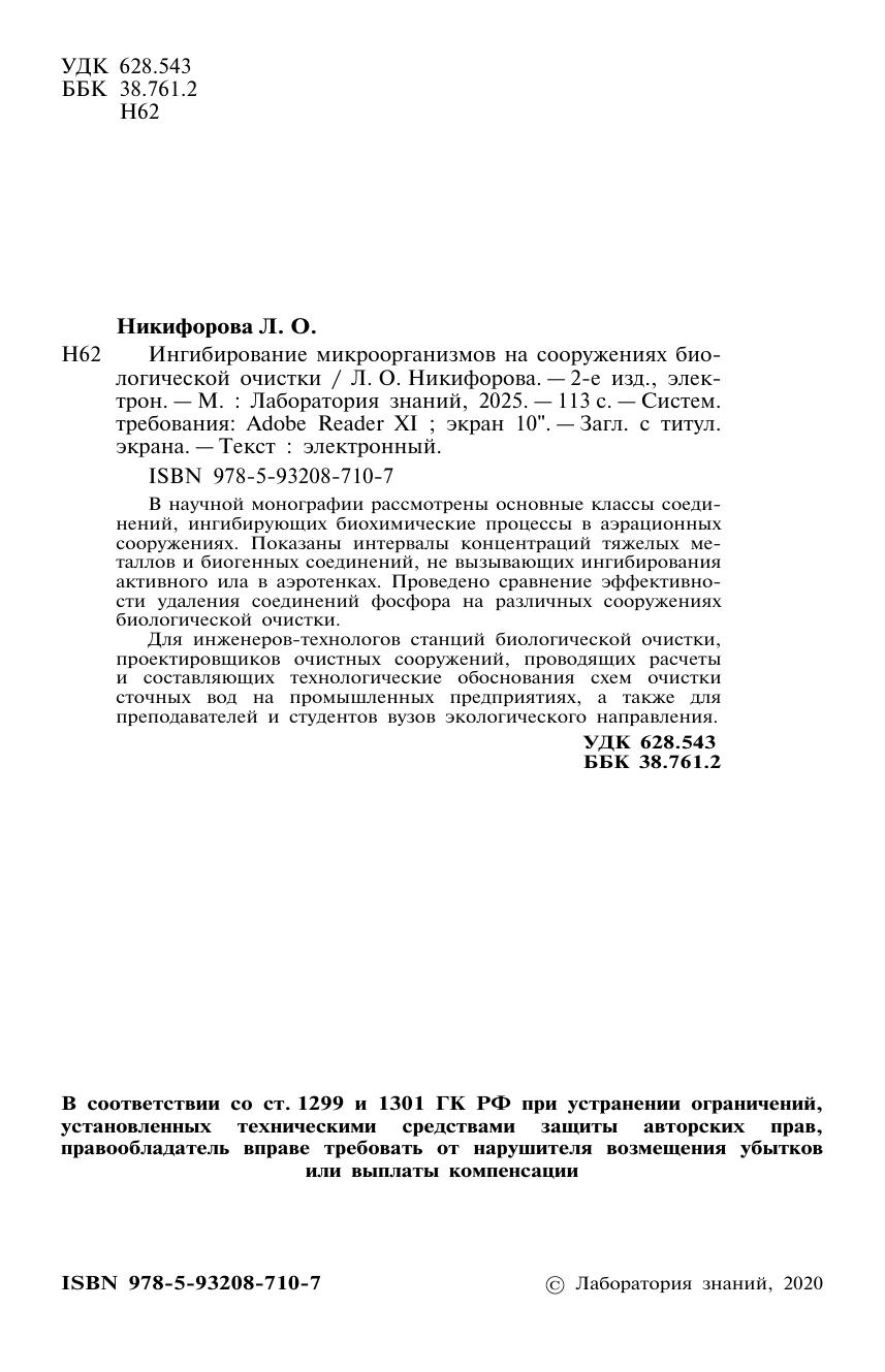 В научной монографии рассмотрены основные классы соединений, ингибирующих биохимические процессы в аэрационных сооружениях. Показаны интервалы концентраций тяжелых металлов и биогенных соединений, не вызывающих ингибирования активного ила в аэротенках. Проведено сравнение эффективности удаления соединений фосфора на различных сооружениях биологической очистки. Для инженеров-технологов станций биологической очистки, проектировщиков очистных сооружений, проводящих расчеты и составляющих технологические обоснования схем очистки сточных вод на промышленных предприятиях, а также для преподавателей и студентов вузов экологического направления.