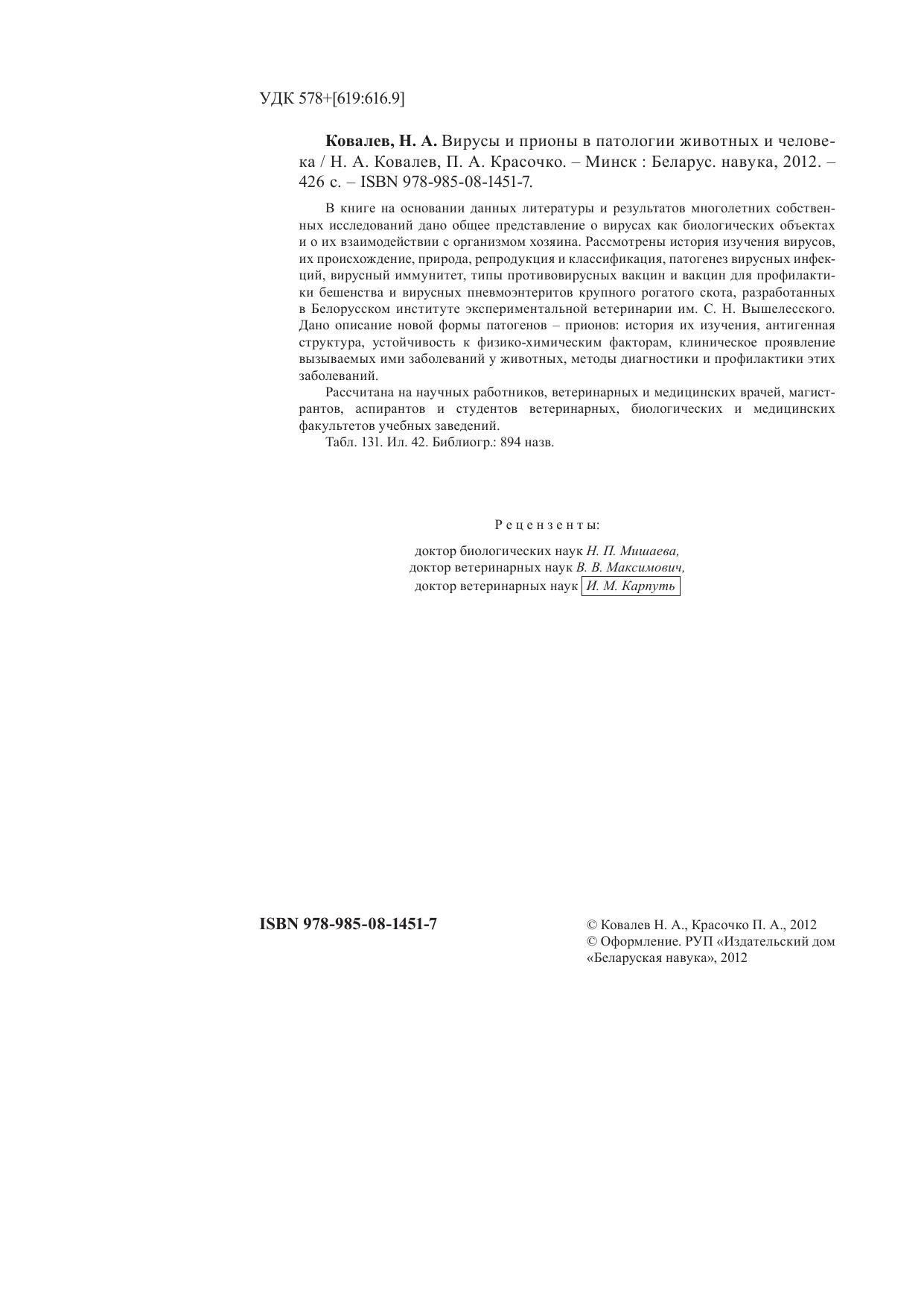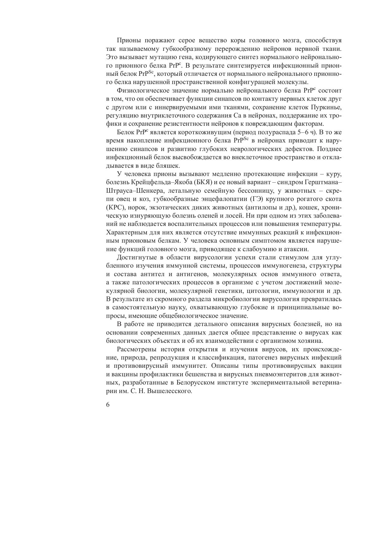 В книге на основании данных литературы и результатов многолетних собственных исследований дано общее представление о вирусах как биологических объектах и о их взаимодействии с организмом хозяина. Рассмотрены история изучения вирусов, их происхождение, природа, репродукция и классификация, патогенез вирусных инфекций, вирусный иммунитет, типы противовирусных вакцин и вакцин для профилактики бешенства и вирусных пневмоэнтеритов крупного рогатого скота, разработанных в Белорусском институте экспериментальной ветеринарии им. С. Н. Вышелесского. Дано описание новой формы патогенов – прионов: история их изучения, антигенная структура, устойчивость к физико-химическим факторам, клиническое проявление вызываемых ими заболеваний у животных, методы диагностики и профилактики этих заболеваний. Рассчитана на научных работников, ветеринарных и медицинских врачей, магистрантов, аспирантов и студентов ветеринарных, биологических и медицинских факультетов учебных заведений.